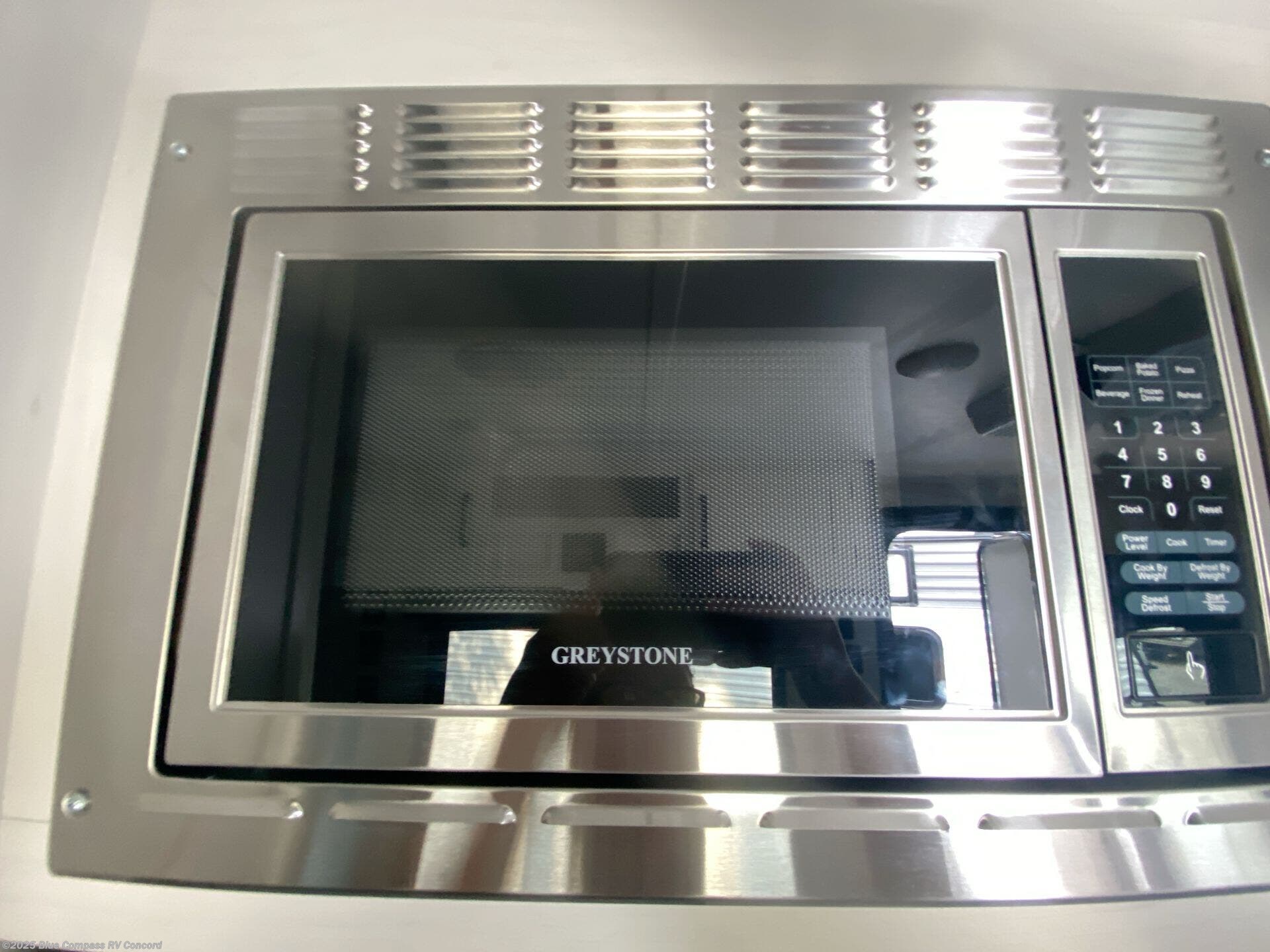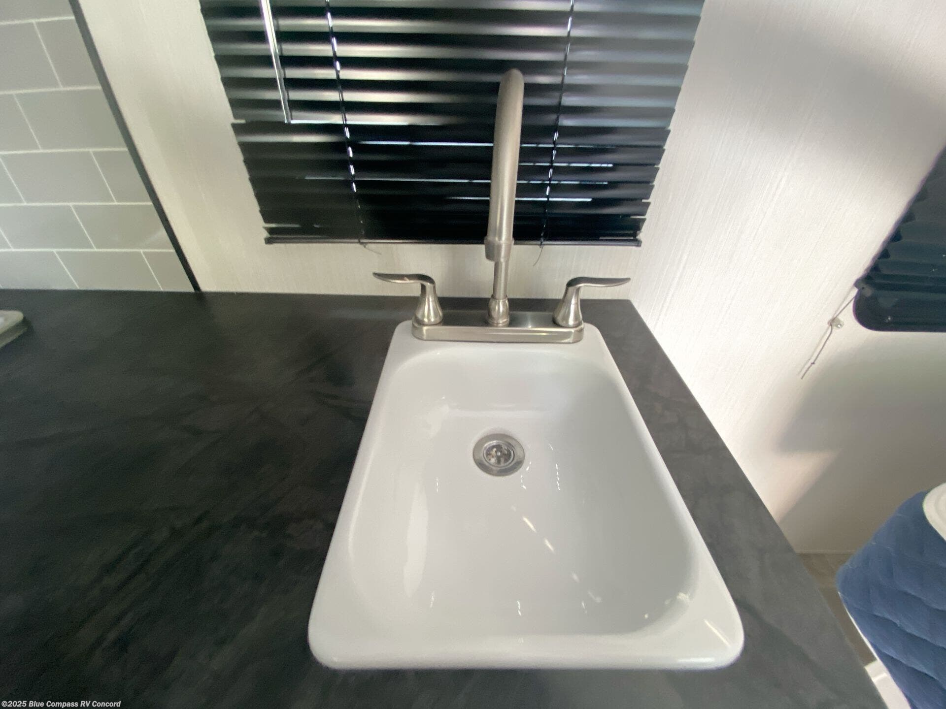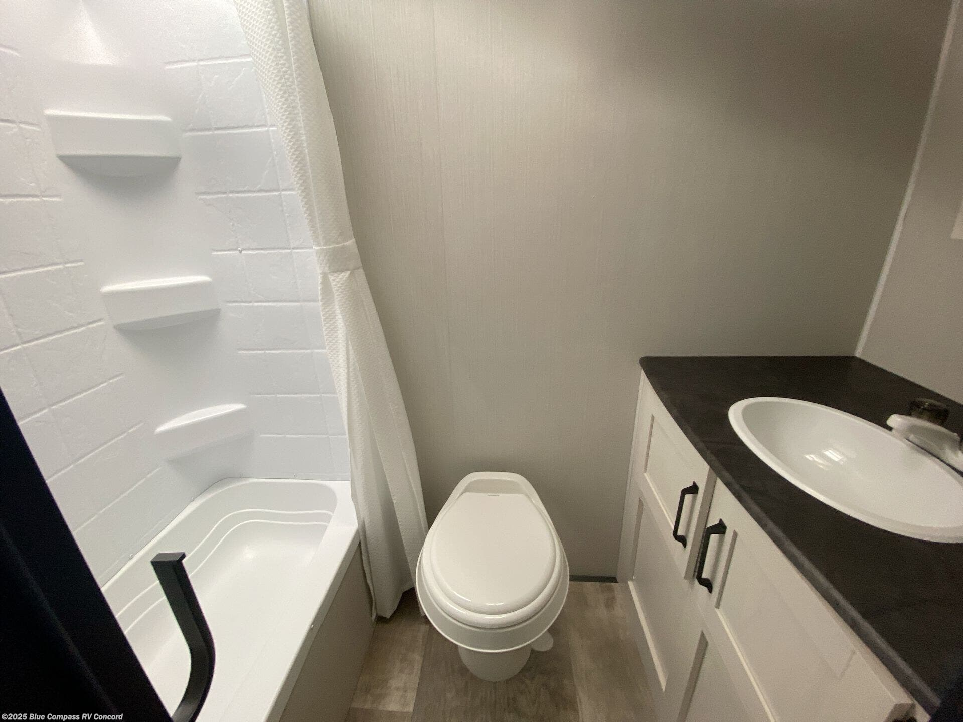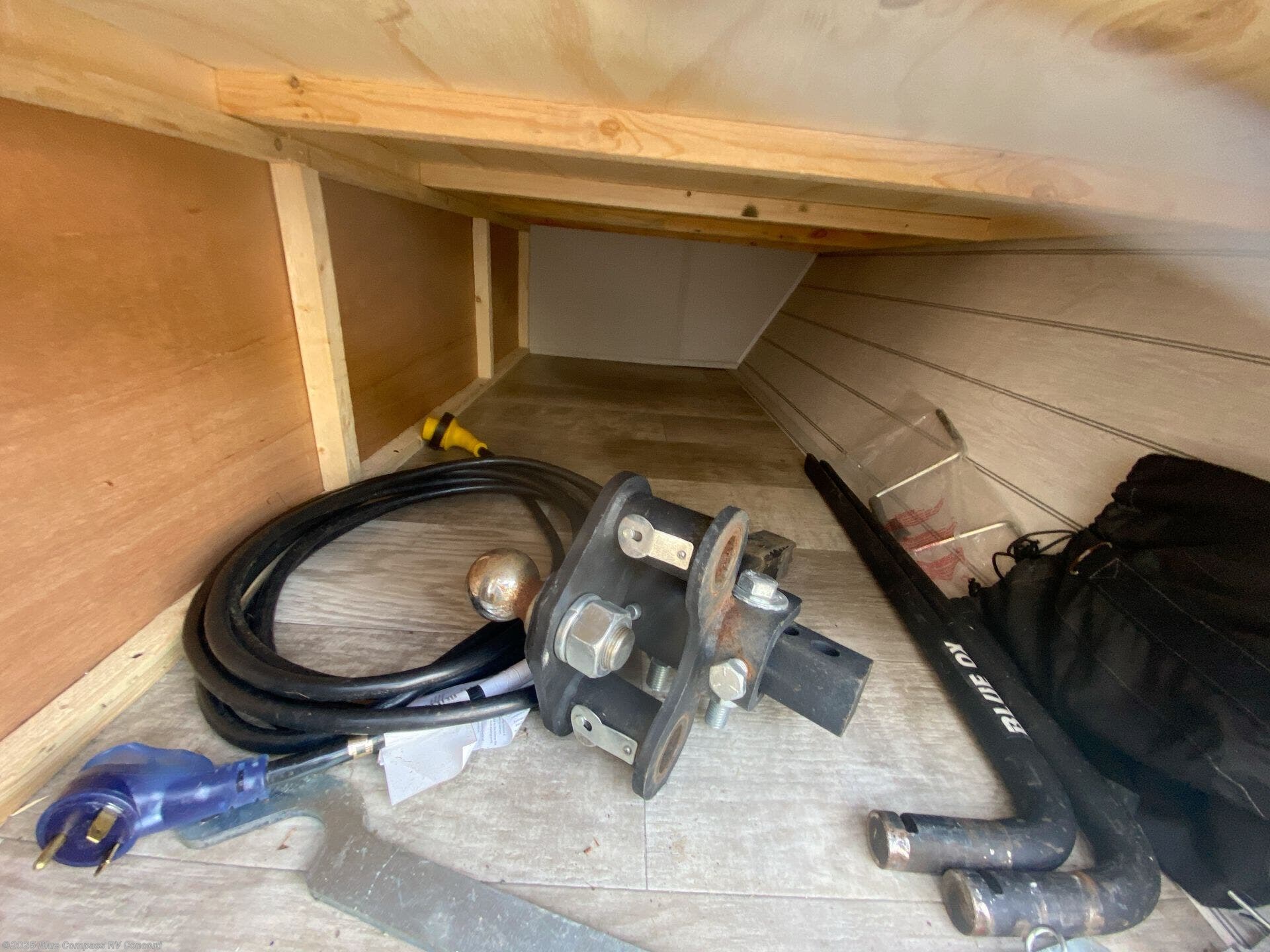 You are going to love this trailer with its rear full bathroom and front walk-around RV queen bed. This is the perfect couple's trailer or smaller family get-away! You will find storage on each side of the bed for your clothing and overhead storage for blankets and such. The booth dinette for two also offers overhead storage for your dry goods, plates and games. The kitchen provides a stainless steel microwave, two-burner cooktop and a 12V refrigerator. And the reason you might have purchased this trailer is the rear full bathroom that offers everything you need and a spacious room to change in.