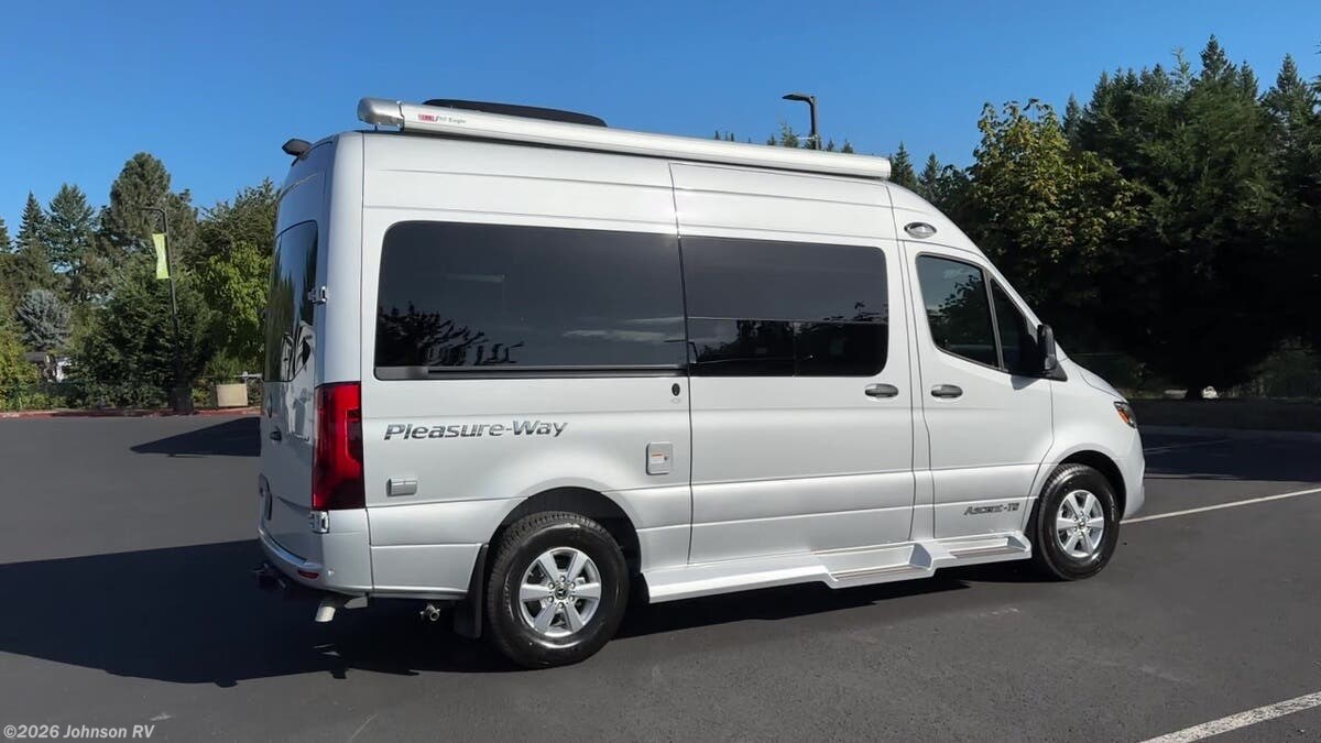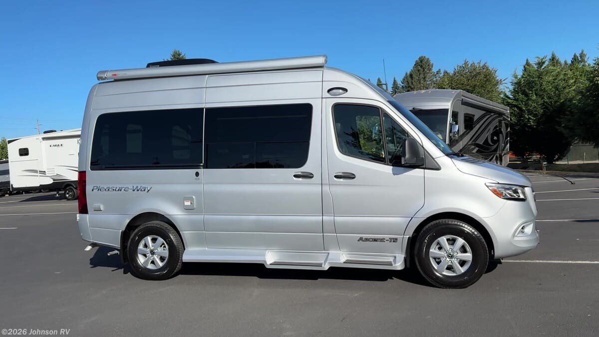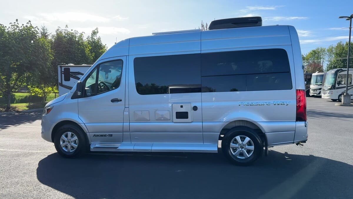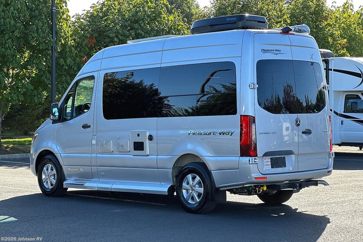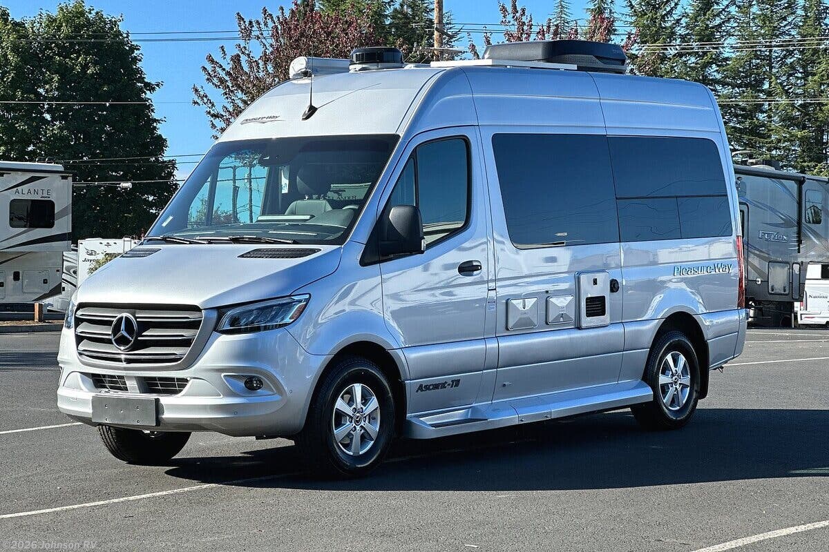 Introducing the 2024 Pleasure-Way Ascent TS, an expertly crafted Class B RV known for its sleek design and exceptional functionality. Built on the reliable Mercedes-Benz Sprinter 2500 chassis with a 144-inch wheelbase, this RV is powered by a 4-cylinder high-output diesel engine, delivering 211 horsepower. Its robust capabilities are further supported by a 9G-Tronic automatic transmission, four-wheel disc brakes with ABS, and adaptive stability and traction control systems. For convenience and safety, the Pleasure-Way Ascent TS is equipped with a suite of advanced features, including: - 4 seat belts for added security - Active Brake Assist and Lane Keeping Assist - Driver and passenger airbags - Attention and Blind Spot Assist - Crosswind and Distronic Active Distance Assist - LED headlamps and multifunction steering wheel - Rear view camera system and power side-mirrors The cab area boasts: - Power door locks and windows - Ultraleather, power, memory, swivel, and heated seats - MBUX 10-inch touchscreen multimedia system with navigation - Smartphone and Bluetooth streaming connectivity Inside the living space, enjoy comfort and elegance with: - Fiamma Power Awning with LED lights and fiberglass running boards - Vinyl flooring and acoustic wall paneling - 75-inch high ceiling with soft-touch vinyl headliner - Frameless awning style windows with blackout privacy shades For dining needs, this RV includes: - Lagun swivel table with dual mount positions - Corian solid surface countertop and undermount stainless steel sink - 12v 3.2cf refrigerator freezer and portable induction cooktop - Microwave convection oven and outdoor LP quick connect Entertainment and electronics are seamlessly integrated with: - Dual 10-inch touchscreen control panels - USB-A and USB-C charging ports - 24-inch LED Smart TV on a swing mount and Bose Bluetooth soundbar Sleeping arrangements are flexible, featuring: - A power sofa that converts to single beds (24x70, 24x72) or a queen bed (70x72) The enclosed private bathroom offers: - A mirror, shower curtain, and Moen handheld showerhead - Ceramic bowl foot flush toilet Reliable mechanical and utility systems include: - LP tank electric shutoff switch and battery disconnect - 30-Amp SmartPlug service cord and 2.5kW Onan QG 2500i LP generator - 600Ah Eco-Ion Earth Smart Lithium batteries - Optional Go Power! Solar Package - Truma Aventa Eco AC unit and Truma VarioHeat furnace With its foil-face fiberglass roof insulation, the Pleasure-Way Ascent TS delivers superior comfort and efficiency, making it ideal for any adventure.
