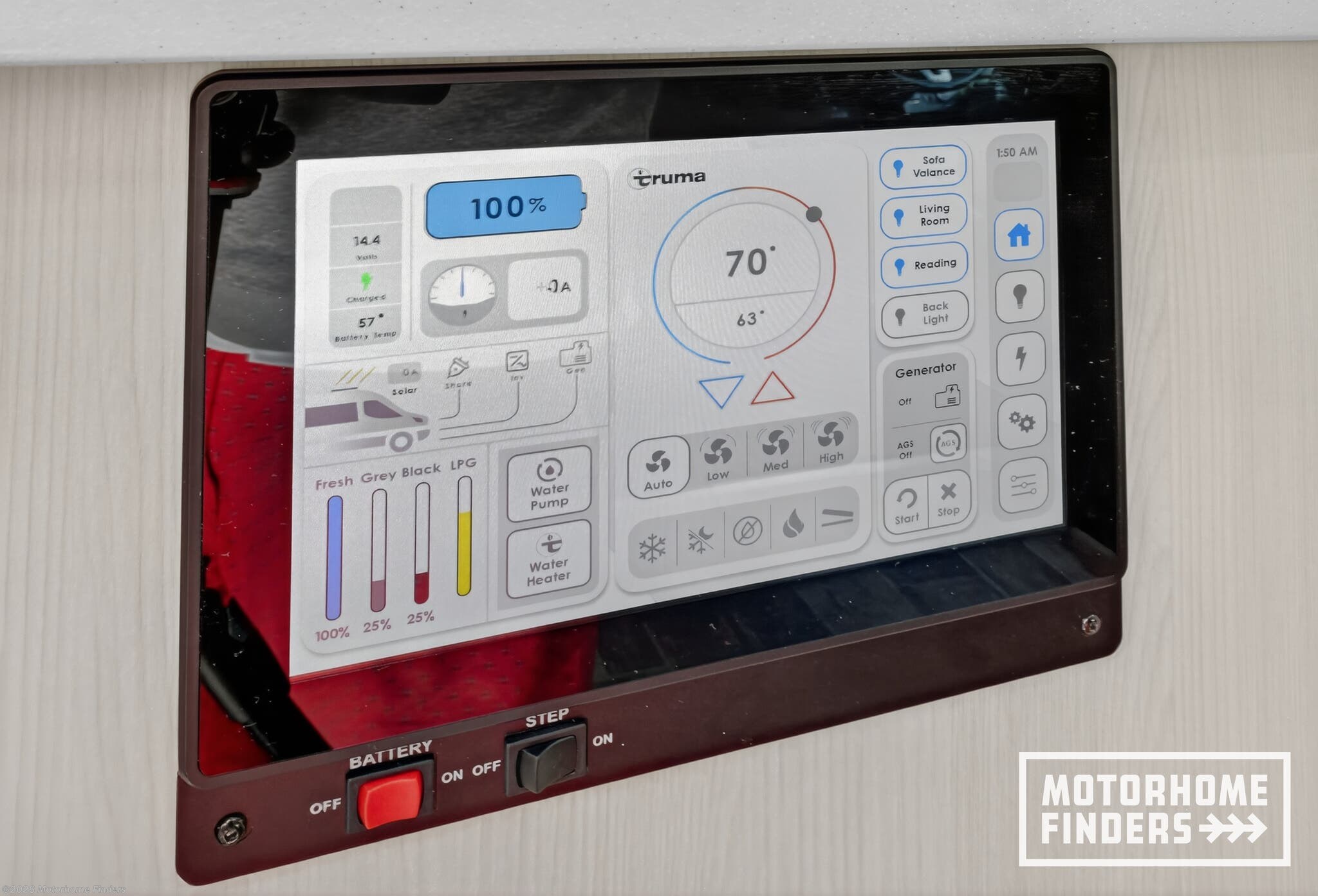 Full control of power, solar, climate, tanks, lighting, and diagnostics