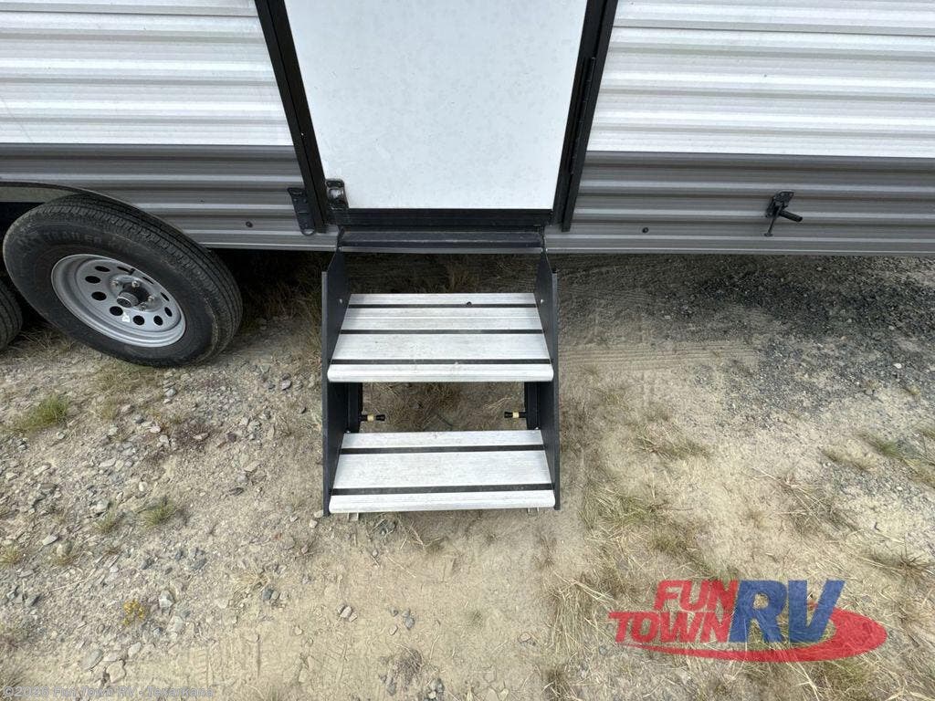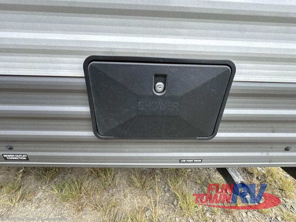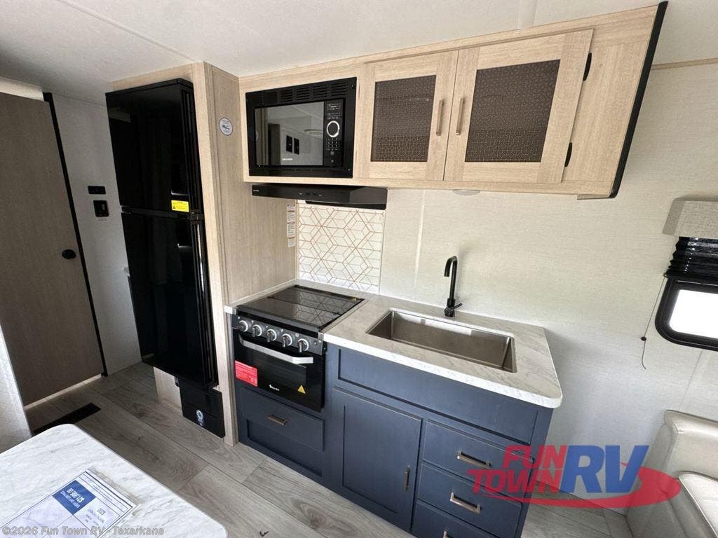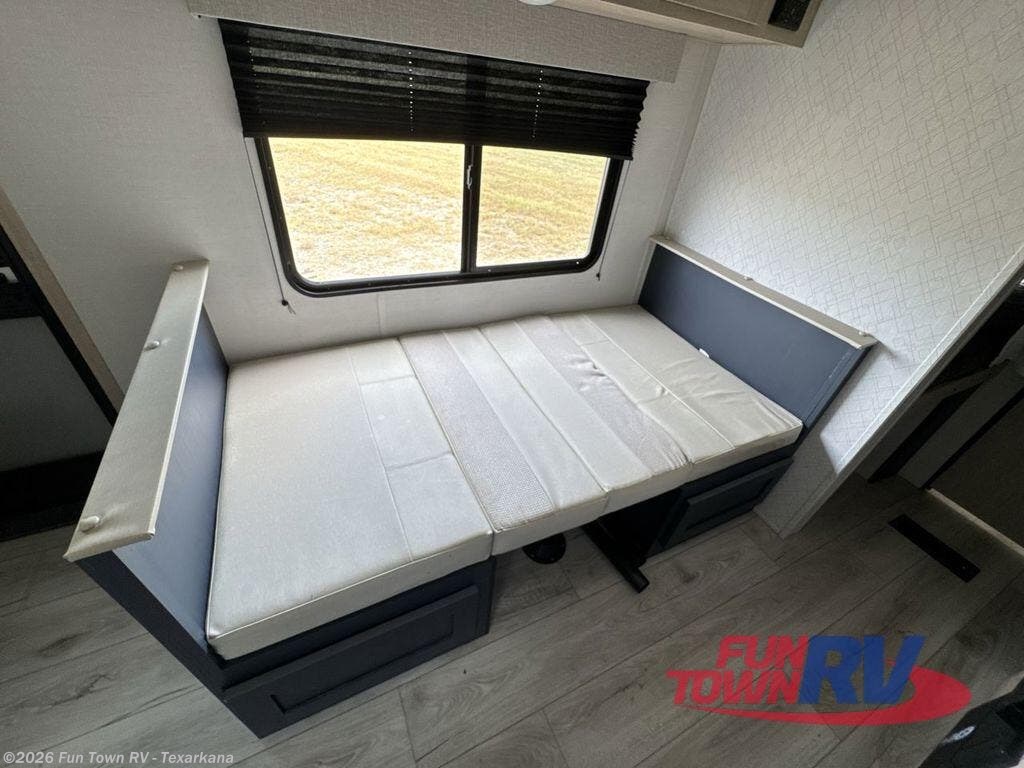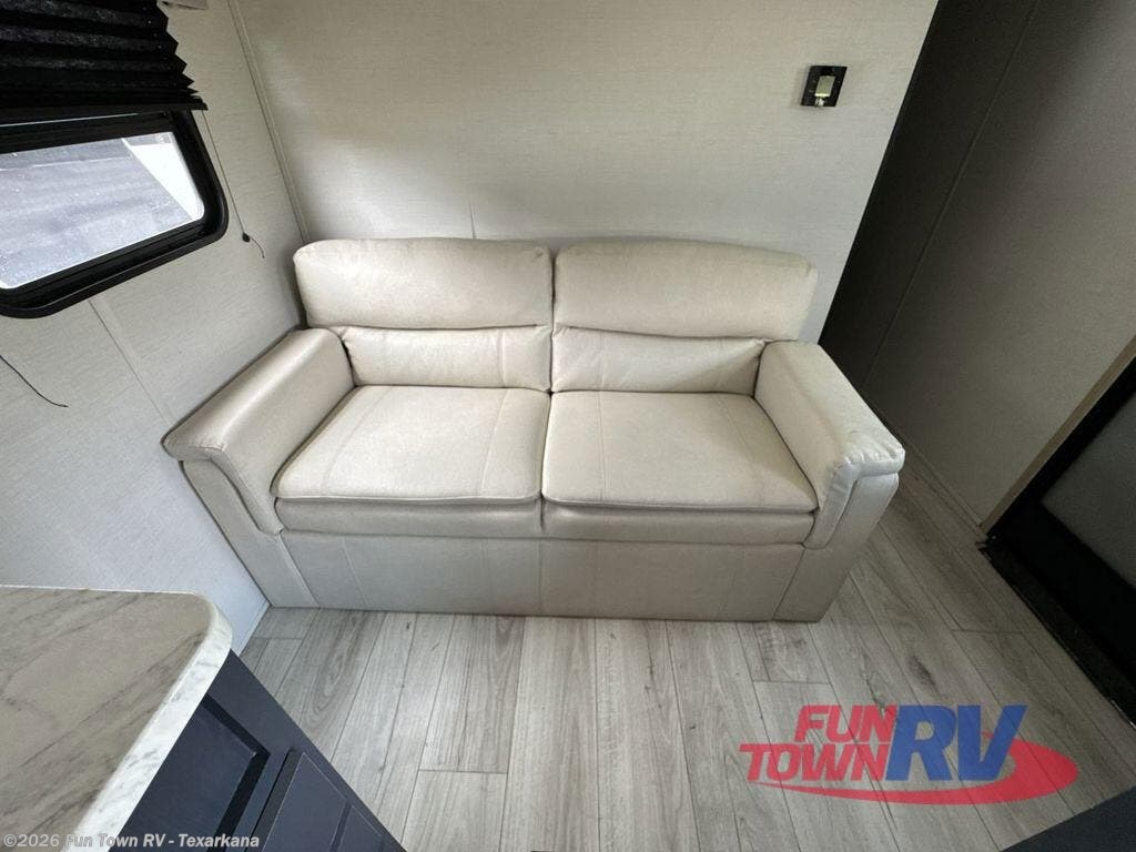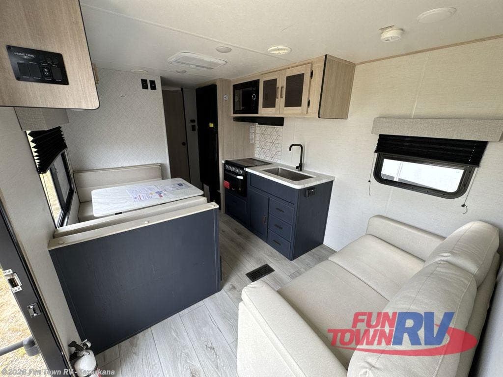 You will love spending time in this cozy travel trailer. The interior kitchen includes a three burner cooktop with a 17" oven and a 10.7 cu. ft. 12V refrigerator, and there is an exterior kitchen to cook outdoors when the weather is nice. With the inclusion of a walk-around queen bed in the front bedroom, plus the sofa and booth dinette in the combined kitchen and living area, and the double-size bunks, there is plenty of room to sleep eight or nine people each night.