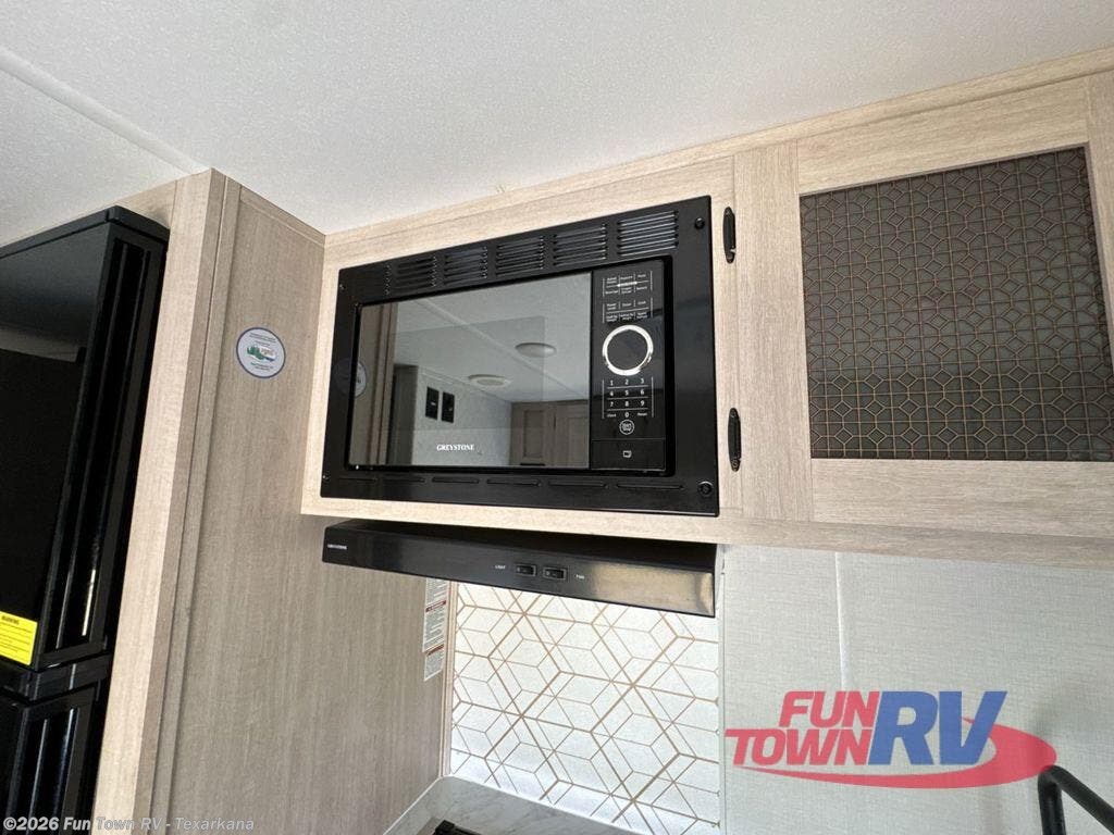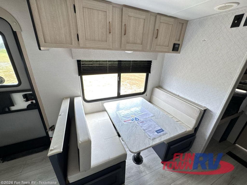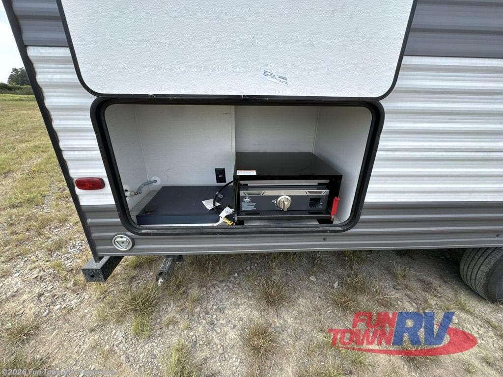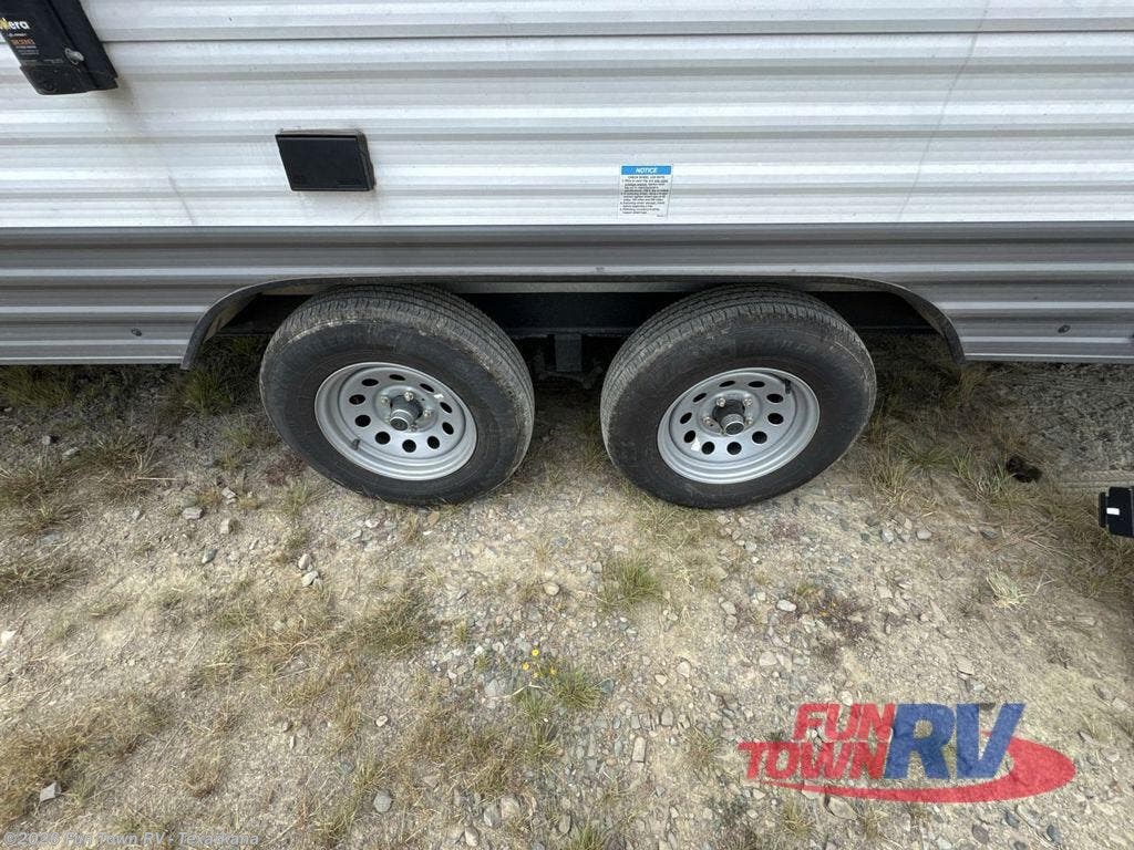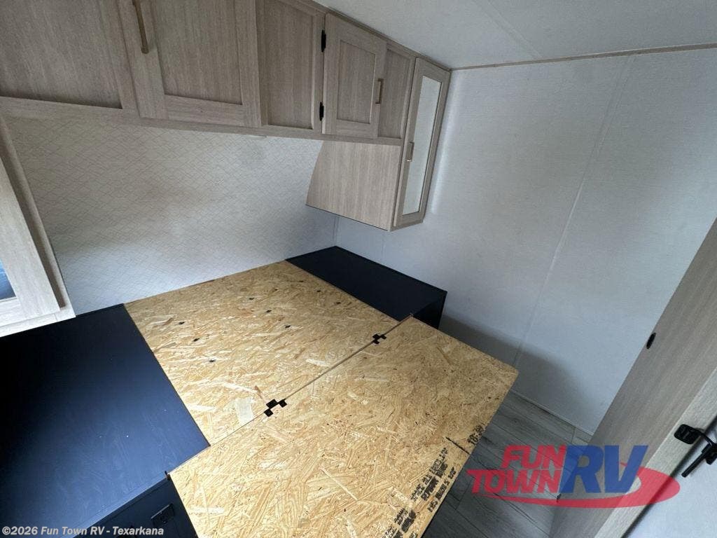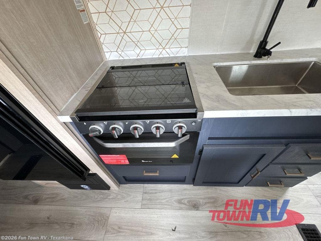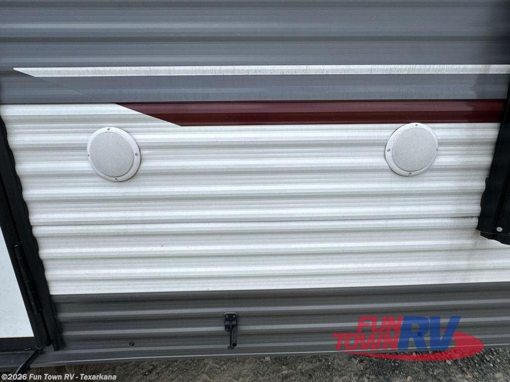 You will love spending time in this cozy travel trailer. The interior kitchen includes a three burner cooktop with a 17" oven and a 10.7 cu. ft. 12V refrigerator, and there is an exterior kitchen to cook outdoors when the weather is nice. With the inclusion of a walk-around queen bed in the front bedroom, plus the sofa and booth dinette in the combined kitchen and living area, and the double-size bunks, there is plenty of room to sleep eight or nine people each night.