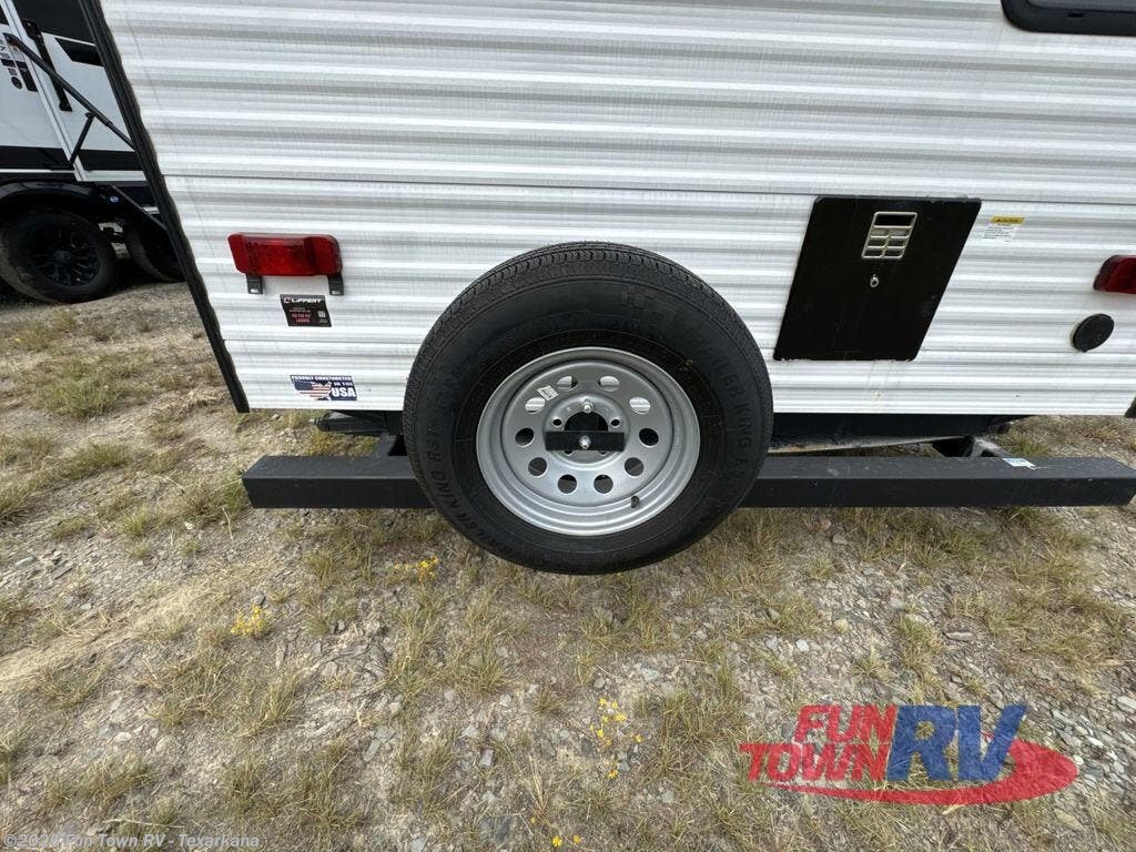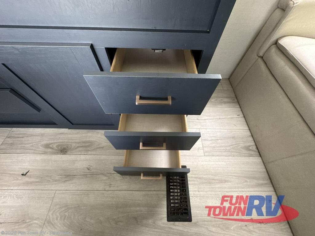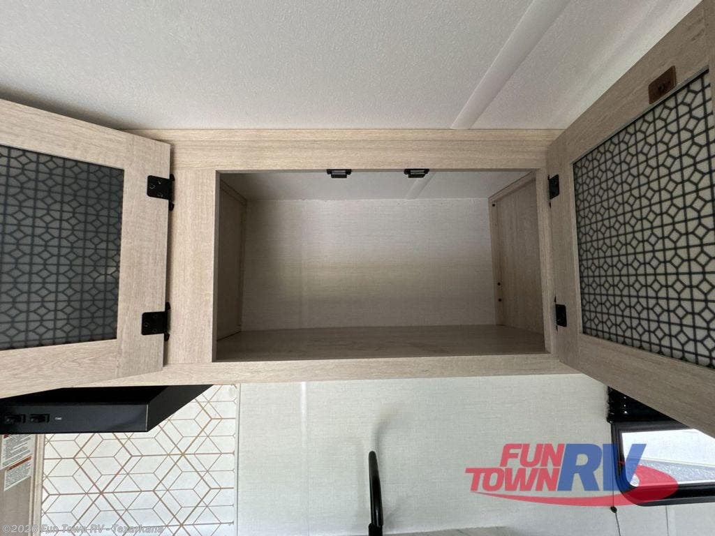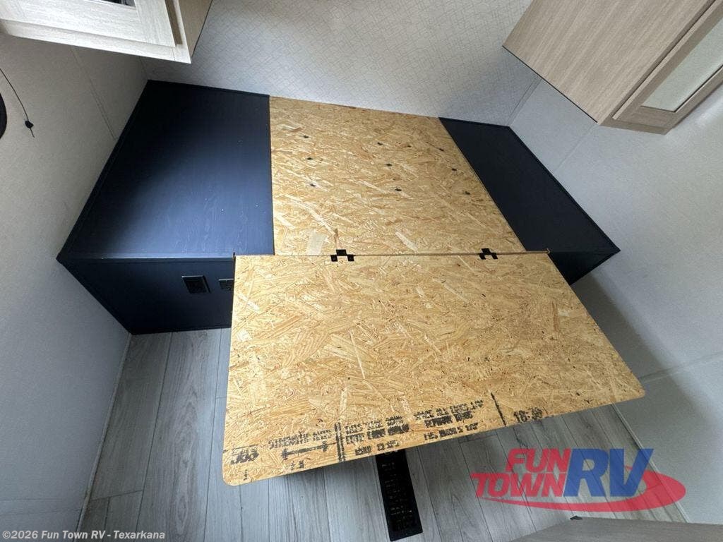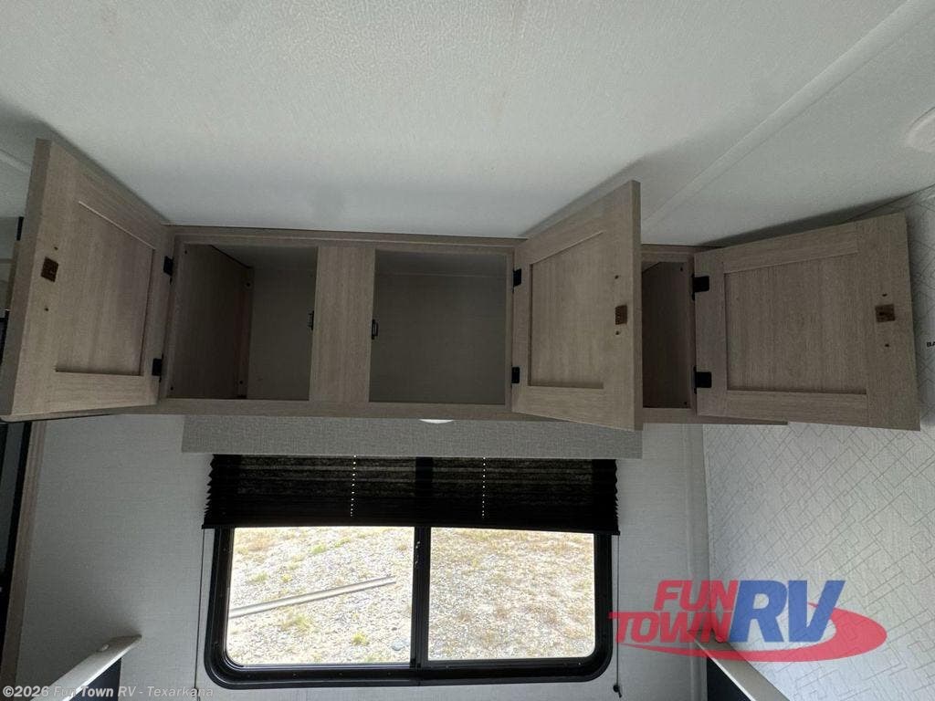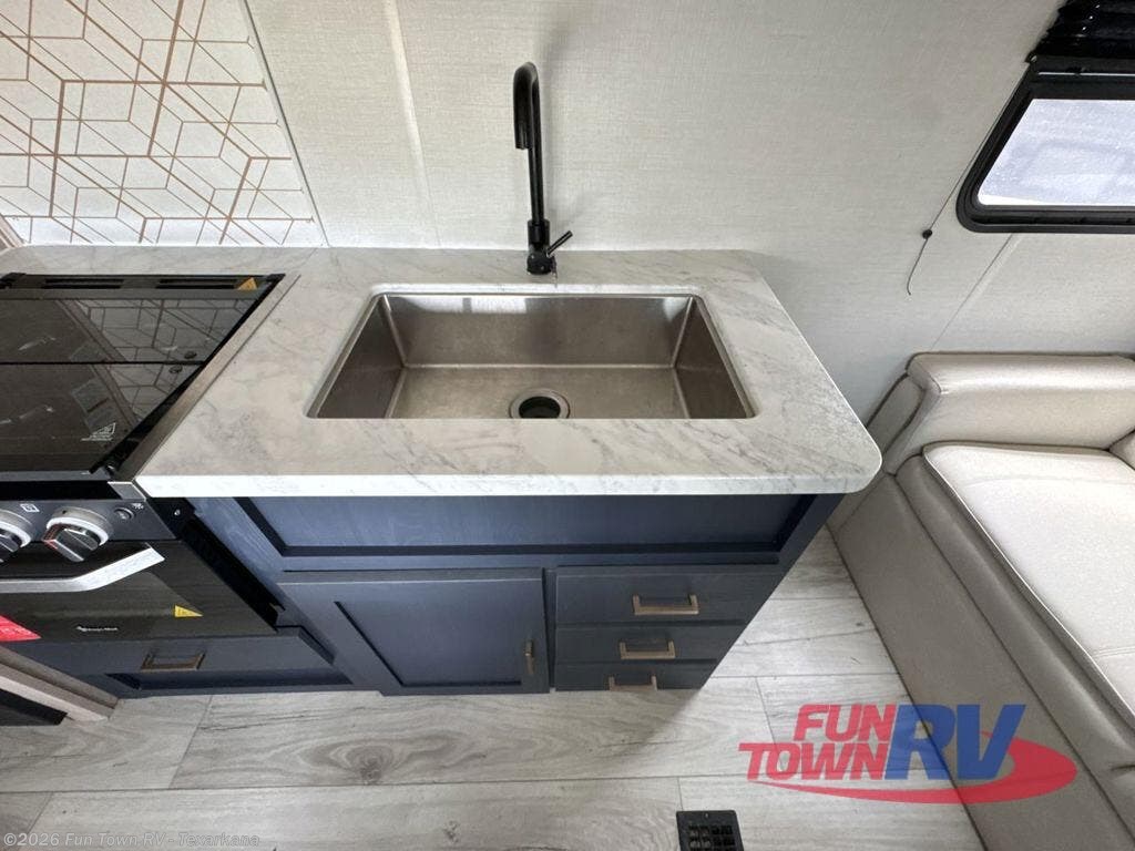 You will love spending time in this cozy travel trailer. The interior kitchen includes a three burner cooktop with a 17" oven and a 10.7 cu. ft. 12V refrigerator, and there is an exterior kitchen to cook outdoors when the weather is nice. With the inclusion of a walk-around queen bed in the front bedroom, plus the sofa and booth dinette in the combined kitchen and living area, and the double-size bunks, there is plenty of room to sleep eight or nine people each night.