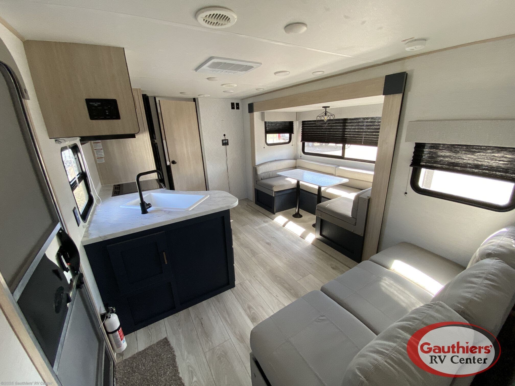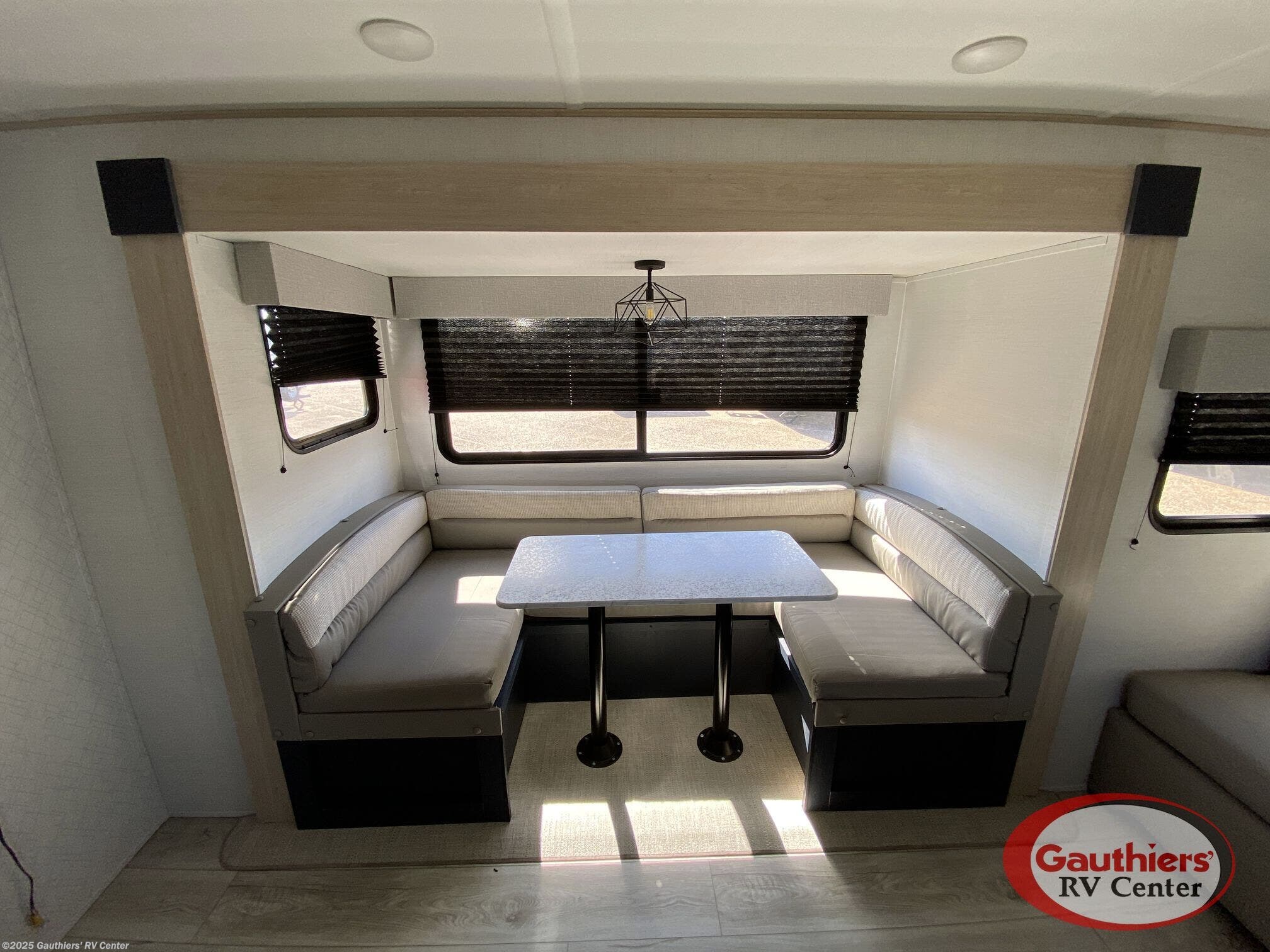 SINGLE SLIDE REAR BATH TRAVEL TRAILER W/ POWER AWNING, U-SHAPE DINETTE, AND 12 VOLT 10 CU FT REFRIGERATOR.