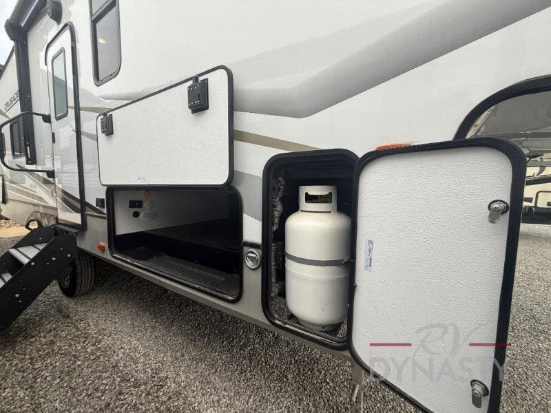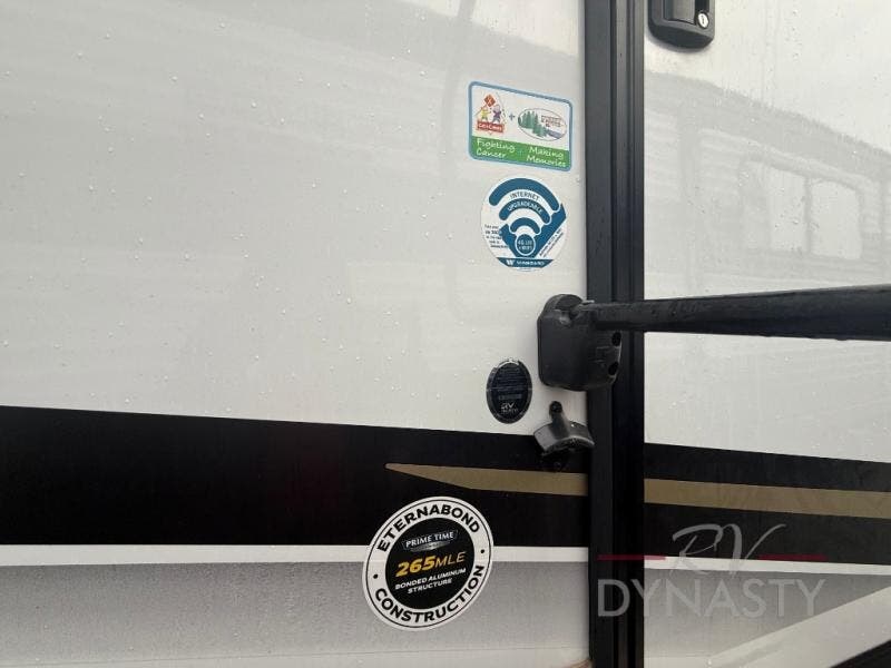 The Crusader fifth wheels by Prime Time RV are a step above the rest and it's not hard to see why. Each model has been constructed to last with its exclusive Eternabond construction, a one-piece TPO roof, and high gloss gel coat fiberglass exterior. The auto leveling system and the comprehensive universal docking center will have you set up to camp in no-time, and there is a convenient bottle opener and Doggy D-ring for your furry companions. You will fall in love with the interior that includes solid surface countertops, designer Carefree linoleum with Scotchgard technology, hardwood cabinet doors, and many more residential comforts. The Crusader also comes standard with dual "Whisper Quiet" ducted A/C's, a 35,000 BTU high capacity gas furnace, and the Extreme Thermal Package Plus, making your camping season year-around!