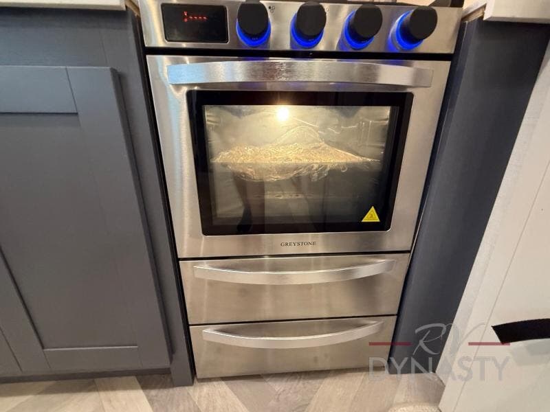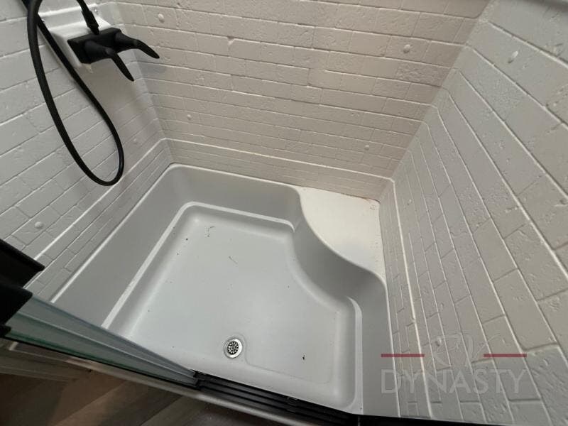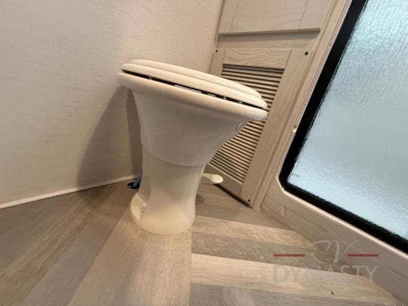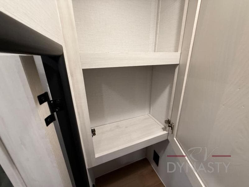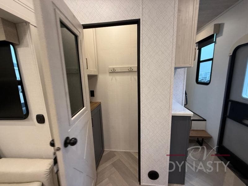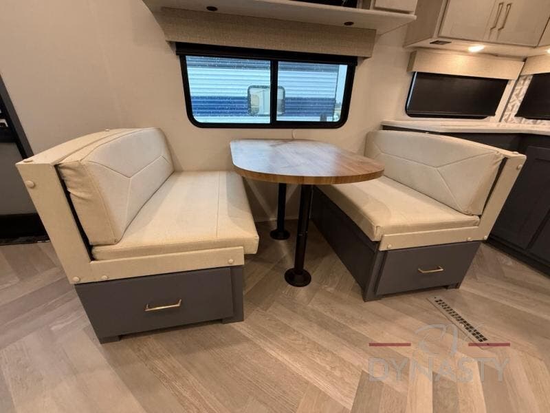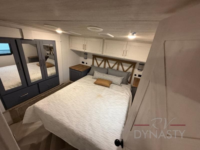 This is the perfect couple's trailer for all your outdoor excursions. The front private bedroom includes a queen bed, wardrobe slide, and dual nightstands to keep your clothes tidy. You can relax each day on the theater seating within the slide out, and the TV is in perfect viewing for movie night. The rear kitchen includes ample counter space, a three burner cooktop, plus a 16 cu. ft. refrigerator to keep food fresh. There is even a walk-in pantry for snacks! A booth dinette will be perfect for dining or to let an extra guests sleep over, and if you're not needing the extra sleeping space, just choose the optional free-standing table with four chairs. And don't worry about leaving your RV in the middle of the night to use the restroom; this model includes a full bath just like at home!