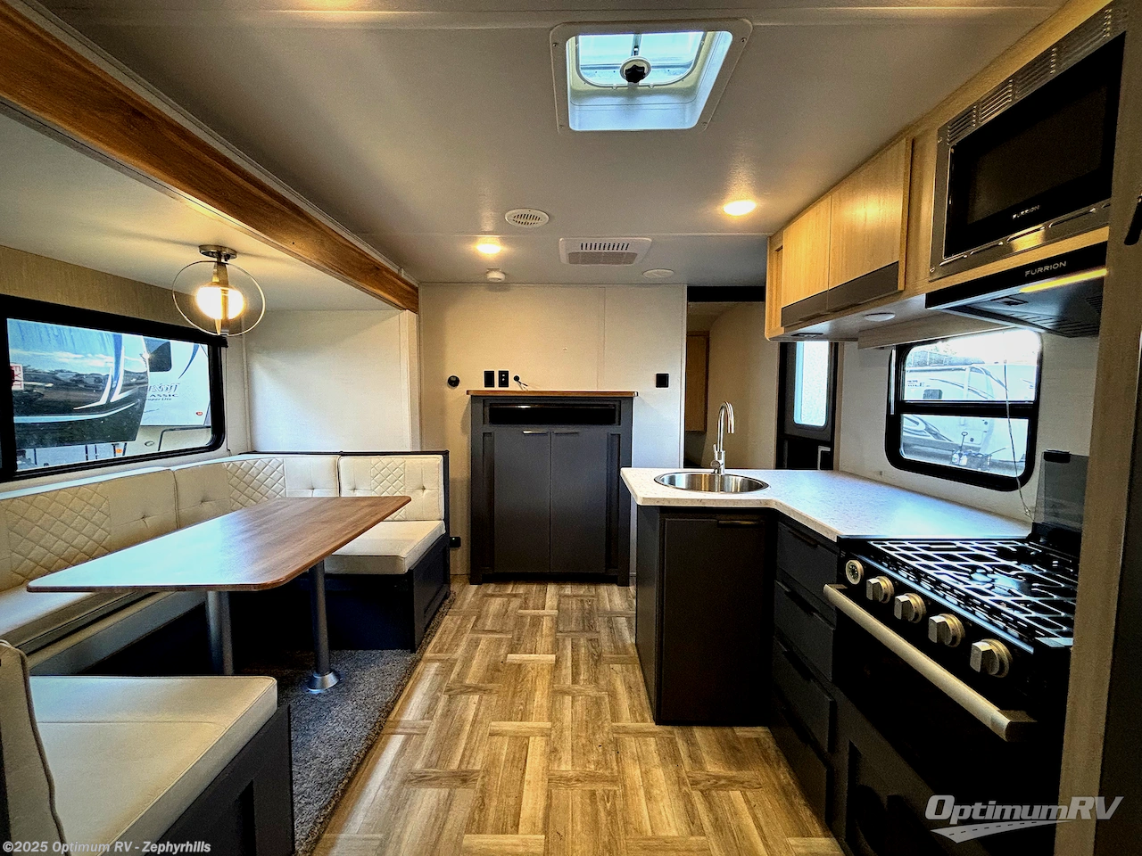 If you are looking for a trailer with double-size bunks and a private bedroom, you have found it! The queen bed and two wardrobes are behind a partial wall for added privacy. The double-size bunks are in the rear corner next to the full bathroom for convenience for the kids or your guests. And the L-shaped counter with a kitchen sink and full amenities sets up the cook nicely to be able to make meals for everyone. And you will love the extra floor space created by the booth dinette and sofa slide out.