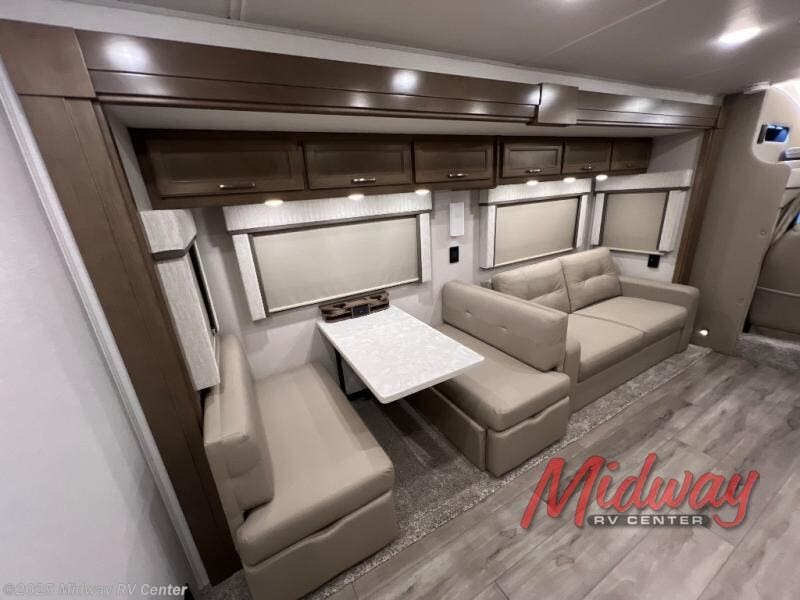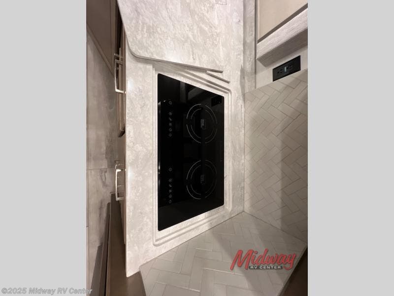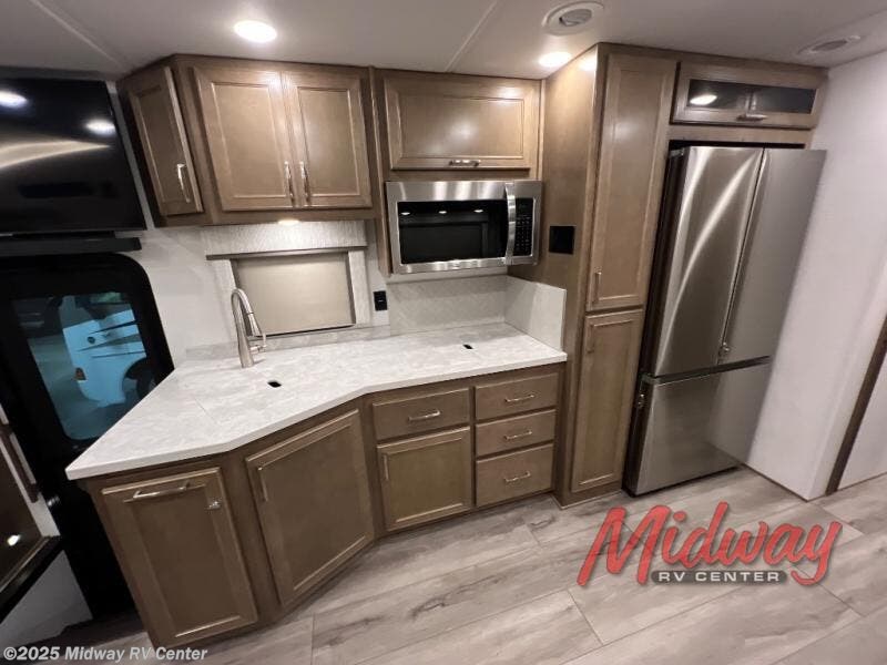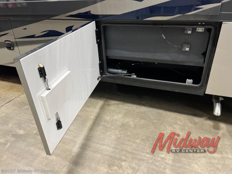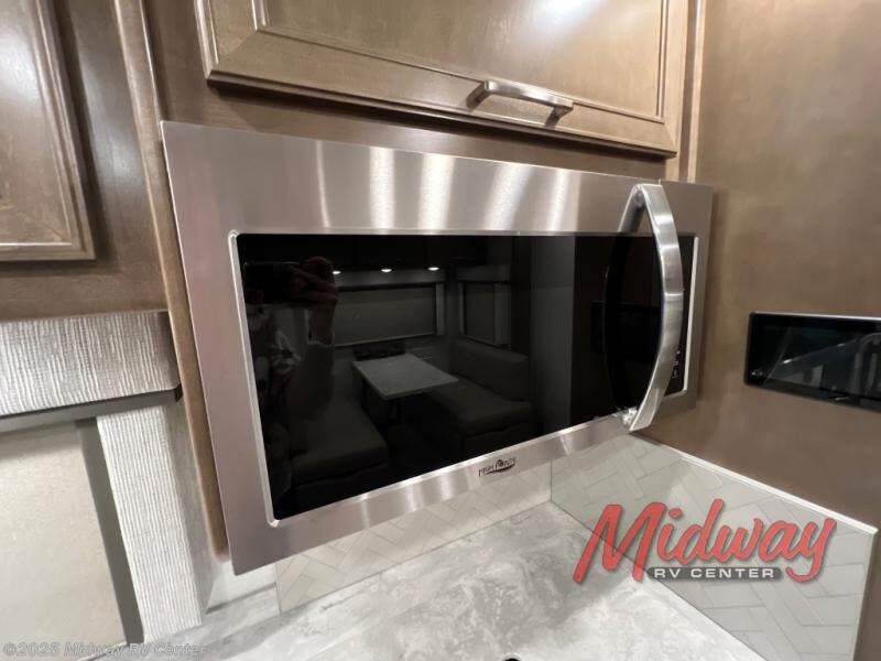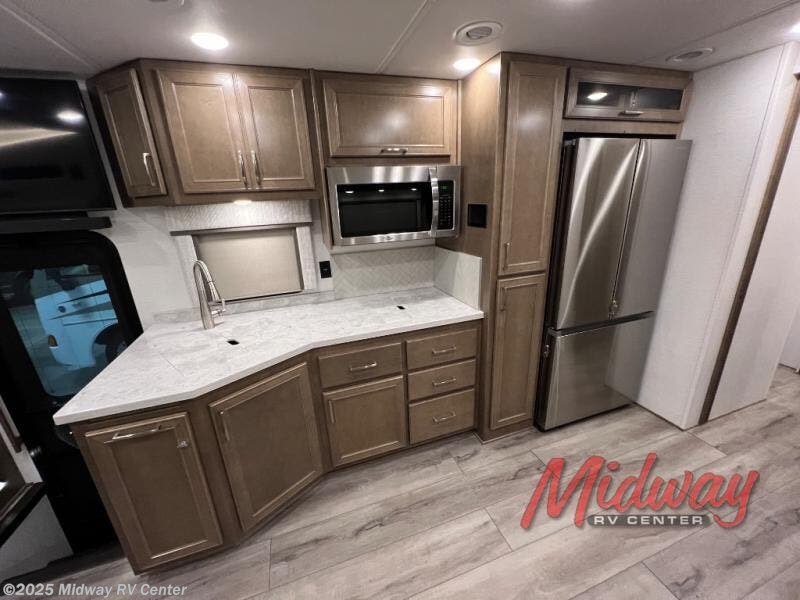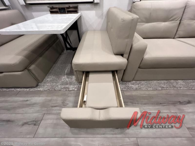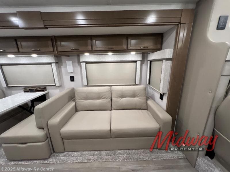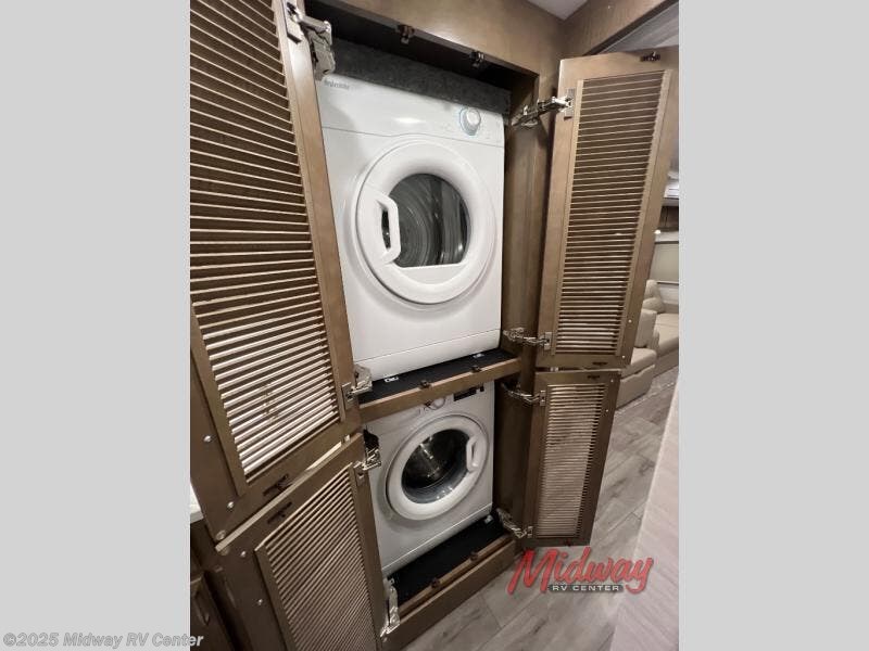 Whether you travel while you work or enjoy long-trips in your RV, this coach provides all the luxury, flexibility and comfort you could want! The main living and kitchen area is spacious with a furniture slide which includes a booth dinette and a slide-a-bed sofa which both offer sleeping space when needed for guests. The cook will love using the stainless steel convection microwave oven and the induction cooktop when making meals, and the French door residential refrigerator will hold lots of cold food. The separated bathroom allows two people to get ready at once, and the king bed slide gives you more floor space in the bedroom to get to the closets and dresser. You will find a 32" 4K Smart LED TV in the bedroom to watch before bedtime, and the exterior offers a 32" LED TV to watch the big game while relaxing under the electric awning with LED lights. And you might like to add the washer/dryer option to the prepped closet to keep everything clean while on the road.