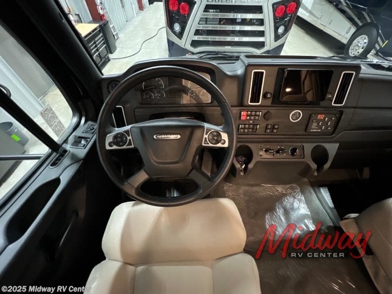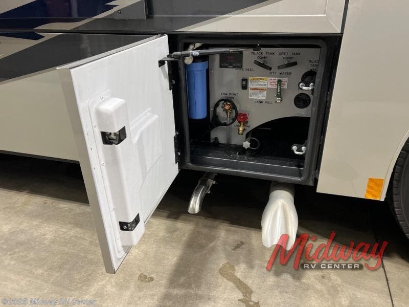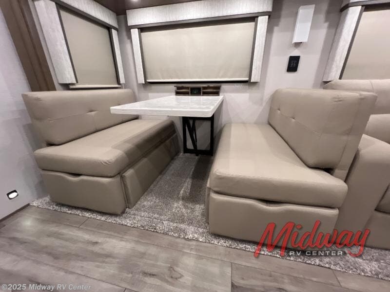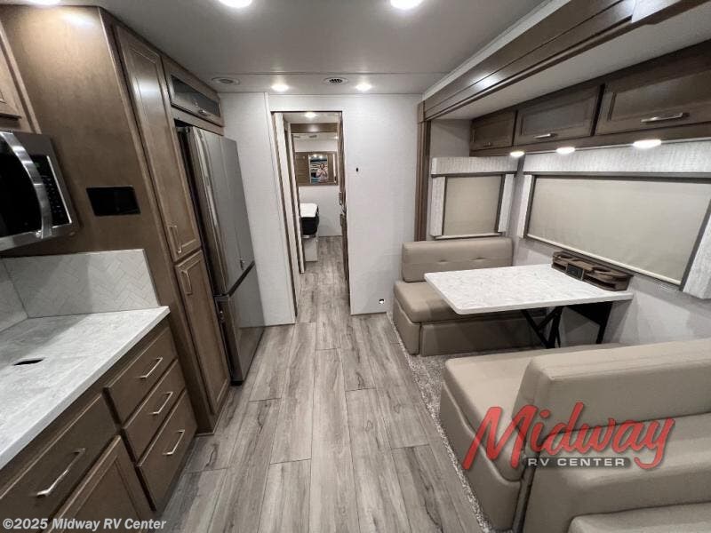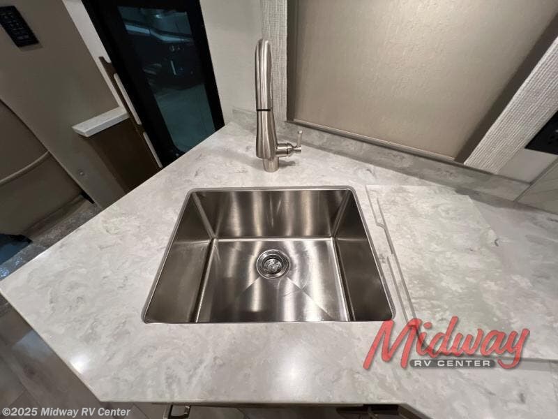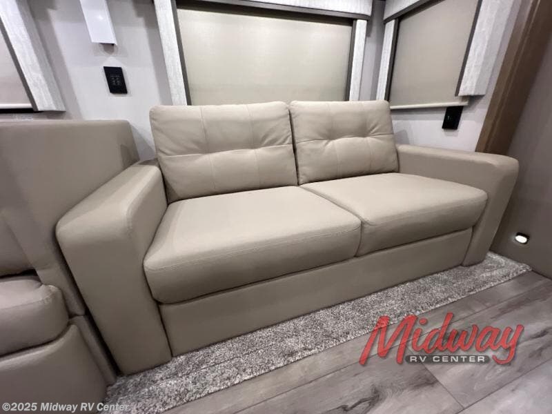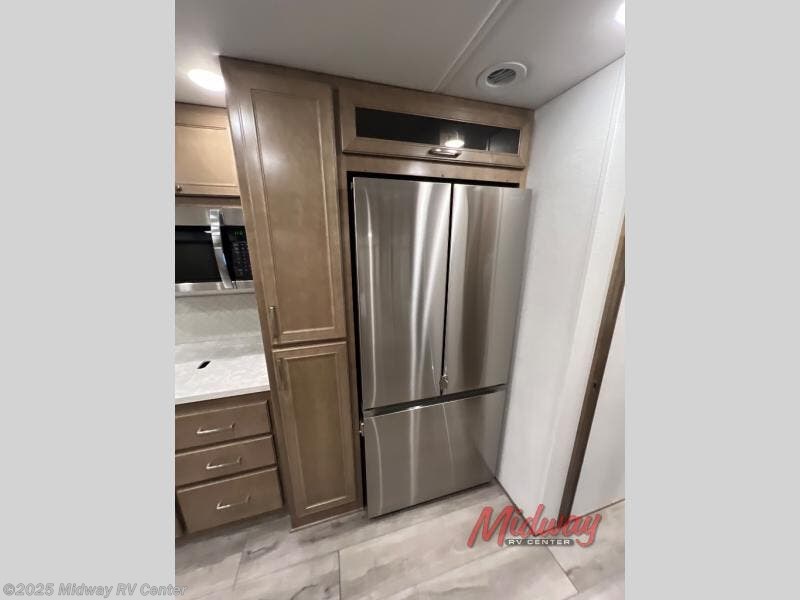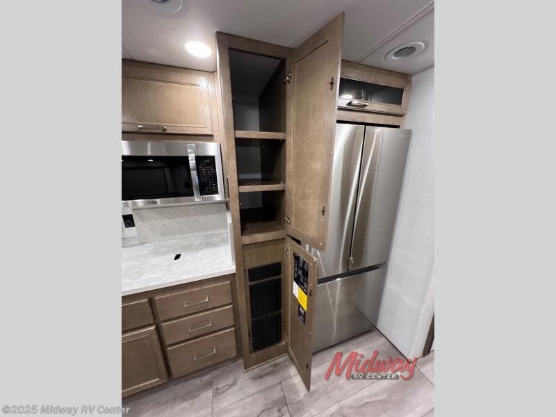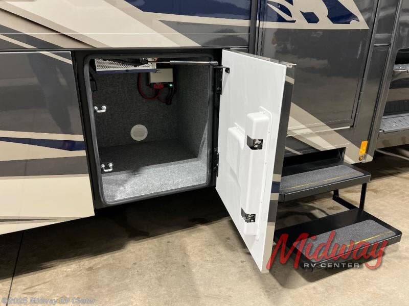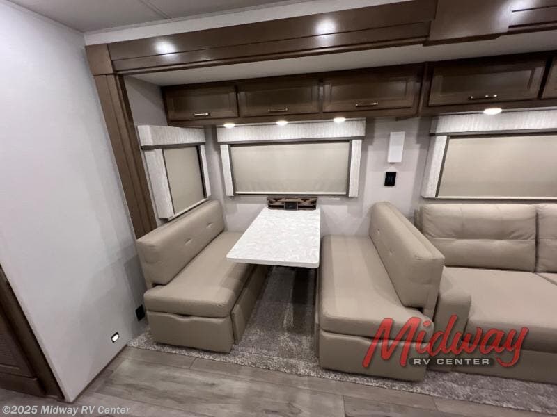 Whether you travel while you work or enjoy long-trips in your RV, this coach provides all the luxury, flexibility and comfort you could want! The main living and kitchen area is spacious with a furniture slide which includes a booth dinette and a slide-a-bed sofa which both offer sleeping space when needed for guests. The cook will love using the stainless steel convection microwave oven and the induction cooktop when making meals, and the French door residential refrigerator will hold lots of cold food. The separated bathroom allows two people to get ready at once, and the king bed slide gives you more floor space in the bedroom to get to the closets and dresser. You will find a 32" 4K Smart LED TV in the bedroom to watch before bedtime, and the exterior offers a 32" LED TV to watch the big game while relaxing under the electric awning with LED lights. And you might like to add the washer/dryer option to the prepped closet to keep everything clean while on the road.