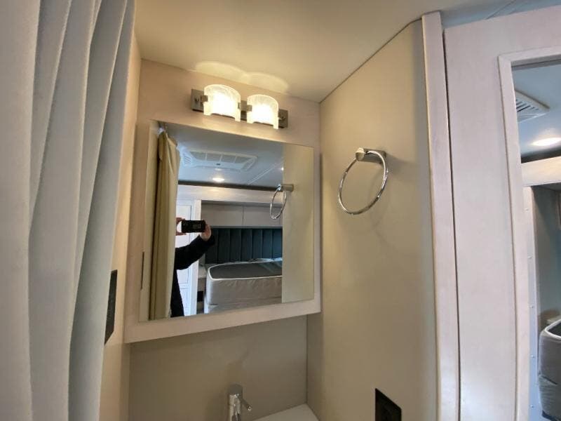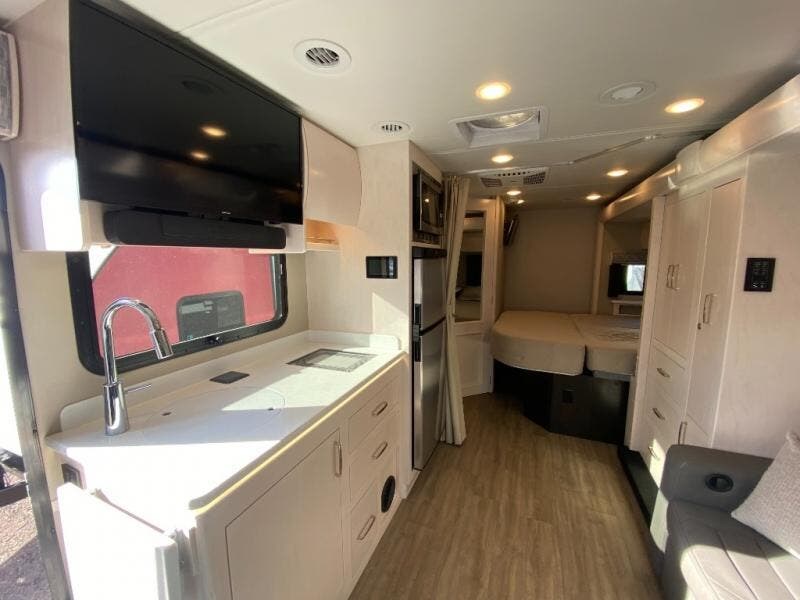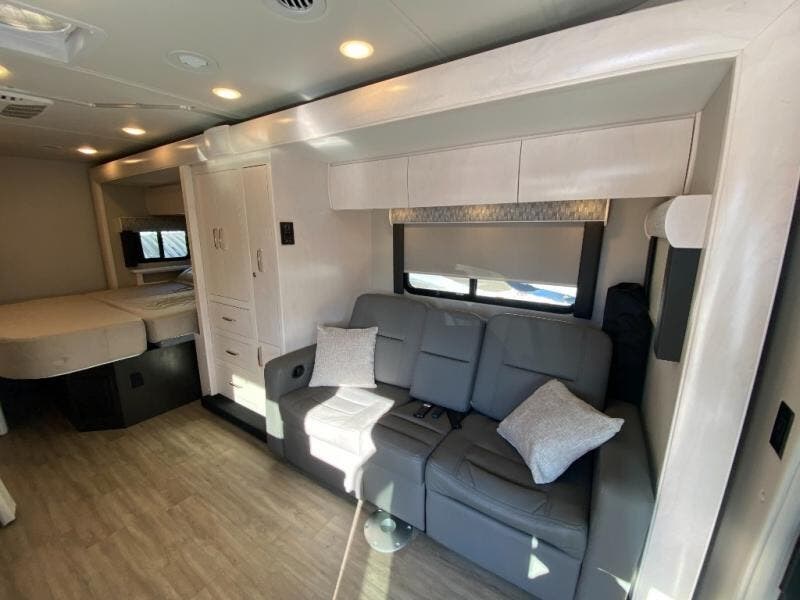 You will have a luxurious experience traveling in this motorhome! After a long day of traveling, you can either take a hot shower in the rear corner private 24" x 36" shower and toilet room, or lay down on the RV queen bed within the large slide. The bathroom sink is just outside the door with a medicine cabinet to store your toiletries. There is plenty of storage throughout between the wardrobe, the overhead cabinets, and the pantry, as well as outside with side swing baggage doors. The dinette is a great place to enjoy meals, play games, and transform into a sleeping space, and with a 46" x 80" bunk mattress above the cab, another person can join in on the fun!
