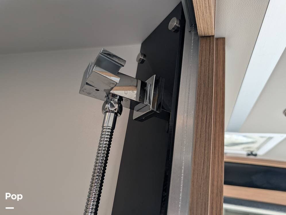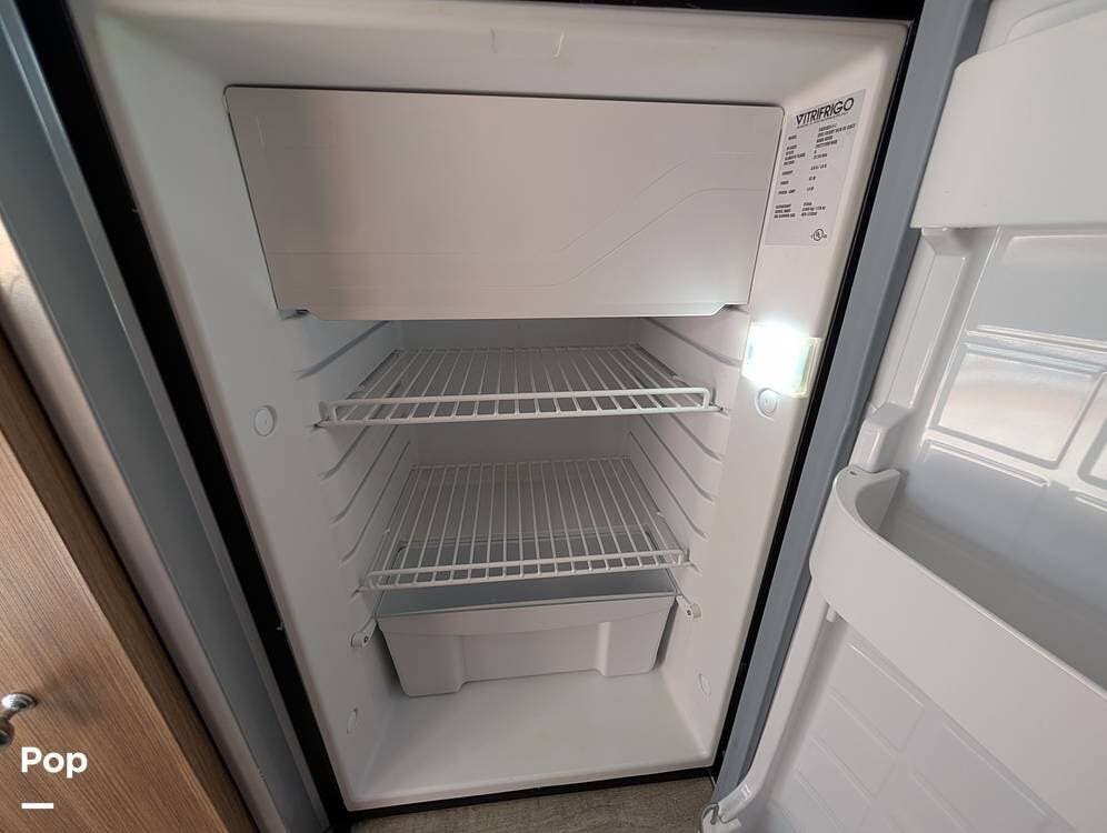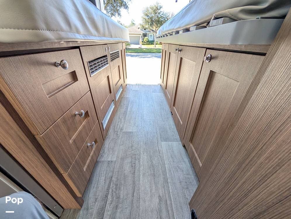 The galley kitchen is both sleek and efficient, featuring an induction cooktop, a stainless steel sink, a microwave, a refrigerator, and generous cabinetry for storage. The enclosed wet bath offers a shower, toilet, sink, and smart storage, allowing you to remain fully self-contained wherever your travels take you. Outside, a power awning instantly expands your living space for relaxing or entertaining.