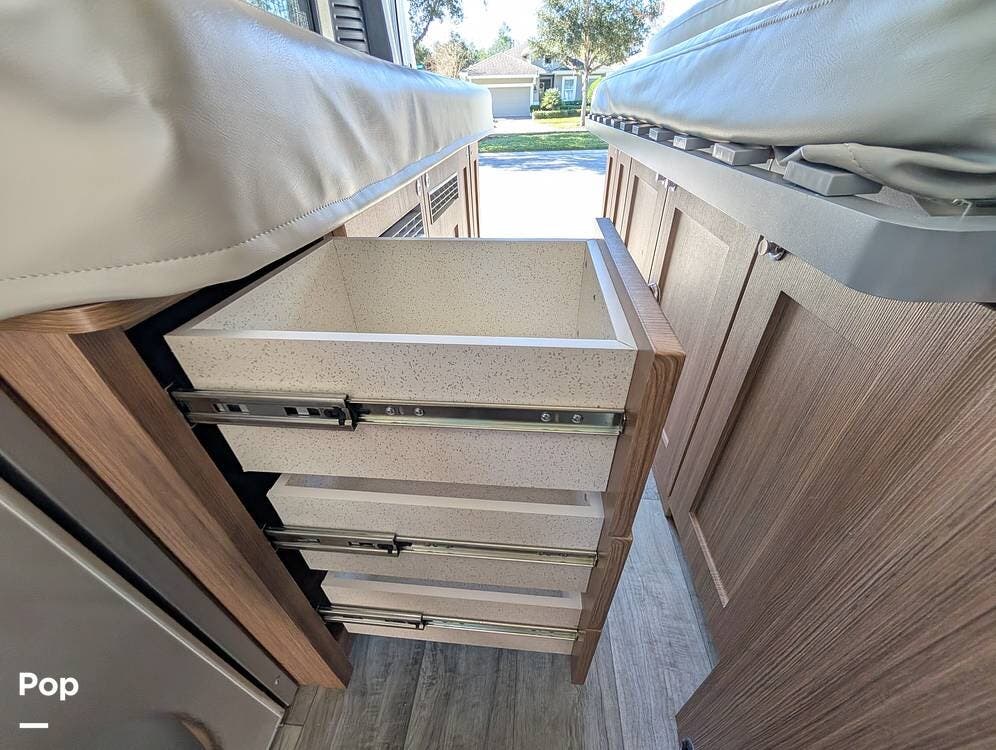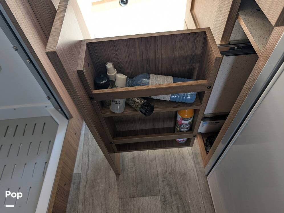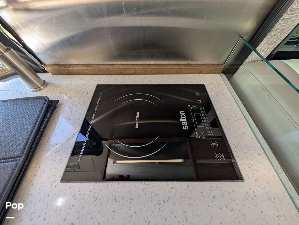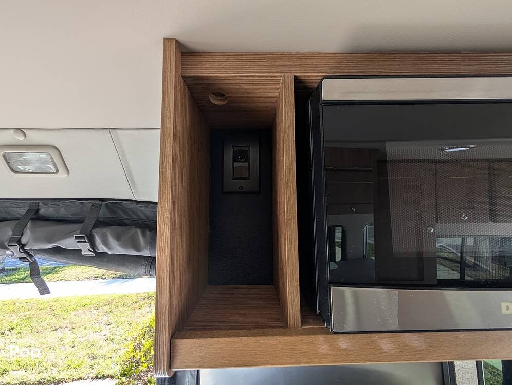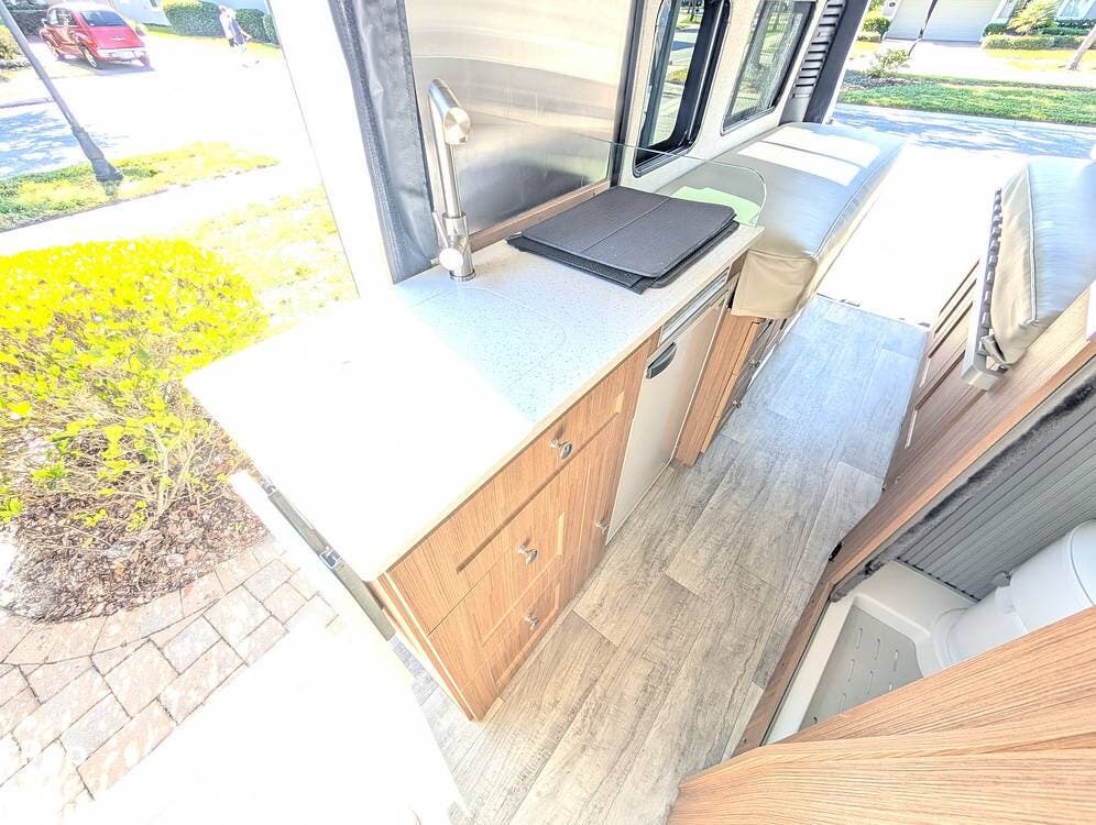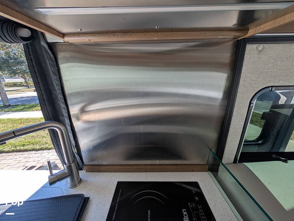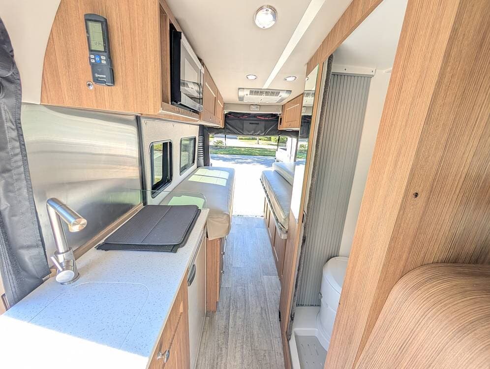 The galley kitchen is both sleek and efficient, featuring an induction cooktop, a stainless steel sink, a microwave, a refrigerator, and generous cabinetry for storage. The enclosed wet bath offers a shower, toilet, sink, and smart storage, allowing you to remain fully self-contained wherever your travels take you. Outside, a power awning instantly expands your living space for relaxing or entertaining.