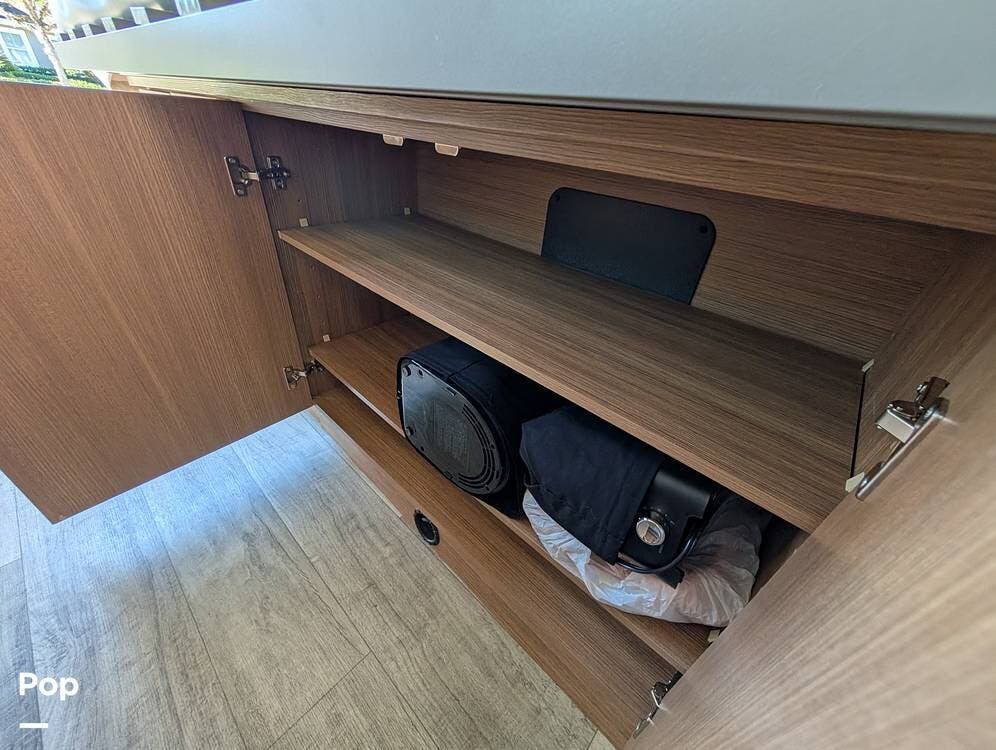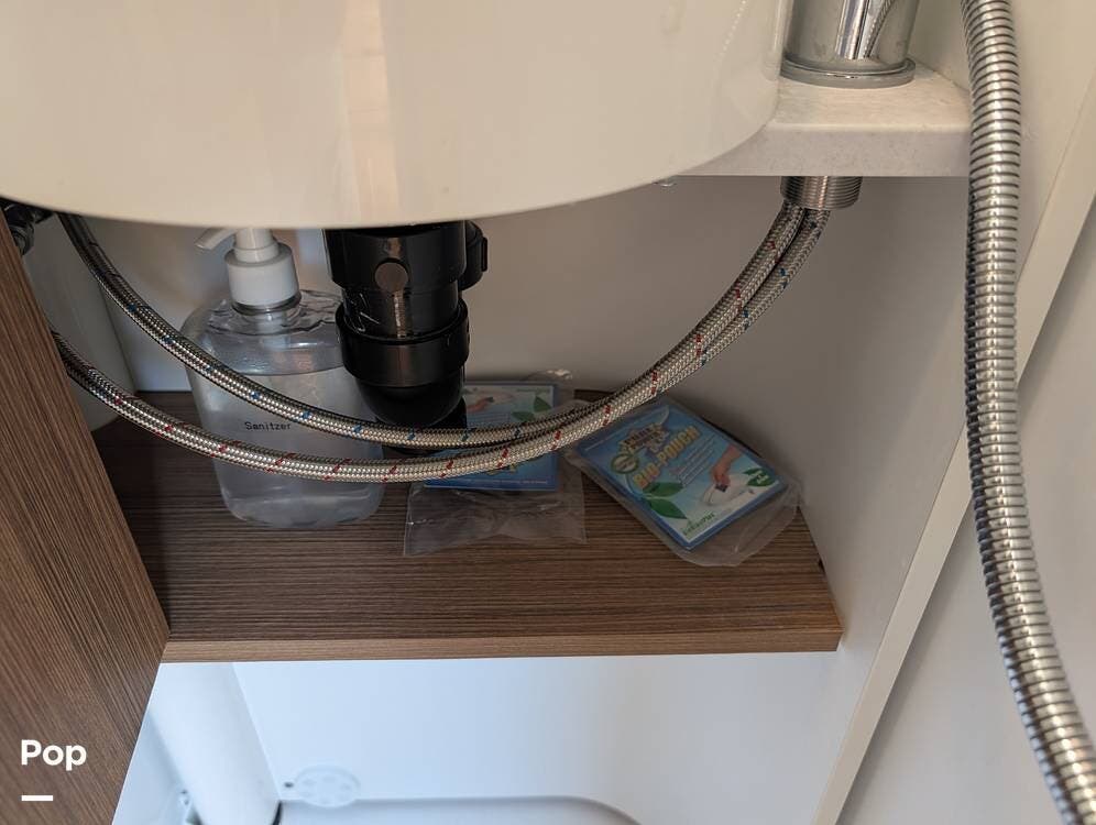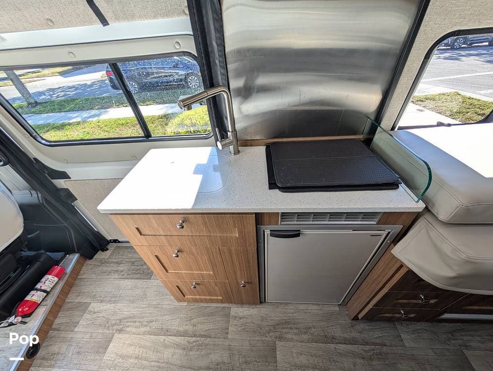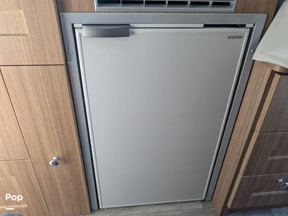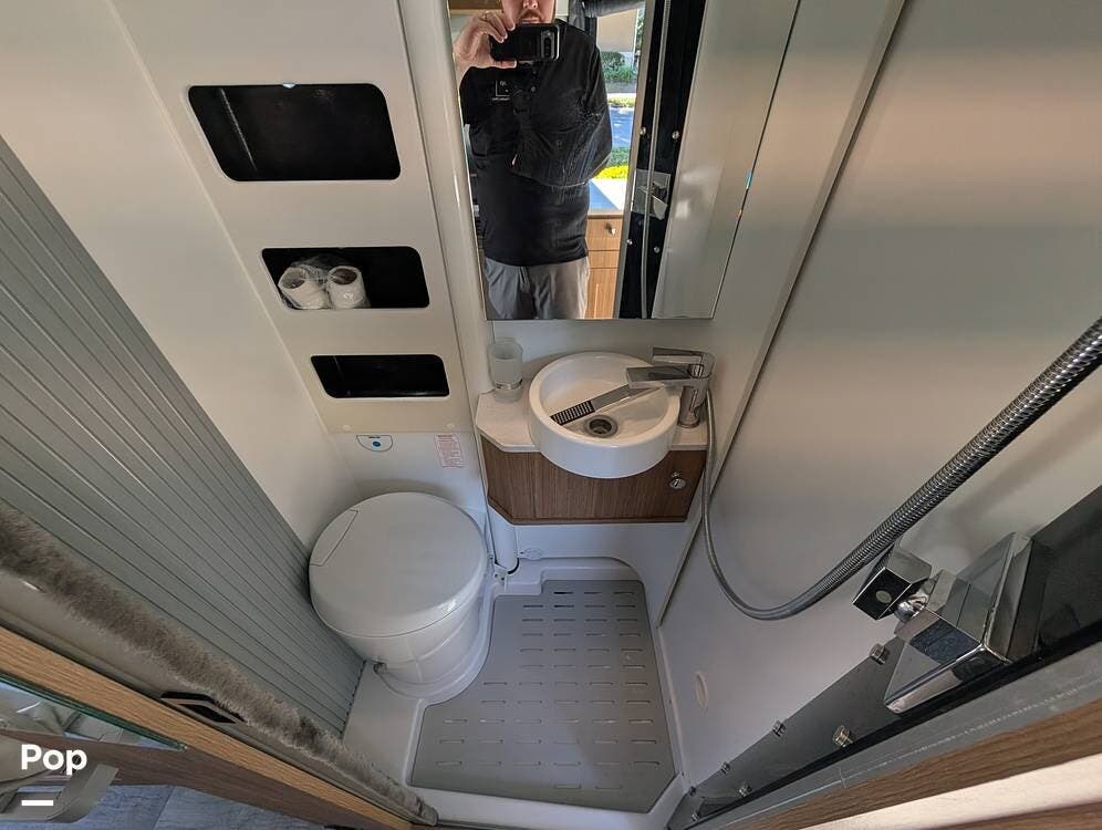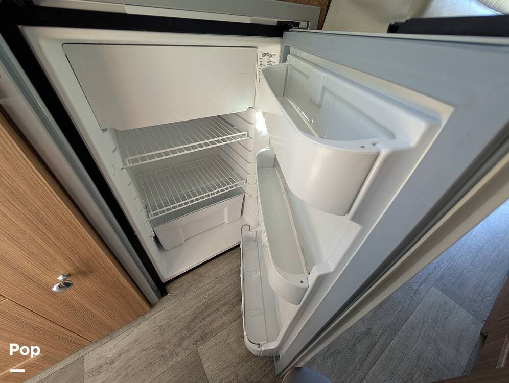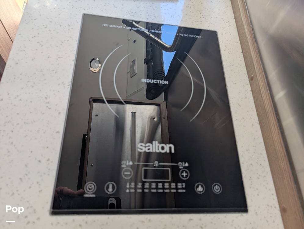 The galley kitchen is both sleek and efficient, featuring an induction cooktop, a stainless steel sink, a microwave, a refrigerator, and generous cabinetry for storage. The enclosed wet bath offers a shower, toilet, sink, and smart storage, allowing you to remain fully self-contained wherever your travels take you. Outside, a power awning instantly expands your living space for relaxing or entertaining.