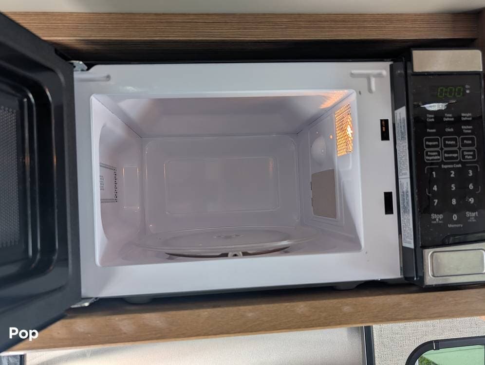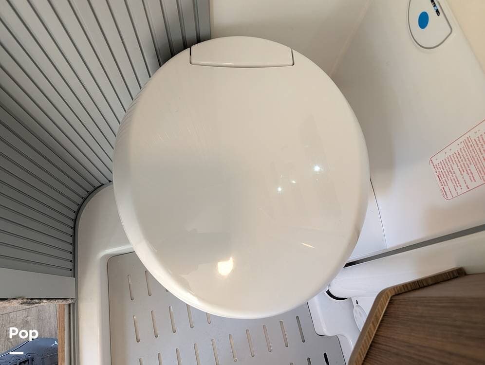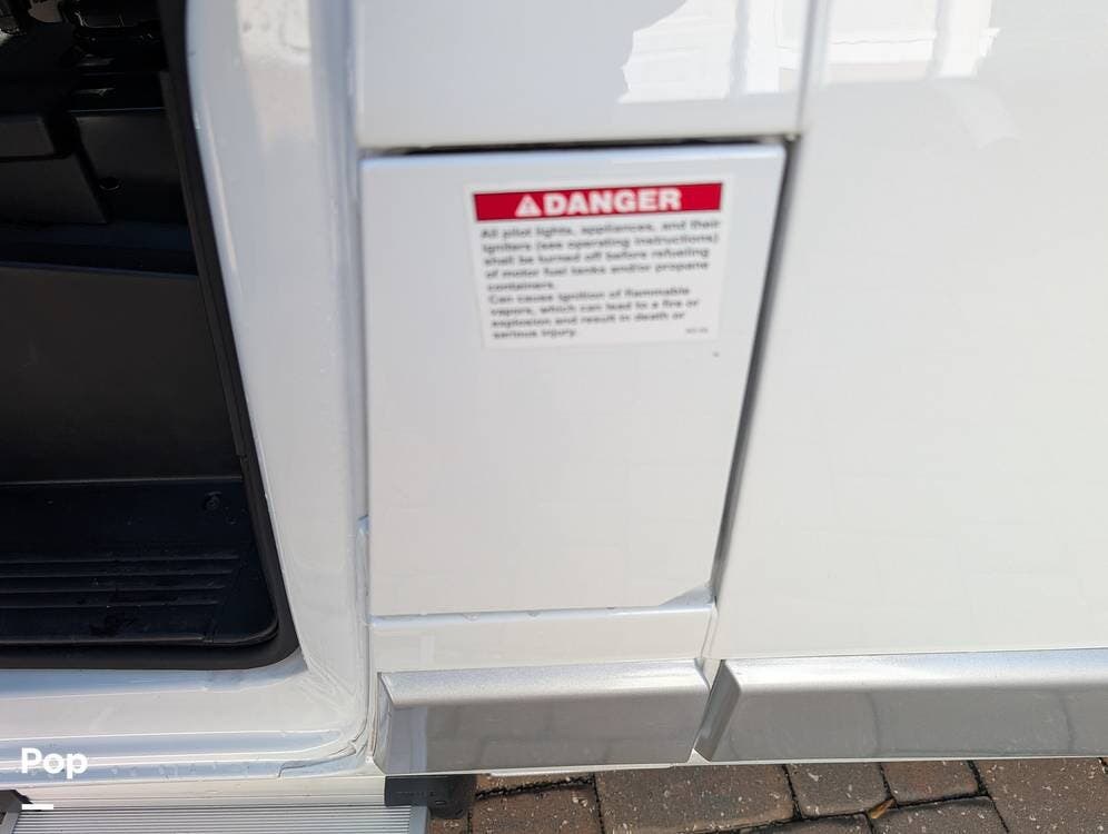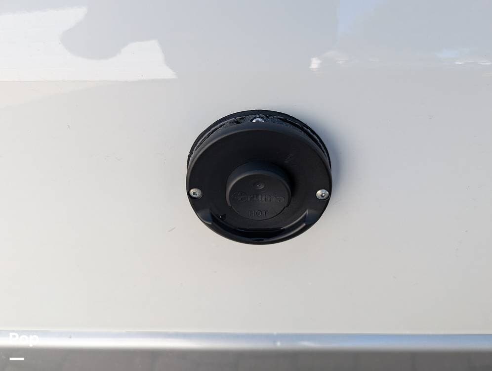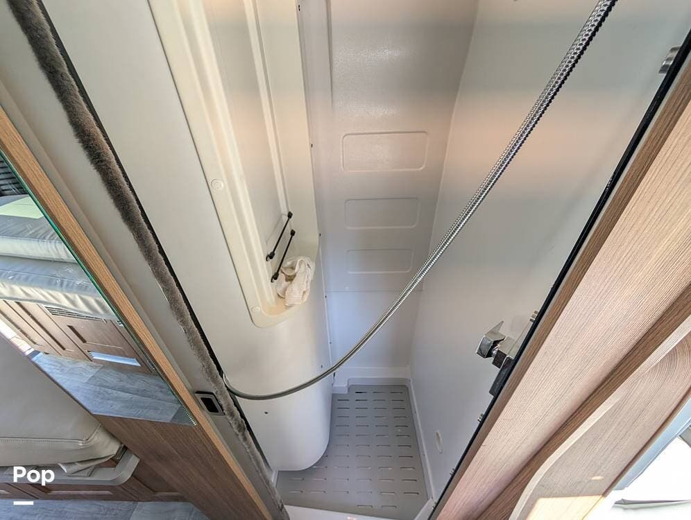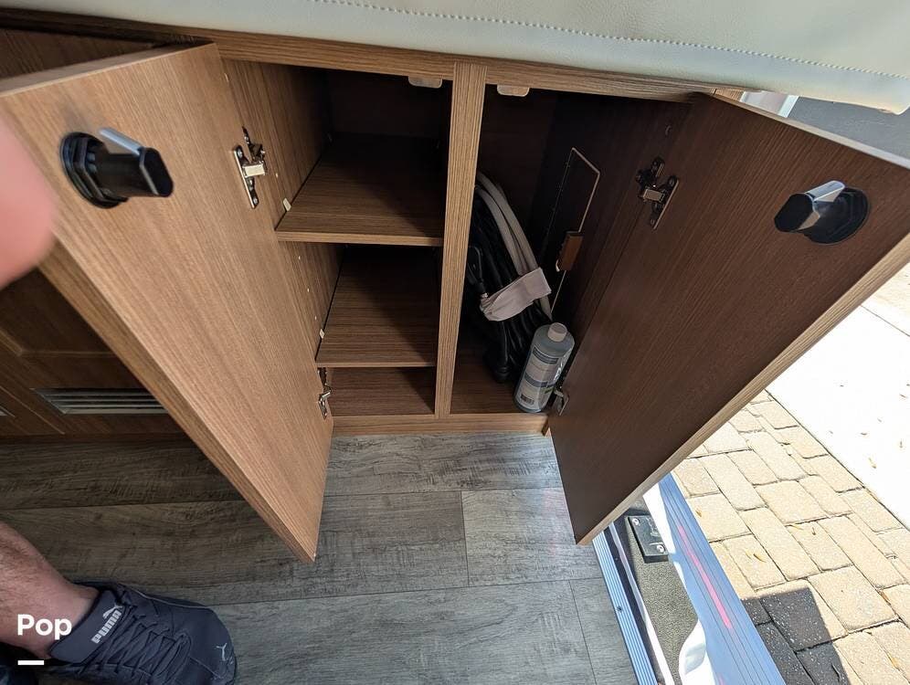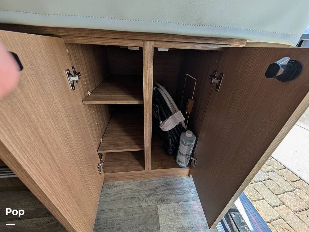 The galley kitchen is both sleek and efficient, featuring an induction cooktop, a stainless steel sink, a microwave, a refrigerator, and generous cabinetry for storage. The enclosed wet bath offers a shower, toilet, sink, and smart storage, allowing you to remain fully self-contained wherever your travels take you. Outside, a power awning instantly expands your living space for relaxing or entertaining.