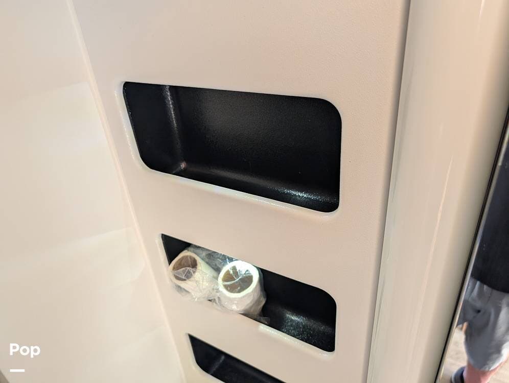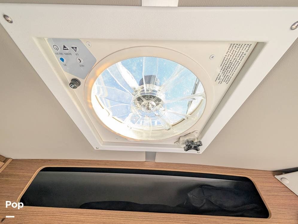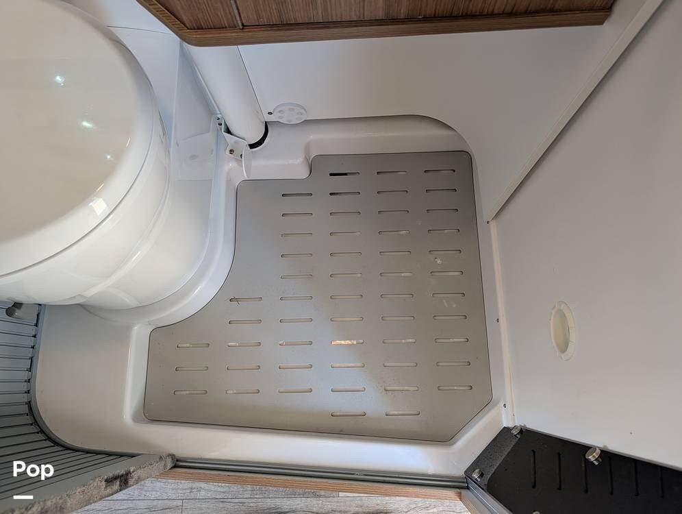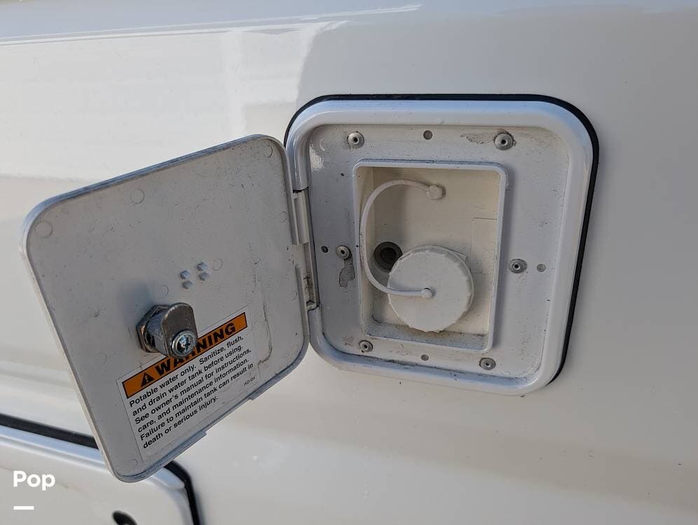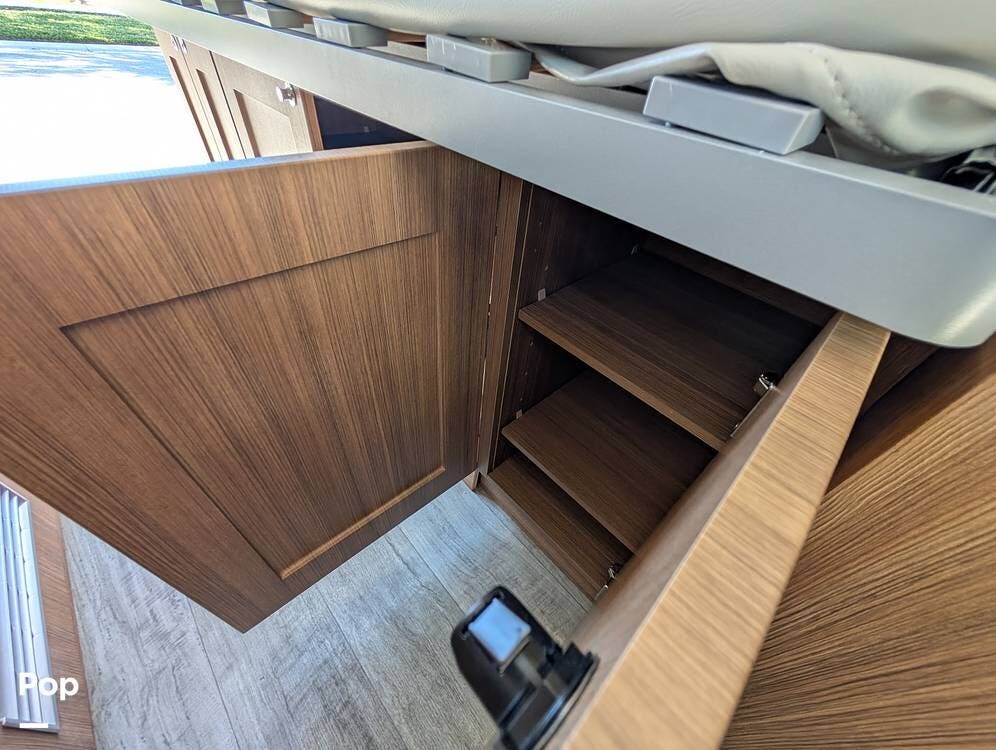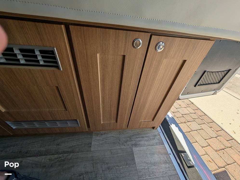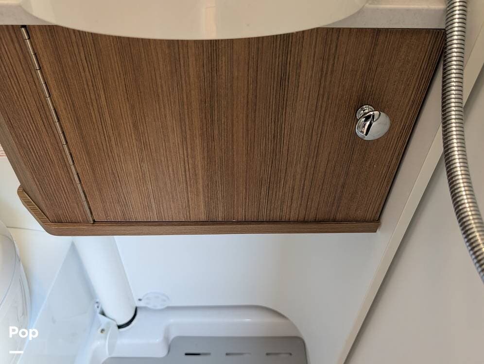 The galley kitchen is both sleek and efficient, featuring an induction cooktop, a stainless steel sink, a microwave, a refrigerator, and generous cabinetry for storage. The enclosed wet bath offers a shower, toilet, sink, and smart storage, allowing you to remain fully self-contained wherever your travels take you. Outside, a power awning instantly expands your living space for relaxing or entertaining.