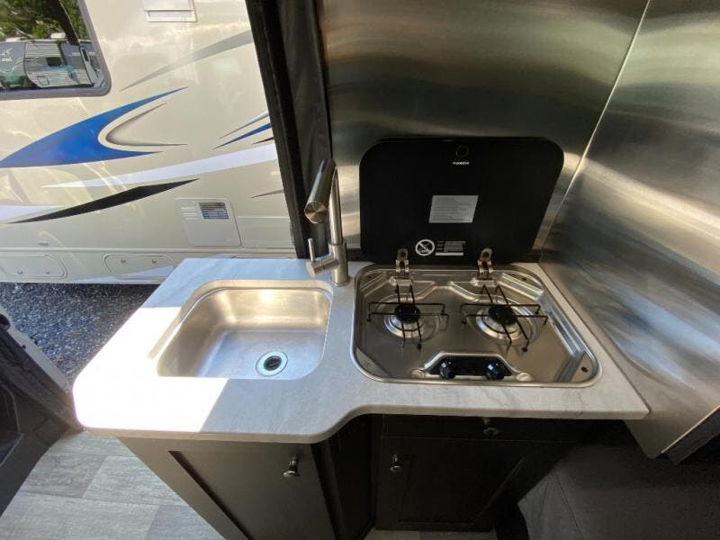 This is the perfect motorhome to take out when you're ready to play! You'll find plenty of storage space for items small and large, including a large pot drawer in the kitchen! The side-facing rear power sofas can convert to twin beds or a king-size bed, plus you can add the optional folding mattress to go over the front captain's seats if a grandkid tags along. Prepare breakfast on the two-burner propane stove or use the microwave oven if you're on-the-go. The wet bath with a sink, shower and toilet will allow you to freshen up after a day of hiking, and the 13' power awning outdoors will provide shade if you choose to dine outdoors for dinner.