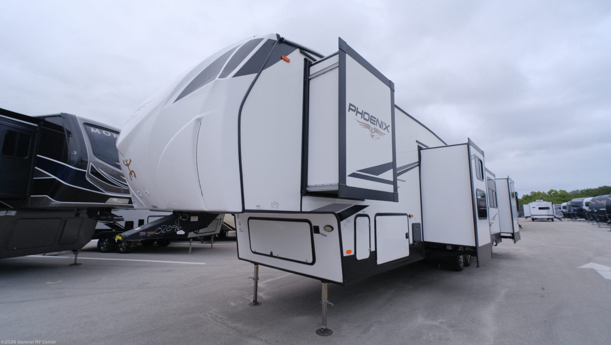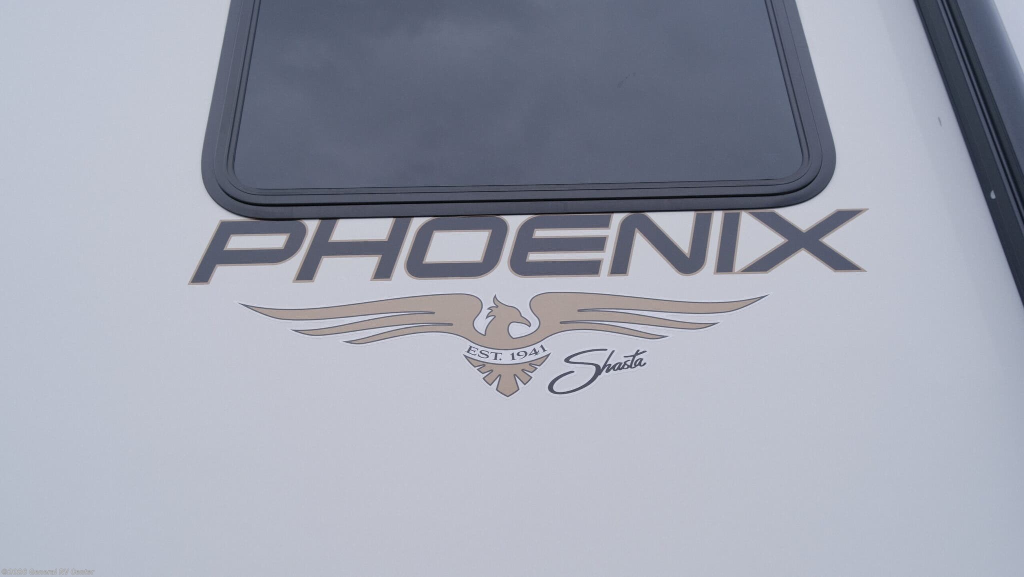 **Shasta RVs Phoenix fifth wheel 373MBRB highlights:** * Dual Entry Doors * Three Bedrooms * Bunk Beds * Two Full Bathrooms * Outside Kitchen You can bring the whole family and extra friends with this fifth wheel! The front private bedroom has a queen bed with nightstands on either side, a wardrobe slide, and a wardrobe that is prepped to add a washer and dryer. Just outside the bedroom is one of the full bathrooms which has a shower with a seat and is next to the second bedroom which has a set of 48" x 64" double bunk beds slide and overhead cabinets. The third bedroom is in the rear with a 30" x 65" flip down bunk above a tri-fold hide-a-bed sofa slide across from a dresser and an entertainment center, plus it's very own full bathroom that has one of the entrance/exit doors to the unit. With a fully equipped kitchen, you can prepare your best home cooked meals or you can even cook them at the outside kitchen and watch the big game with the outside entertainment center! With any Phoenix mid-profile fifth wheel by Shasta RVs, the stand out construction features include residential 5" truss rafters, full walk-on roof decking, vacuum bonded and aluminum framed sidewalls with rot proof AZDEL composite sidewall panels. The Weather Shield+ offers cold and hot testing, space age reflective technology, a ducted furnace to an enclosed, insulated and heated underbelly and more so you can camp during any season you wish. You will appreciate the convenience of the outside convenience center which includes black tank flush, a hot/cold shower, water filtration prep, and water heater bypass. Don't give up luxury and high-end features when you camp, choose a Phoenix!