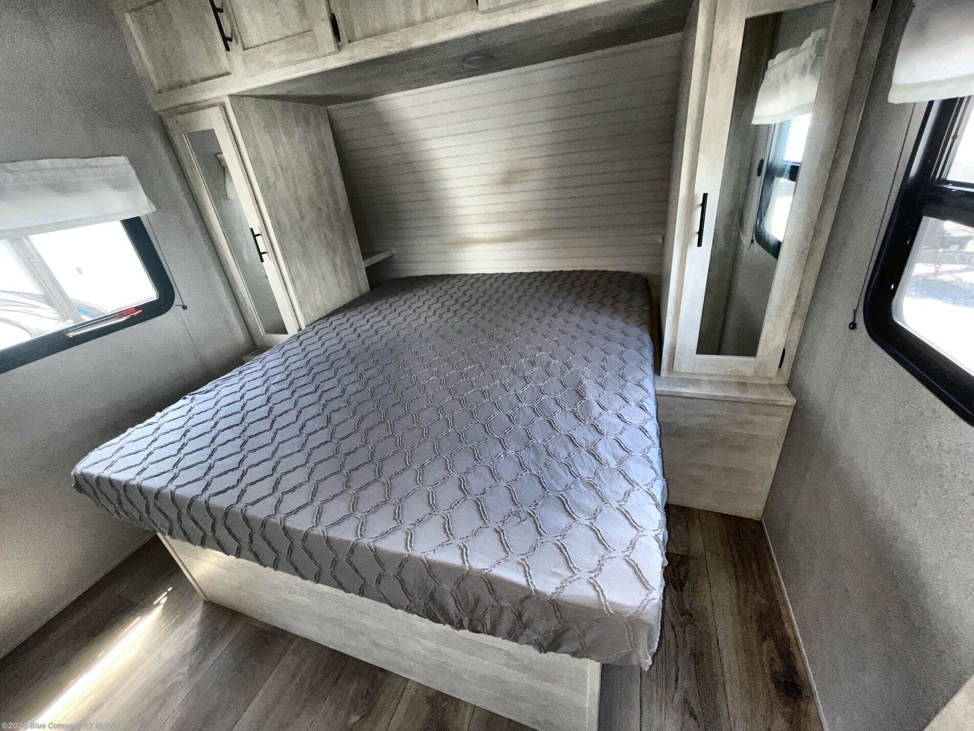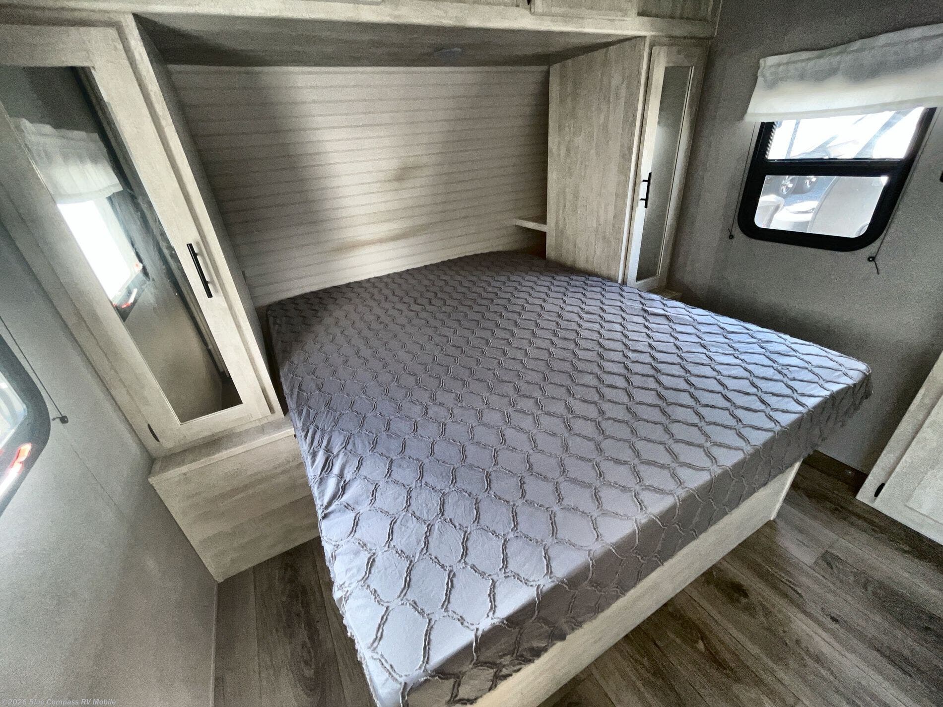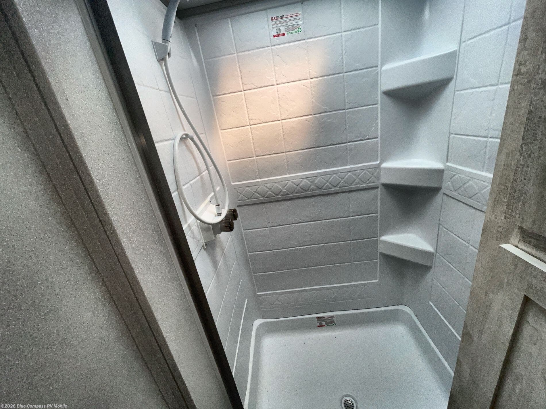 The light cabinetry and a cozy sofa plus the extra floor space from the slide out allow you to relax and unwind before exploring outdoors! There is a pantry and 10 cu. ft. residential refrigerator as you enter, and the kitchen has an L-shaped counter with extended countertop along one side. There is an entertainment center, a walk-around RV queen bed up front with wardrobes and an overhead cabinet for storage. The rear corner bathroom is complete with a 24" x 40" shower and linen storage. And the pass-through compartment allows for the larger items like camping chairs and outdoor tables, while the power awning provides some protection from the elements.