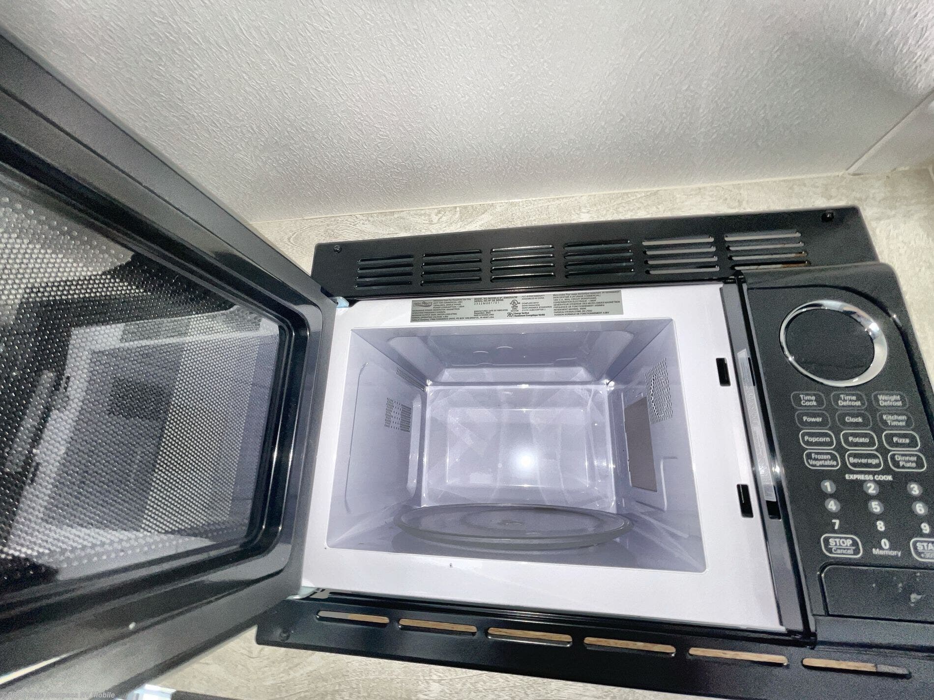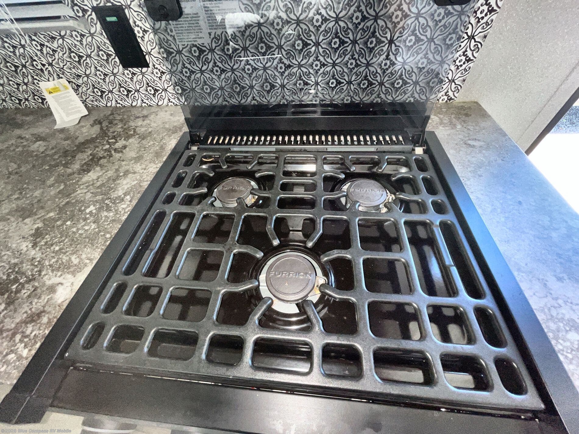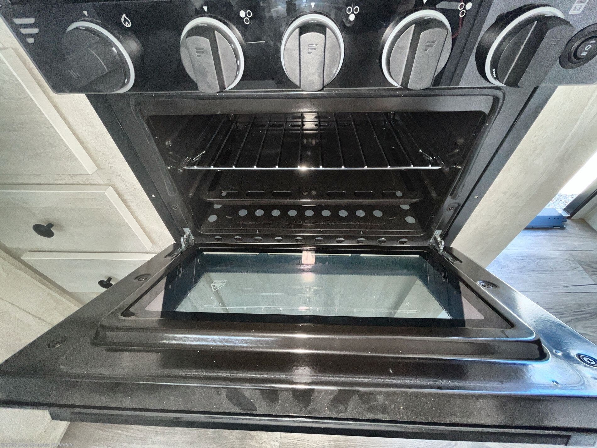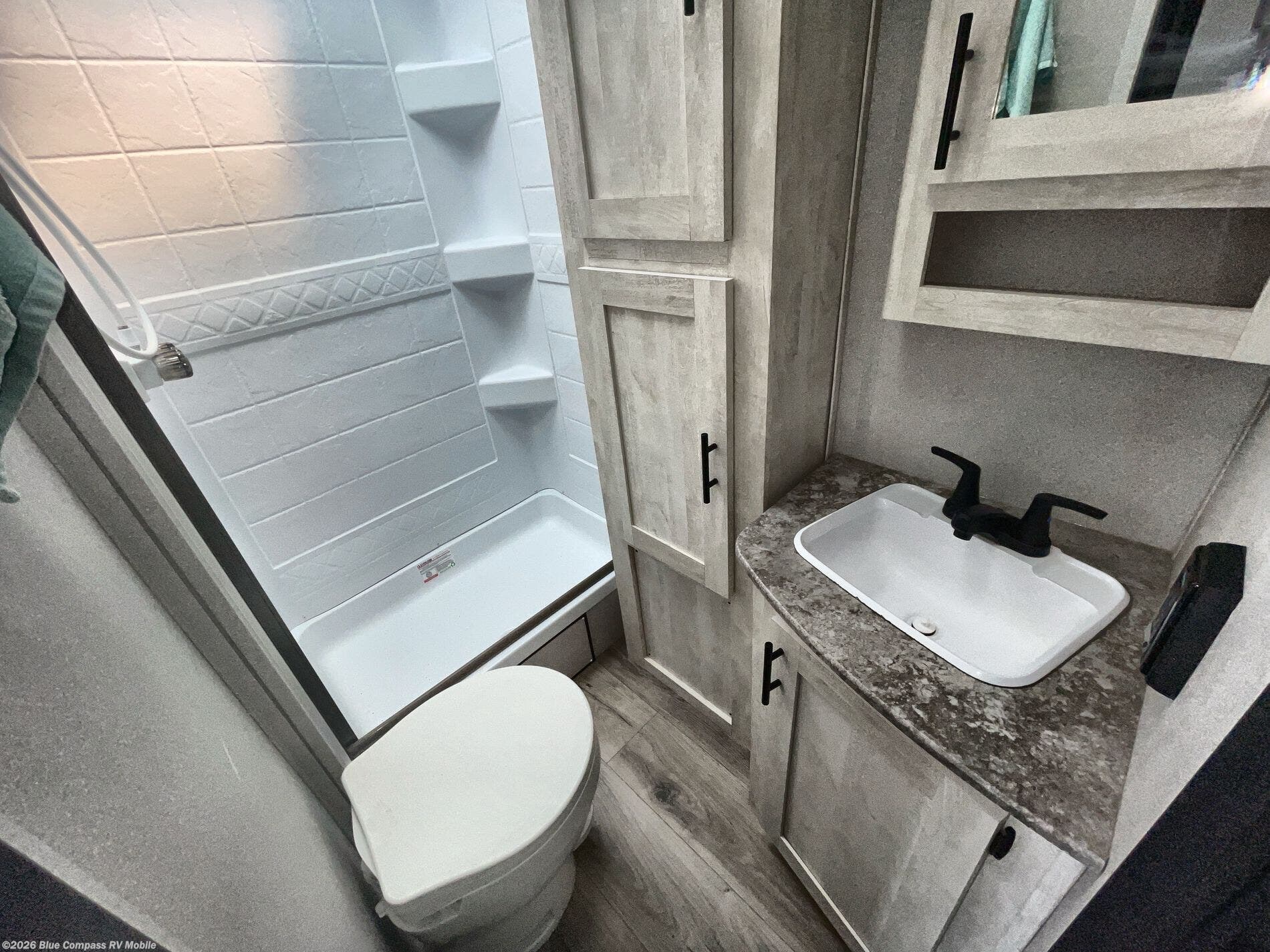The light cabinetry and a cozy sofa plus the extra floor space from the slide out allow you to relax and unwind before exploring outdoors! There is a pantry and 10 cu. ft. residential refrigerator as you enter, and the kitchen has an L-shaped counter with extended countertop along one side. There is an entertainment center, a walk-around RV queen bed up front with wardrobes and an overhead cabinet for storage. The rear corner bathroom is complete with a 24" x 40" shower and linen storage. And the pass-through compartment allows for the larger items like camping chairs and outdoor tables, while the power awning provides some protection from the elements.