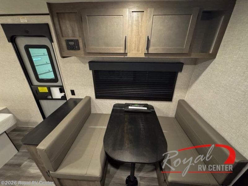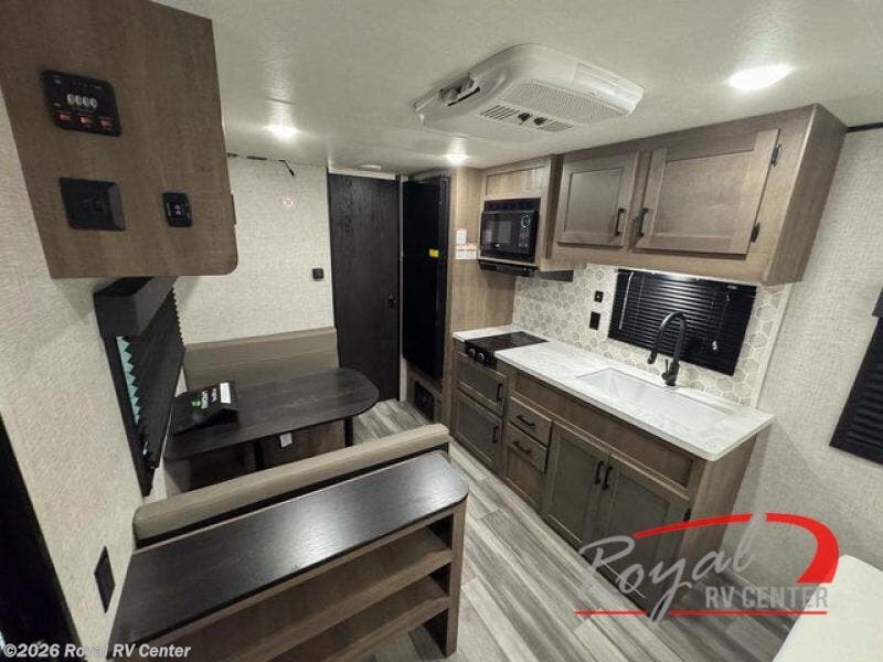 This cozy travel trailer features a front walk-around bed that provides a comfortable place to relax after a day of adventure. The booth dinette easily converts into additional sleeping space, allowing up to three campers to stay comfortably.