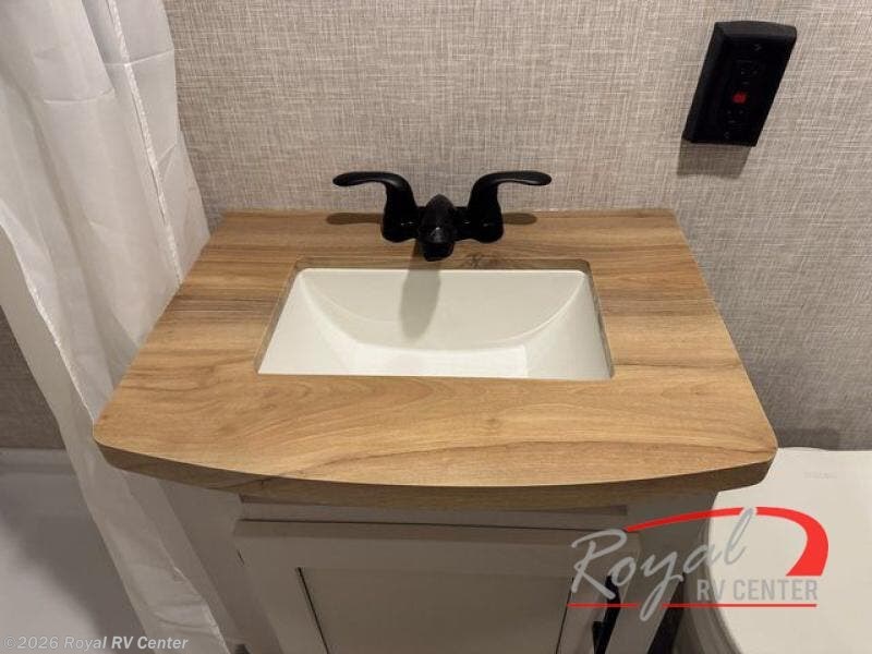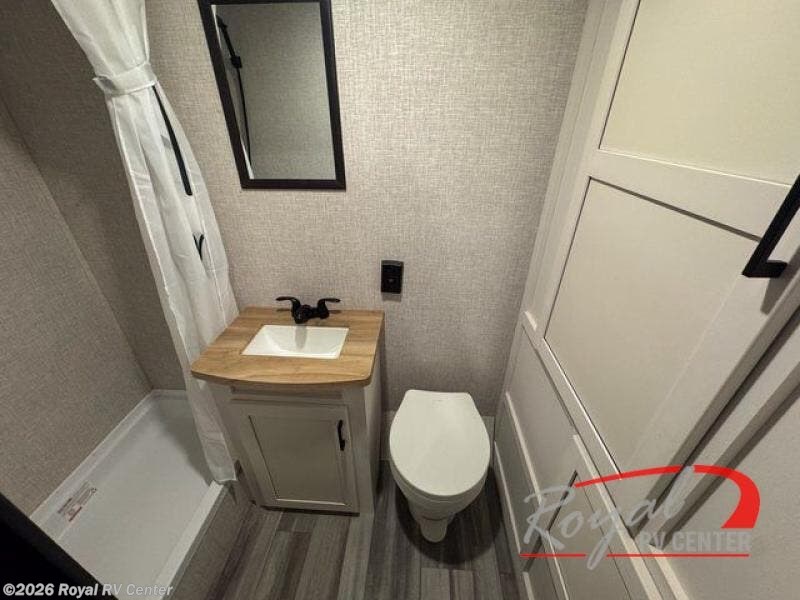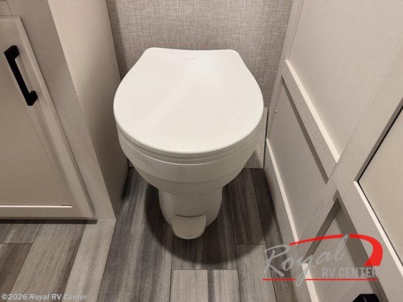 The full rear bathroom includes a foot-flush toilet, powered bath vent, and a dedicated bath wardrobe for towels and toiletries, giving you the comfort of home while traveling.