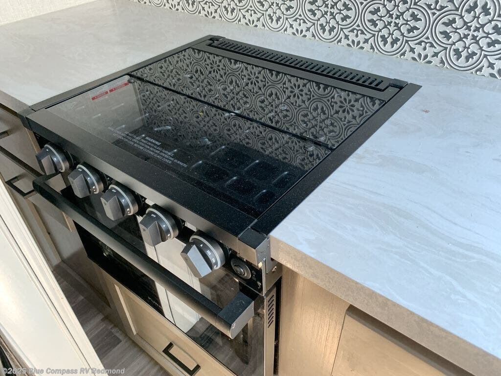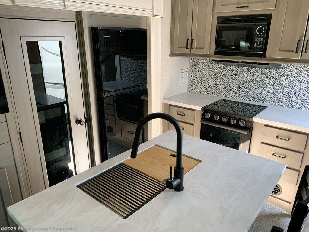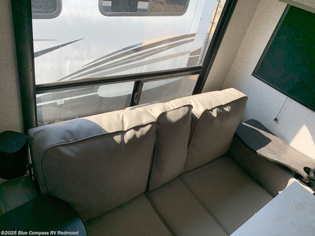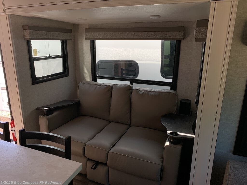 Start living your best camping lifestyle in this fifth wheel! A rear bi-fold sofa offers a comfortable place to relax after swimming in the water. When your stomach starts rumbling head to the fully equipped kitchen to prepare a meal with the three burner cooktop, large pantry, and kitchen island with two bar stools so you can sit down while chopping veggies. The table with two chairs slide offers a comfortable place to dine at, but you could also switch it out for either an optional theater seat or an optional booth dinette. The full bathroom has a shower for you to rinse the sand out of your hair, and the front private bedroom has a queen bed for you to get a good night's rest. The exterior has storage space, a 13' power awning, an outside TV hook-up area, and grill hook-up area!