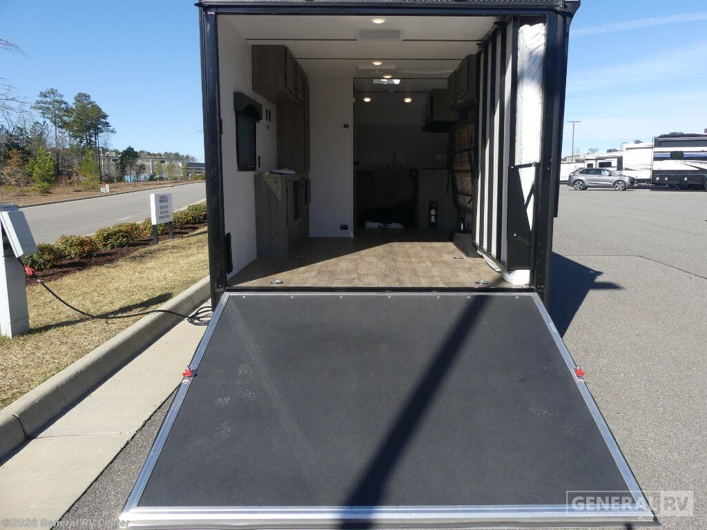 Sunset Park RV Sun Lite toy hauler travel trailer 21TH highlights: Up to 13' 4" of Toy Parking Space Fold-Down 60" x 74" Bed Sofa Front Kitchen Layout Get ready for a great camping experience where you can take along your favorite ride-on toys, kayaks, or other items that you may not normally have room to load as this toy hauler features up to 13' 4" of cargo space that can easily be loaded using the rear ramp door. Once unloaded, set up with the fold-down 60" x 74" bed that will make for a great night's rest. There is also a jiffy sofa that can transform into added sleeping space at night. The kitchen amenities will make it easy to create a warm meal, and you can get cleaned up and refreshed in the bathroom with tub/shower and toilet. You can trust the build and enjoy your experience with any one of these Sunset Park RV Sun Lite travel trailers or toy haulers! Their aerodynamic profile is not only easy to haul, but also saves on fuel. They are built to withstand years of traveling even though they are lightweight with a diamond plate rock guard, a one piece PVC roof membrane, Dexter Spring-Leaf axles, and tinted safety glass windows. Some comfort standards you are sure to enjoy are the two-burner stove top range with hood, light and fan, plus the refrigerator and microwave, and an outside shower to help keep the dirt outdoors where it belongs.