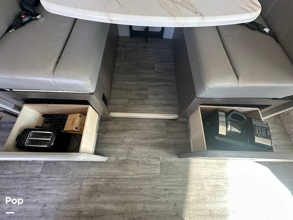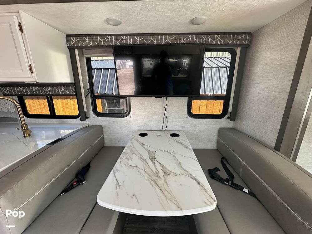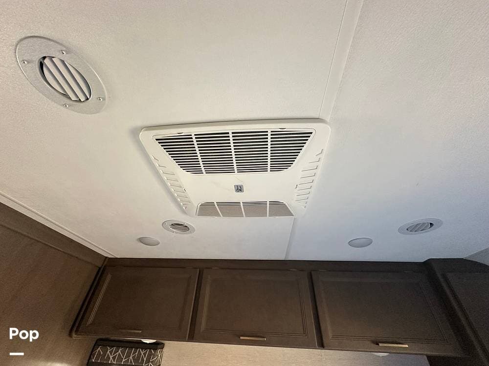 Inside, this rig is roomy and airy. A large slide provides ample room in the living area and the kitchen area. The windows in the slide let in a lot of natural light.