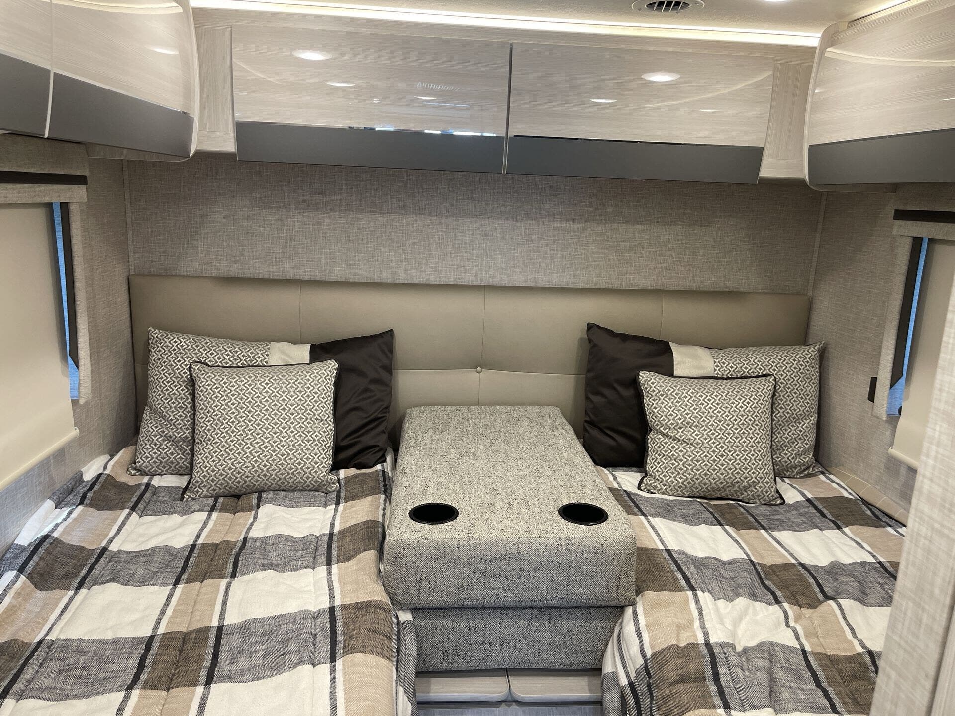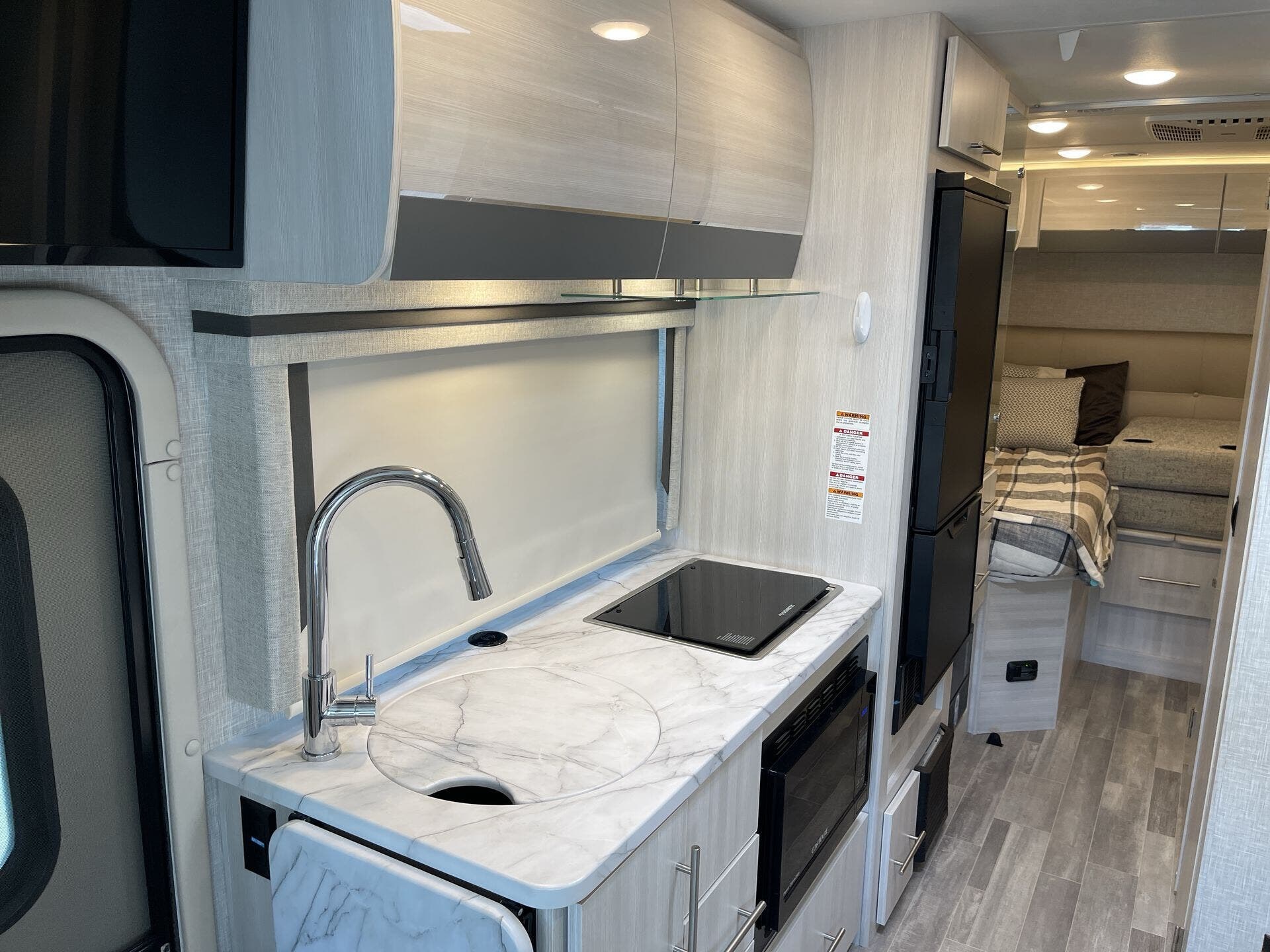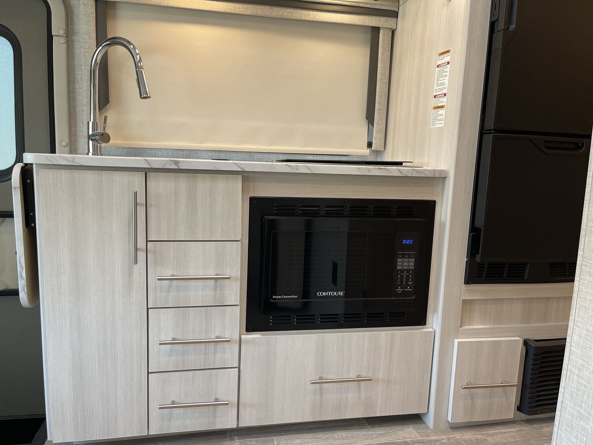 Inside, the layout emphasizes both comfort and flexibility. It sleeps up to four with twin rear beds that convert into a king-sized bed, plus a cab-over bunk. The central living area has a jackknife sofa and Dream Dinette®, both on the slide-out, optimized for dining and relaxation. The compact galley kitchen includes a dual-mode refrigerator, two-burner cooktop, convection microwave, and stainless sink. The center bathroom offers a shower, toilet, and vanity—all set beneath 80″ ceilings with residential vinyl flooring and LED lighting.