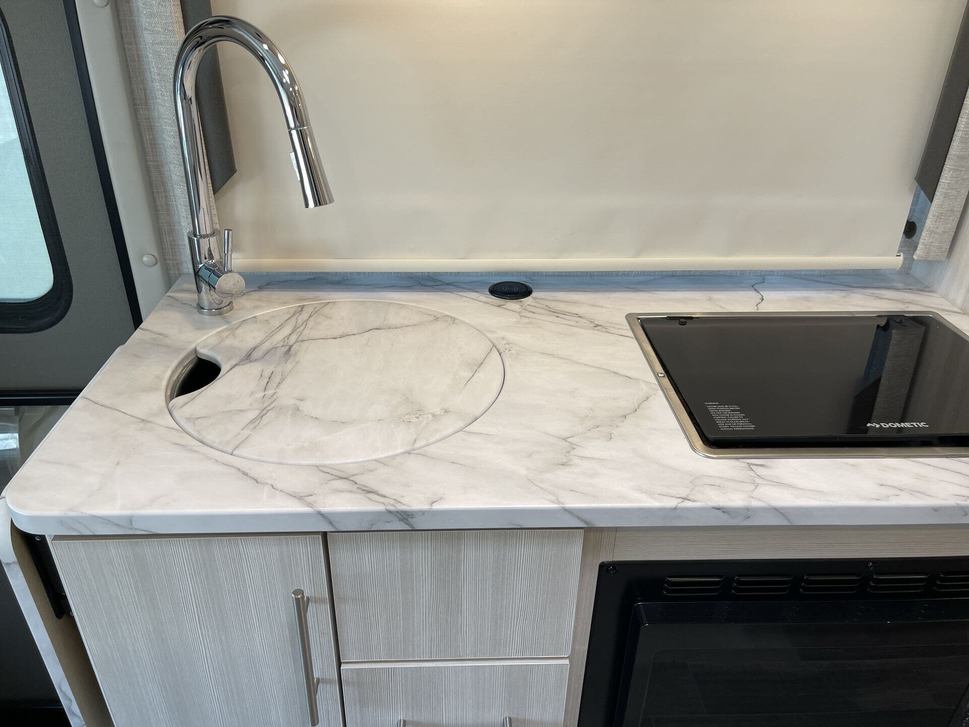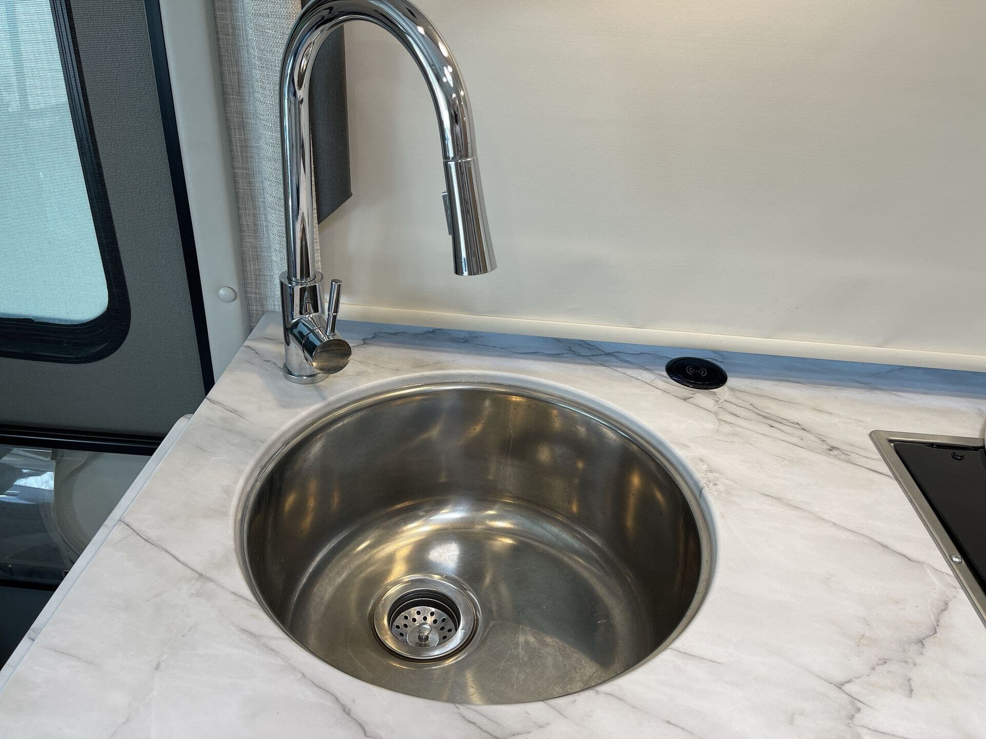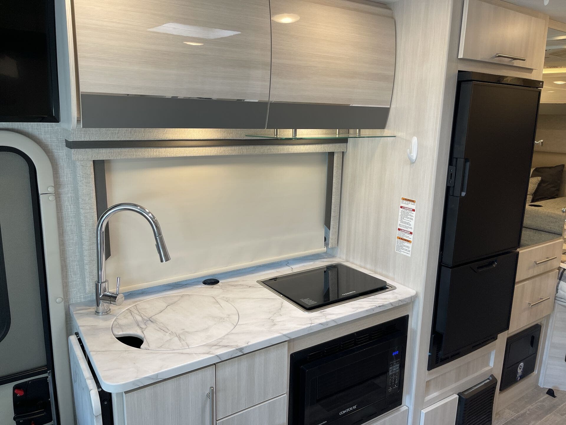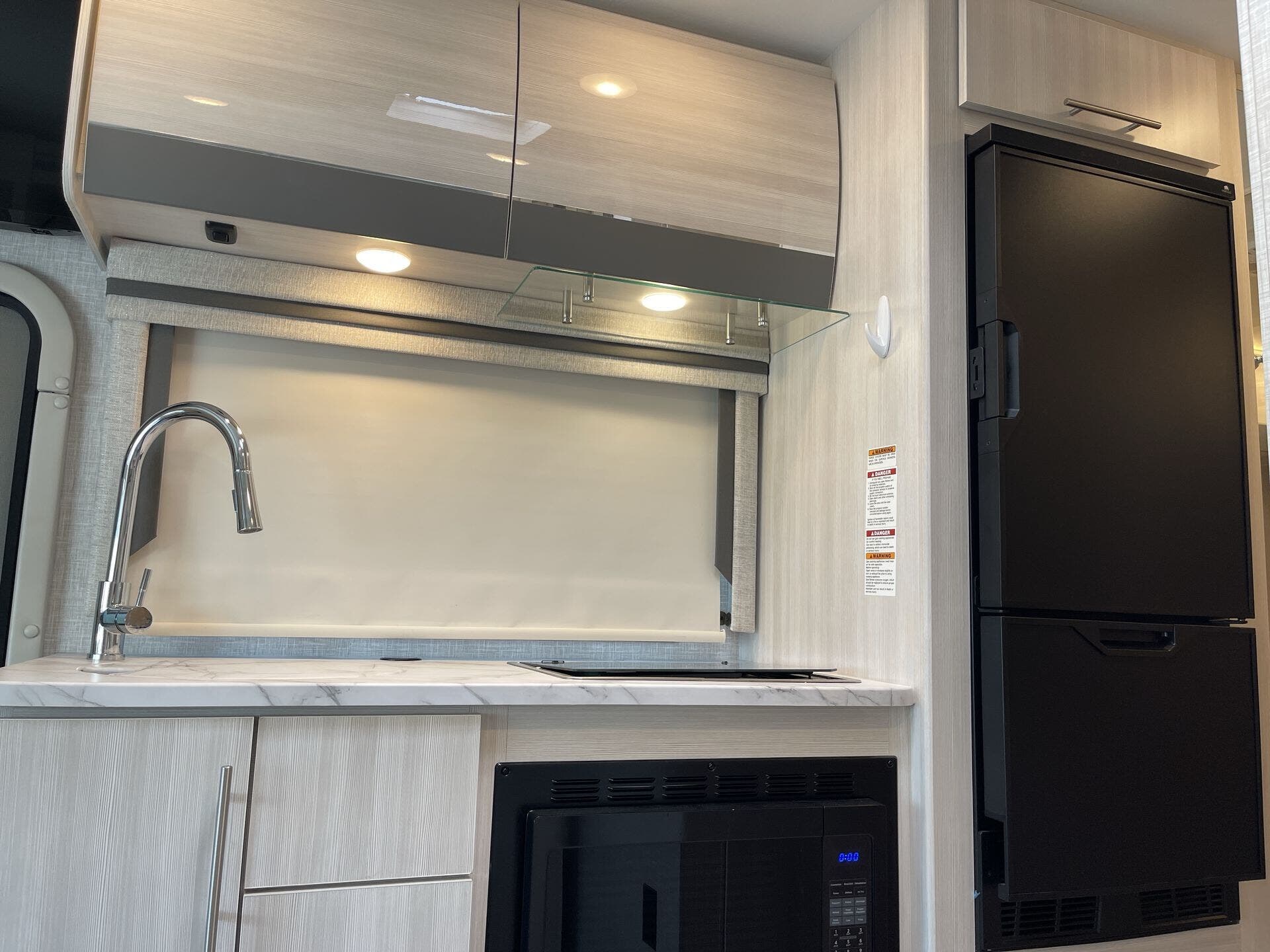 Inside, the layout emphasizes both comfort and flexibility. It sleeps up to four with twin rear beds that convert into a king-sized bed, plus a cab-over bunk. The central living area has a jackknife sofa and Dream Dinette®, both on the slide-out, optimized for dining and relaxation. The compact galley kitchen includes a dual-mode refrigerator, two-burner cooktop, convection microwave, and stainless sink. The center bathroom offers a shower, toilet, and vanity—all set beneath 80″ ceilings with residential vinyl flooring and LED lighting.
