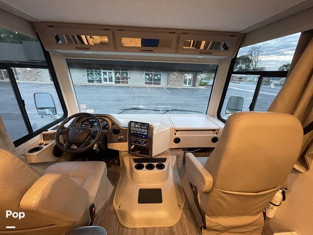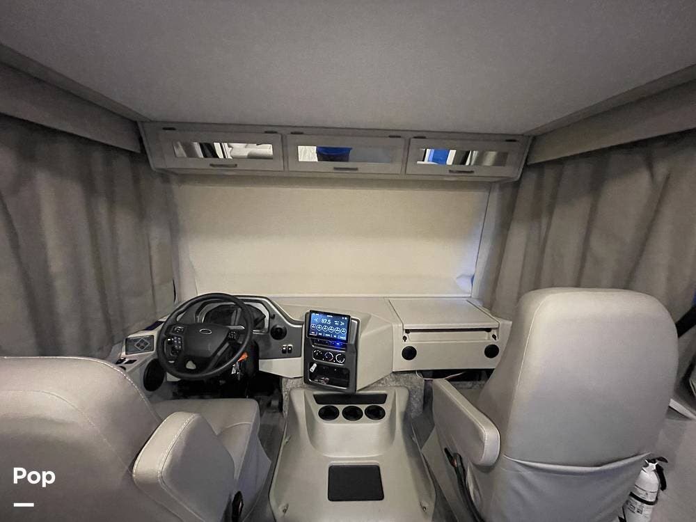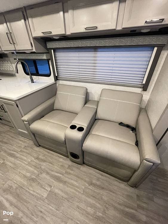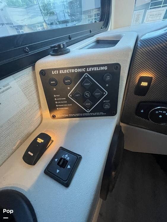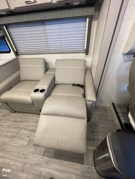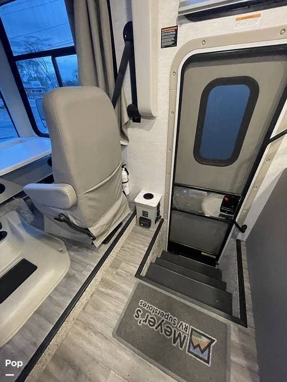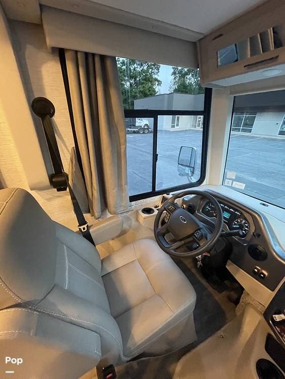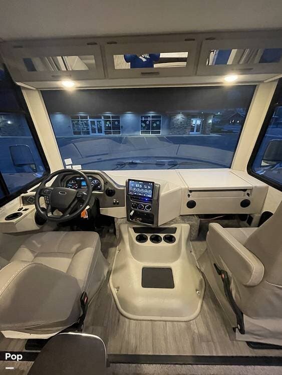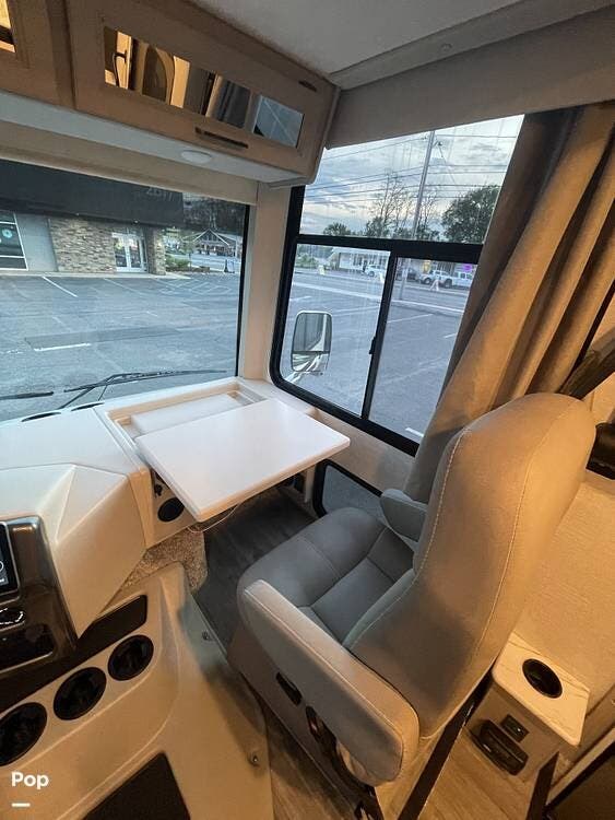 Walking in this almost new RV, to your left are the nicely appointed driver and passenger seats. All the main controls are facing the driver, and there is a small pull-out tray available for the passenger.