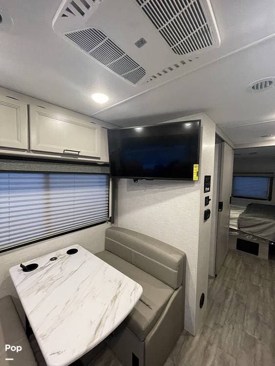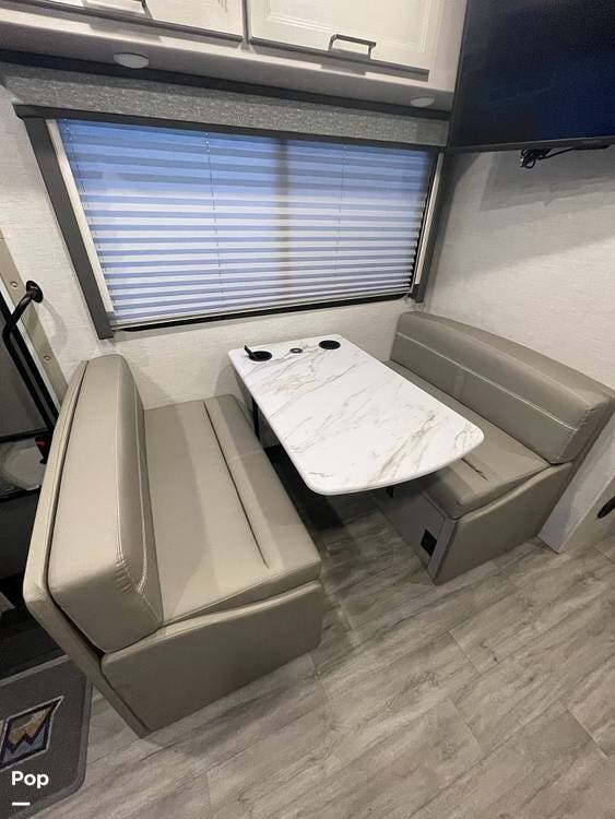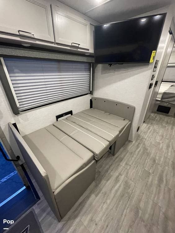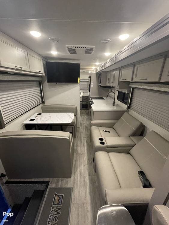 Walking in towards the rear, there is a leather twin recliner sofa, and opposite it is a nice-sized dinette that converts to a sleeping area for 2. There is a large TV above the dinette.