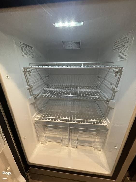 Back further, you will find the well-appointed kitchen area, which includes the stove, refrigerator, plenty of cabinet space, and a double kitchen sink.