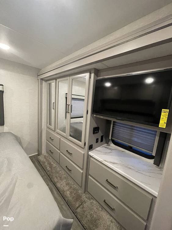 In the rear, you will find a king-size bed, a nice-sized size closet, and a TV.