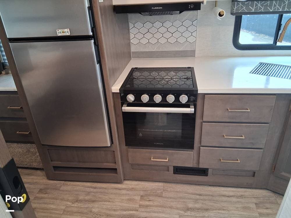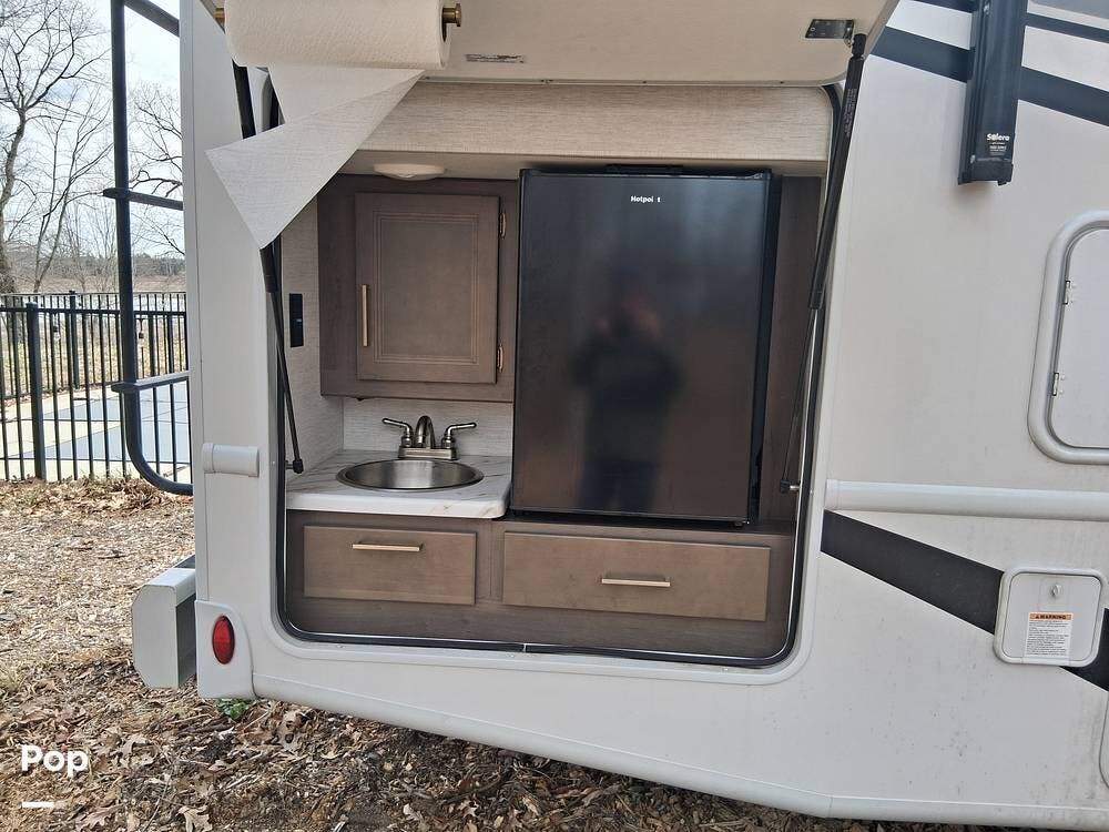 The kitchen is a chef's dream, with solid-surface countertops and a 12V refrigerator, but the real magic happens outside under the massive 19-foot power awning.