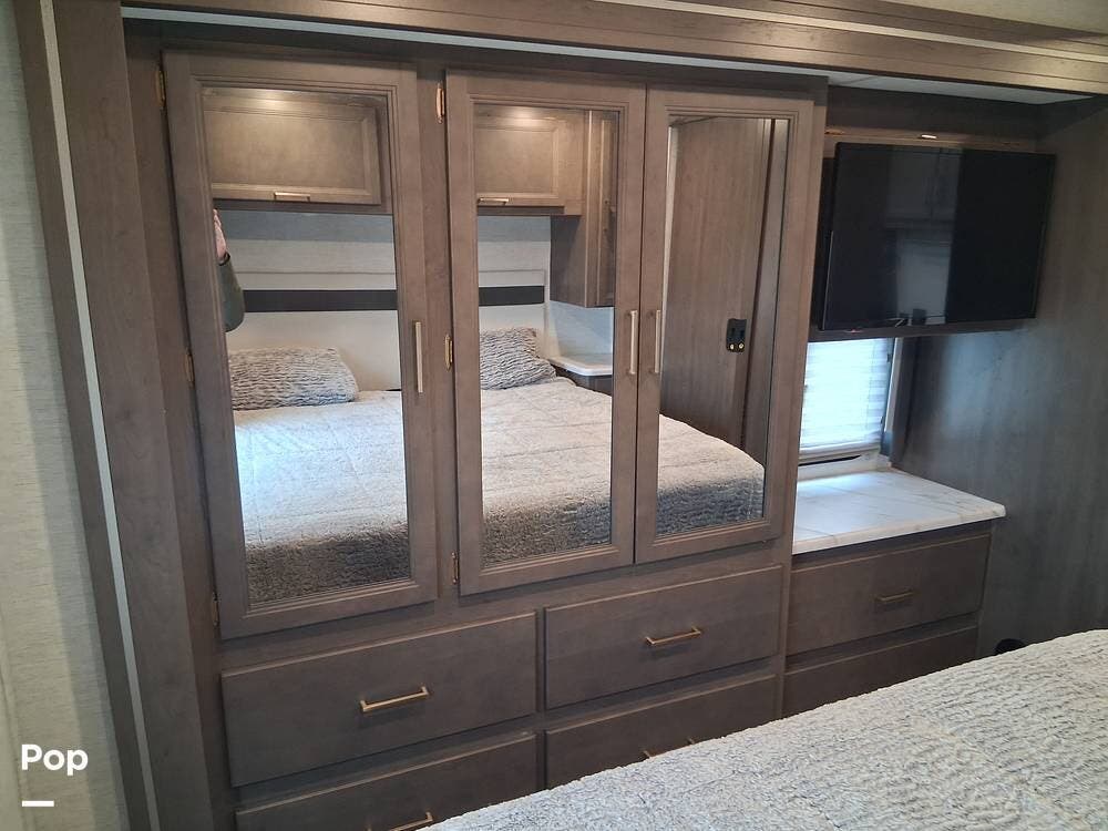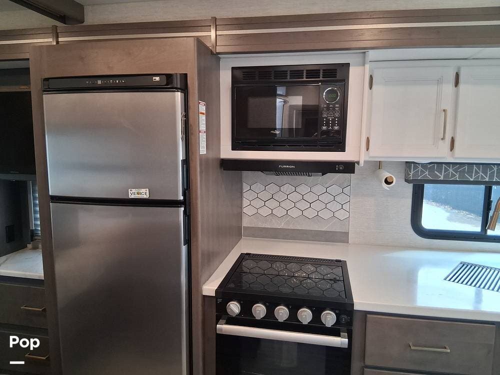 Whether you're tailgating with the exterior 32-inch swivel TV or whipping up lunch at the integrated outdoor kitchen, this coach is designed to make every destination feel like a private resort.