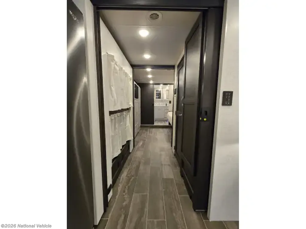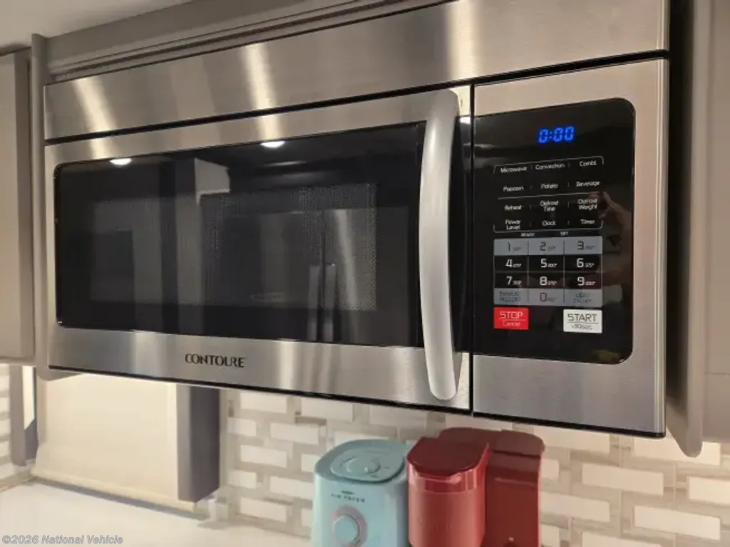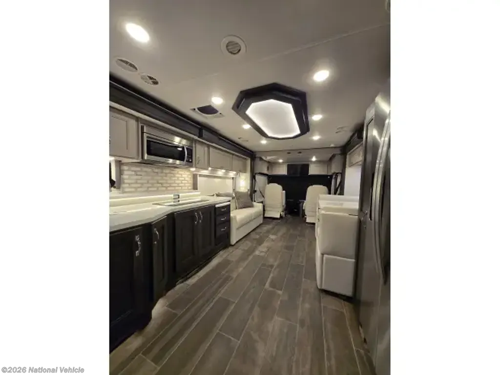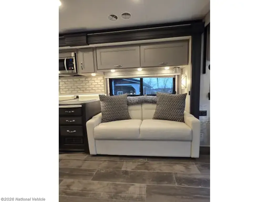 One of the standout features of the Thor Motor Coach Aria 4000 is its spacious interior layout, which includes a large living area, fully-equipped kitchen, and luxurious master bedroom, with a second, dedicated, full bath. The open floor plan creates a welcoming atmosphere, perfect for relaxing or entertaining guests on the road. The kitchen is equipped with high-end appliances, ample storage space, and a stylish design that will make meal prep a breeze.