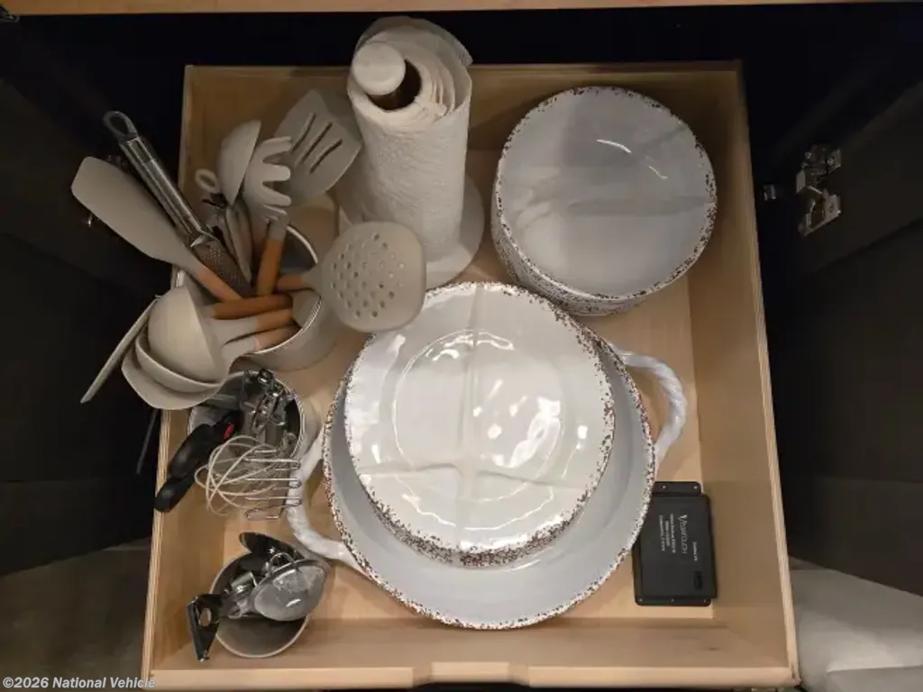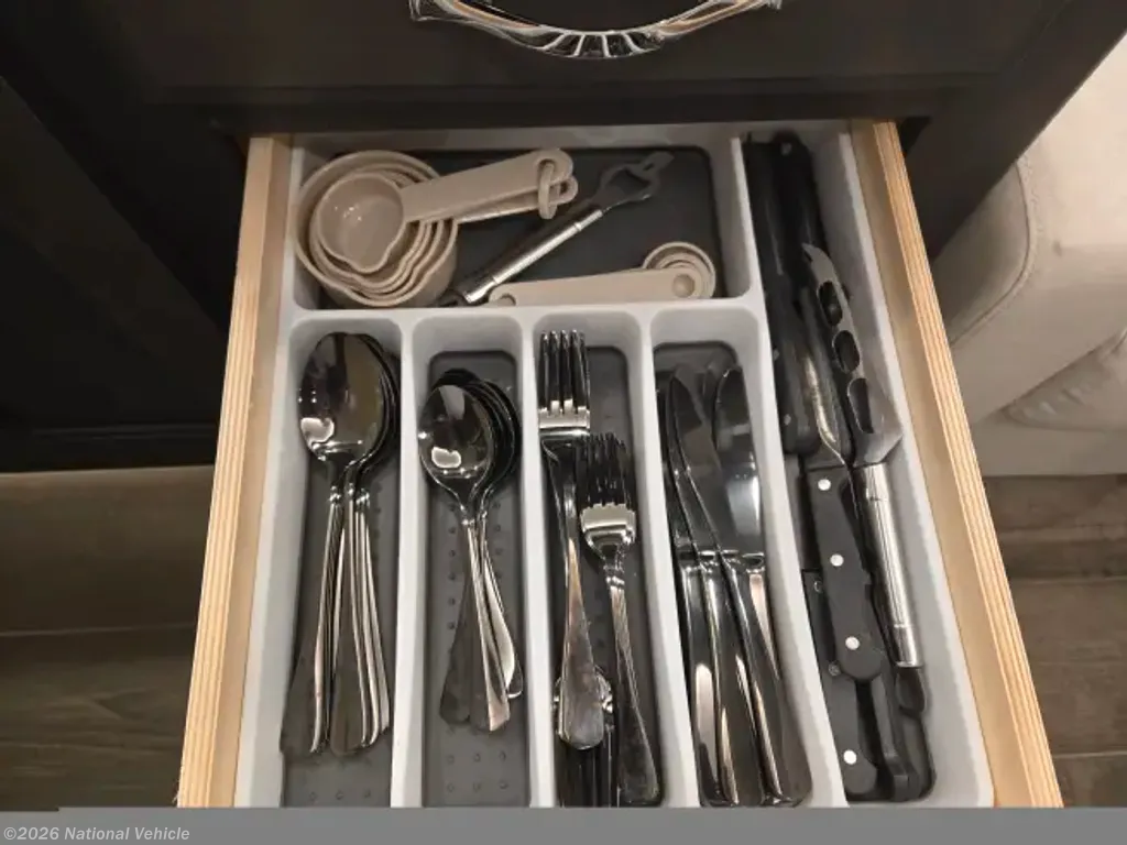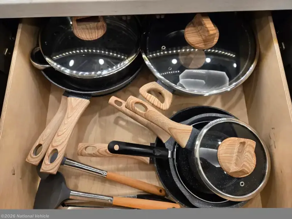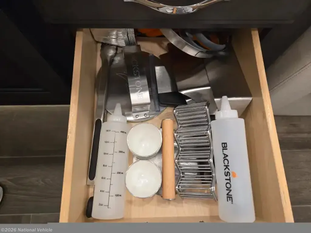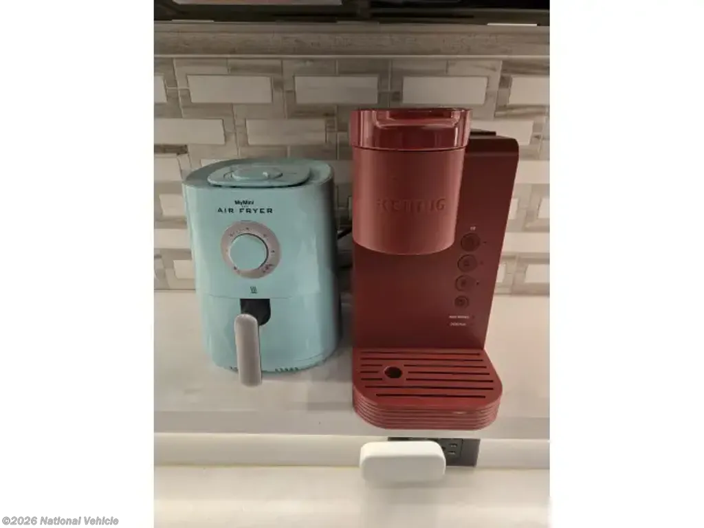 INCLUDED: Blackstone grill, SoloStove, air compressor lines & gear/attachments, fresh water hoses & attachments, 50 amp surge protector & 25' extension cable, new (unused) black/grey water hoses, kitchen silverware and cooking set with pots & pans, Keurig, air fryer, Dewalt tool set, safety equipment (wheel chocks, traffic cones, etc), exterior table and 4 chairs (2 rockers), all weather exterior ground carpet & more.