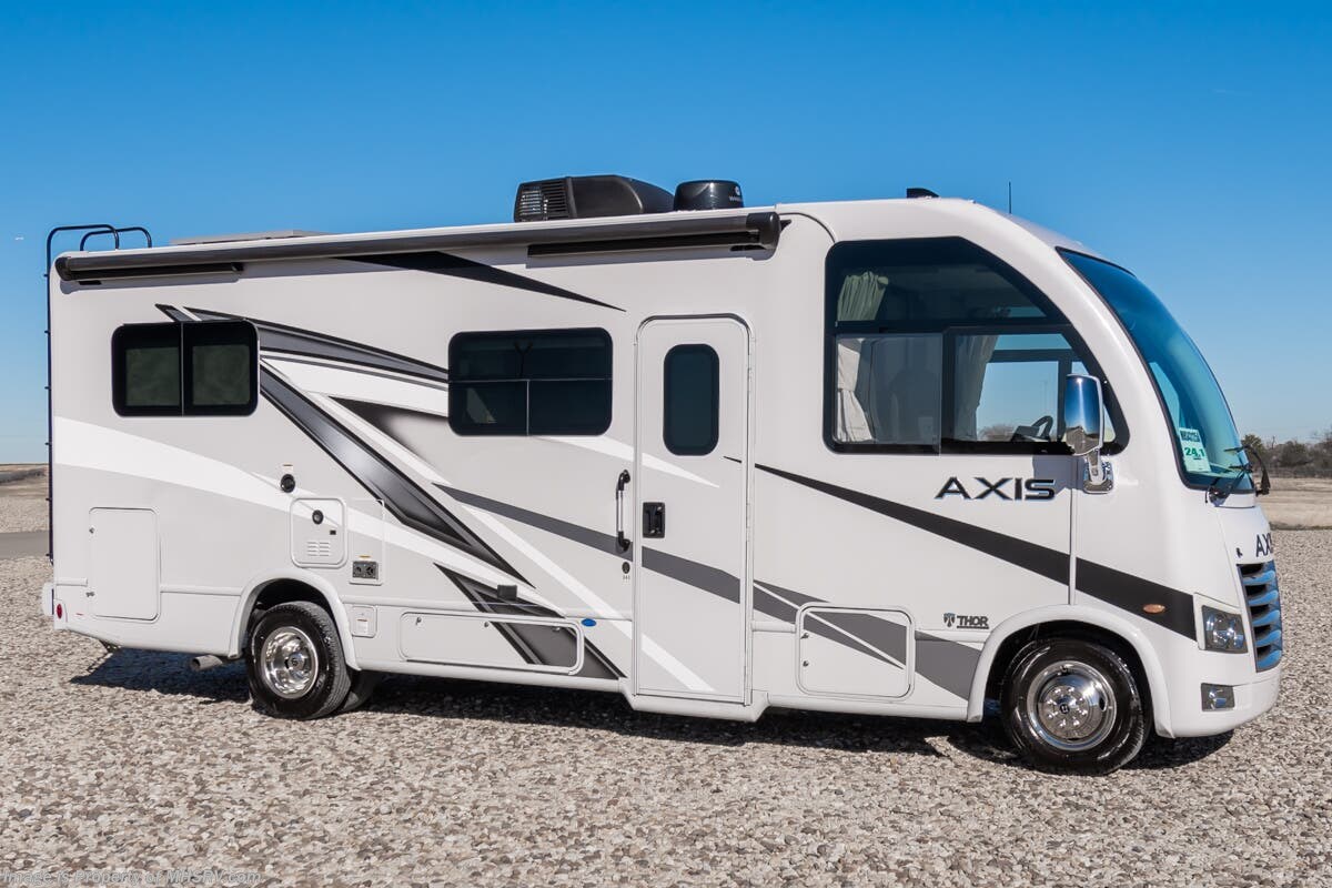 Used Thor Motor Coach RV for sale – 2024 Thor Motor Coach Axis 24.1 is approximately 25’ 8” in length with 6,237 Miles, 1 slide and features stabilizer jacks, 3 camera system, gas generator, Ford V8 gas engine, Ford chassis, tilt steering wheel, power visor, patio awning, pass through storage, LED running lights, black tank flush, exterior shower, ladder, solar, leather seating, 7 foot ceiling, hardwood cabinets, convection microwave, solid surface counter, overhead loft and much more. For additional details on this unit and our entire inventory including brochures, window sticker, videos, photos, reviews & testimonials as well as additional information about Motor Home Specialist and our manufacturers please visit us at or call 800-335-6054 for our Texas location or 334-288-0331 for our Alabama location. At Motor Home Specialist, we DO NOT charge any prep or orientation fees like you will find at other dealerships. Read Thousands upon Thousands of 5-Star Reviews at and See What They Had to Say About Their Experience at Motor Home Specialist.