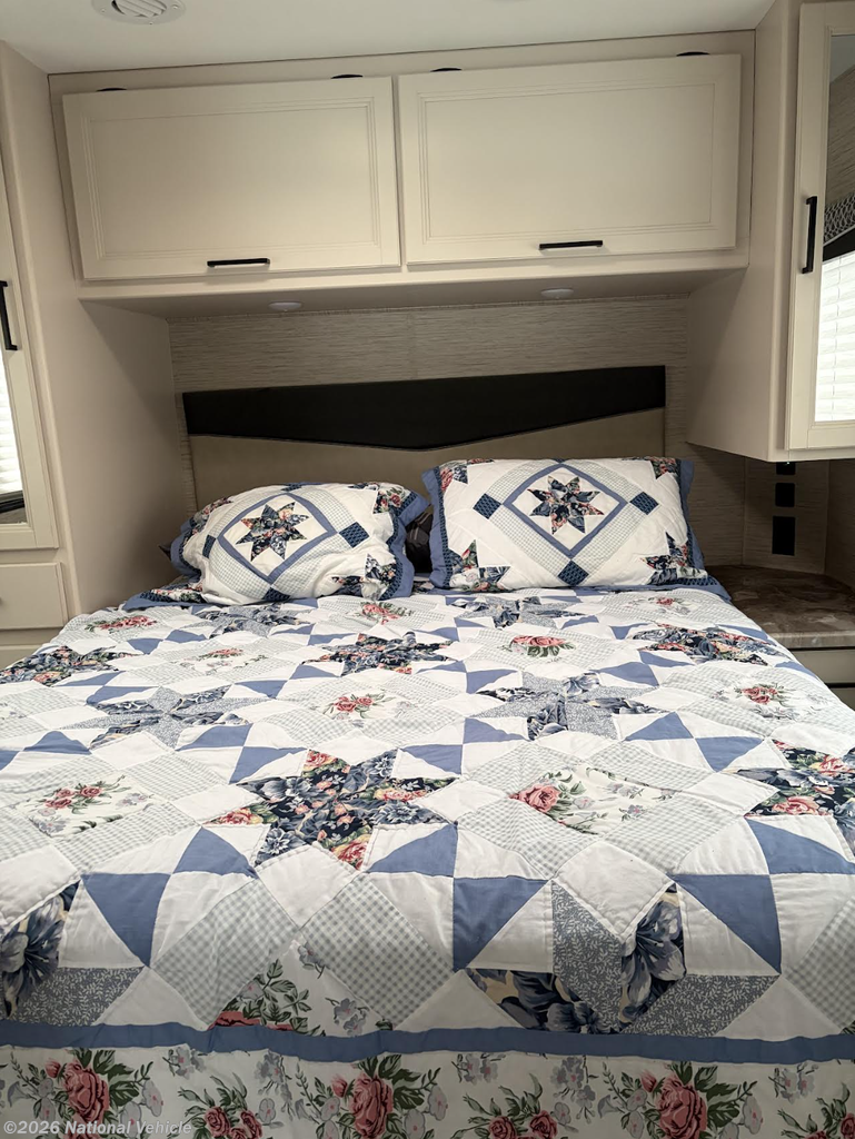 The spacious interior welcomes you with a private rear queen bedroom, enhanced by a brand-new mattress for hotel-quality sleep. Overhead, the extra-large 52" x 96" bunk over the cab provides generous sleeping space for guests or family. The slide out 76" Dream Dinette offers a comfortable gathering spot for meals, work, or relaxation, seamlessly tying together the living area.