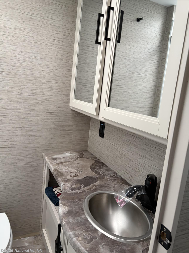Entertainment and convenience are built right in, with an in-dash media center, rear-view and side cameras, and the option for an exterior TV-perfect for tailgating or relaxing under the stars. Outside, enjoy the power patio awning with LED lighting, creating an inviting outdoor living space day or night.