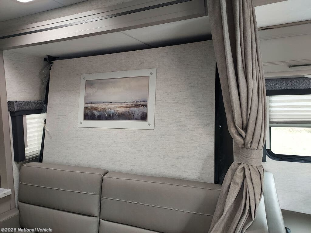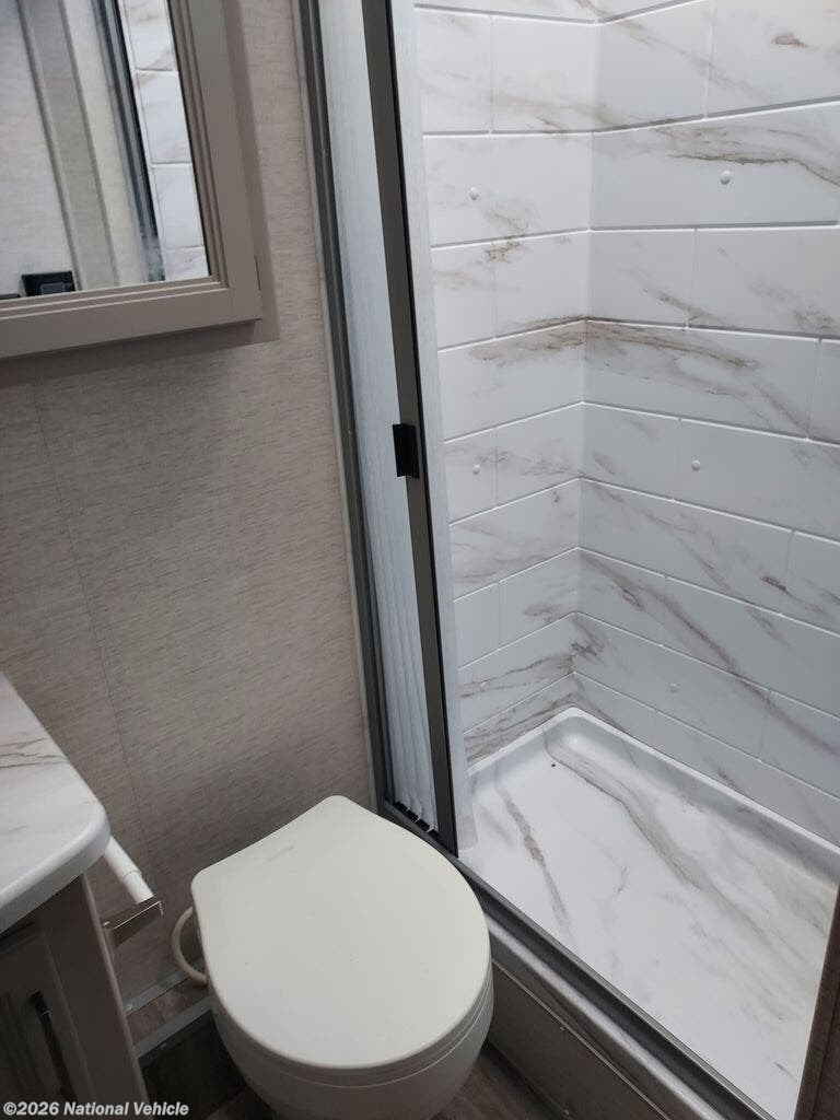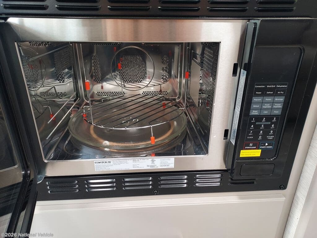 The fully equipped kitchen is centrally located and includes a 3-burner cooktop, convection microwave, mid-size refrigerator, and ample cabinetry, giving you everything needed to prepare meals on the road. In the rear, you?ll find a large, full-width bathroom with a shower, vanity, and generous storage-offering a level of space and convenience rarely found in a motorhome of this size.