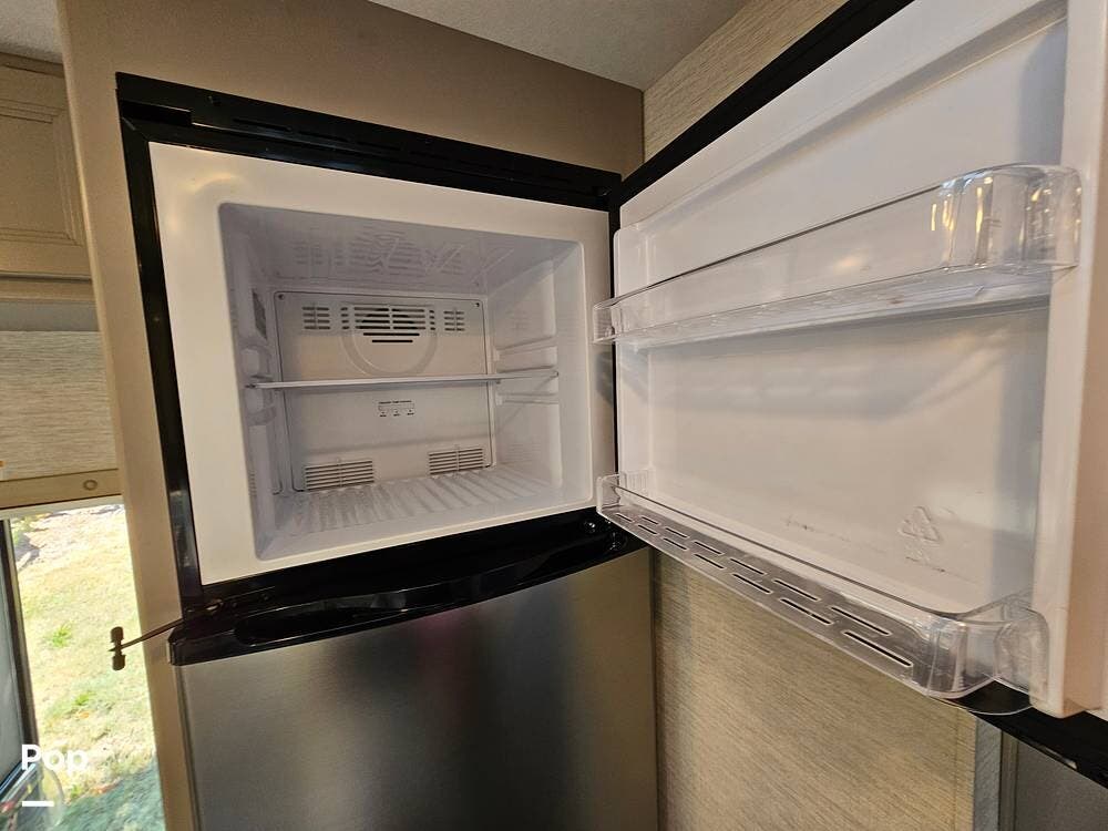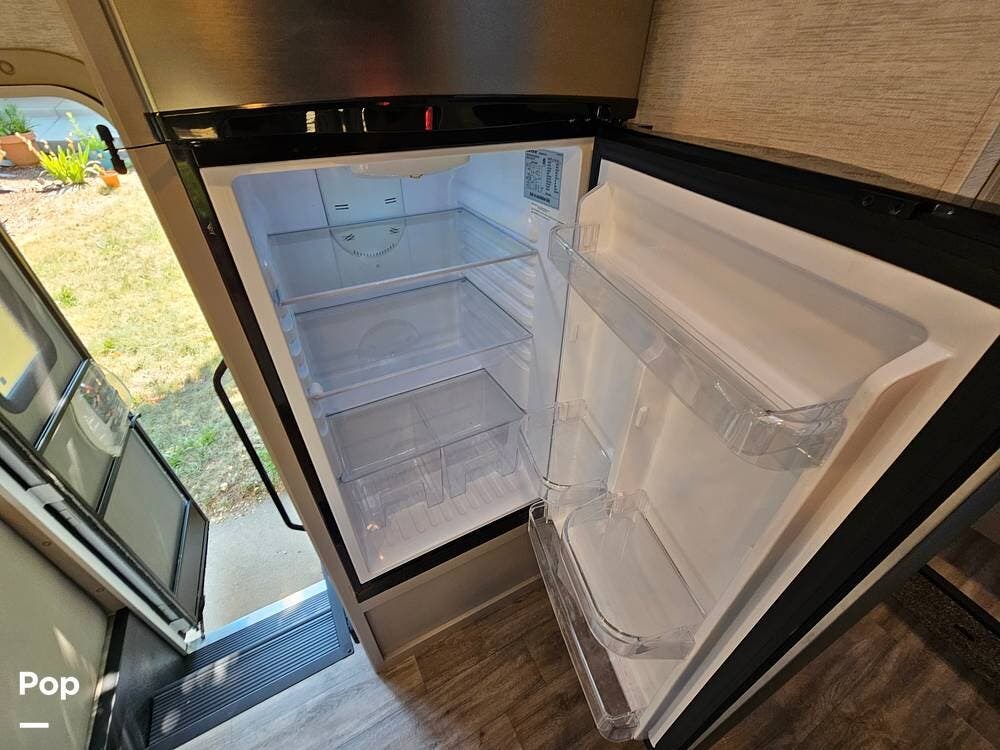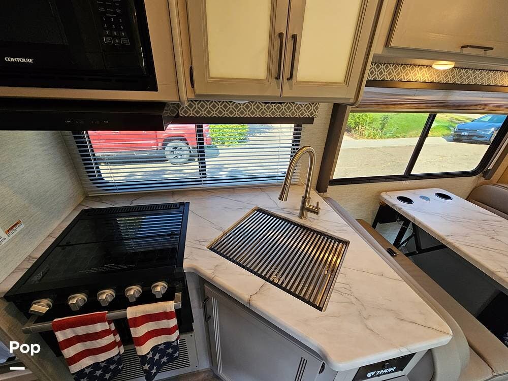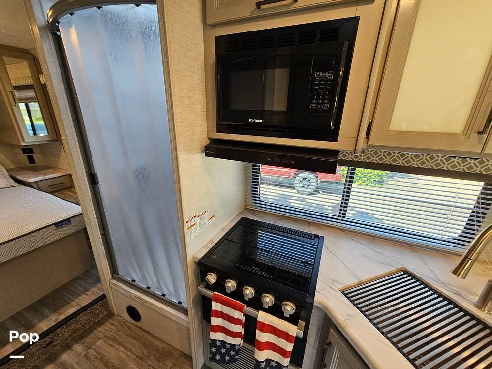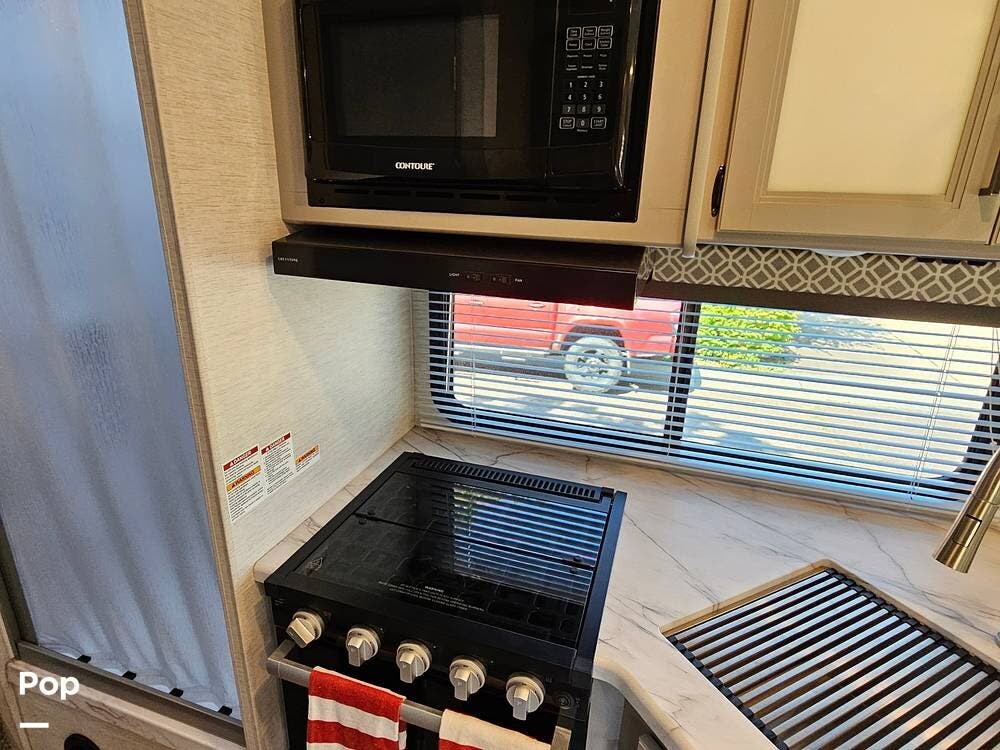 Thoughtful touches like modern cabinetry, LED lighting, and durable residential-style flooring give the interior a warm, upscale feel. The fully equipped kitchen includes a 3-burner gas cooktop, microwave, and a large double-door refrigerator--perfect for making meals on the go.