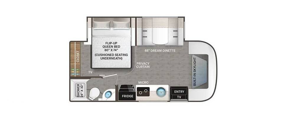 Inside, the layout is designed to make the most of every inch, in the back you will find a comfortable queen bed providing a restful night's sleep after a day of exploring.