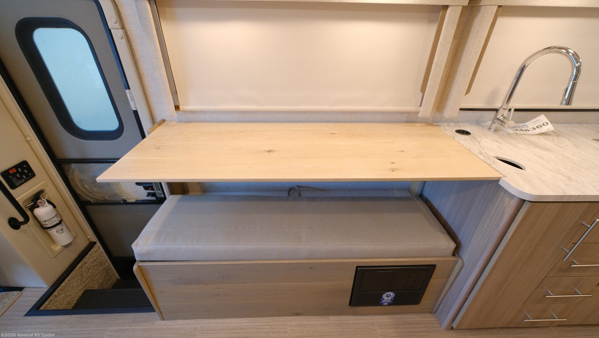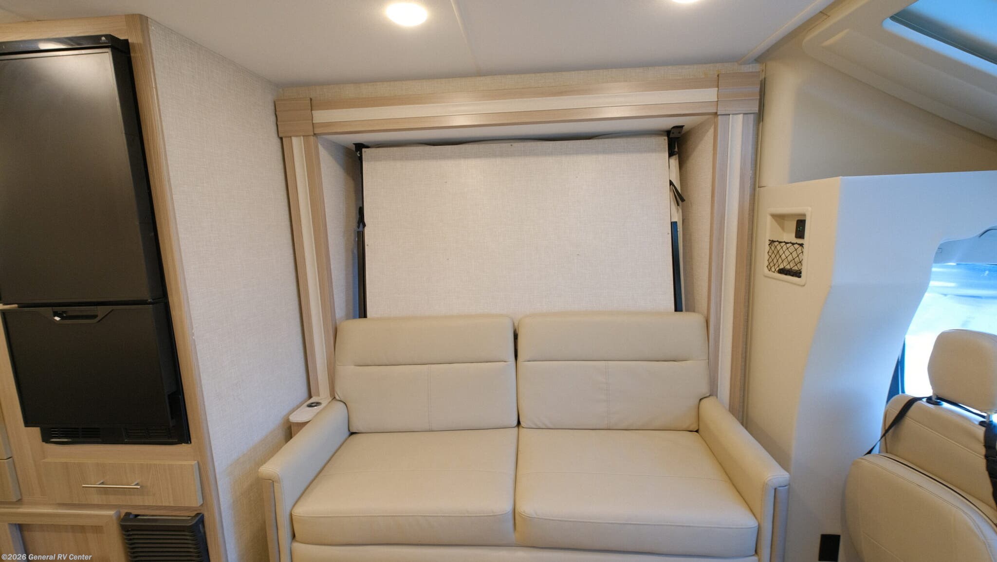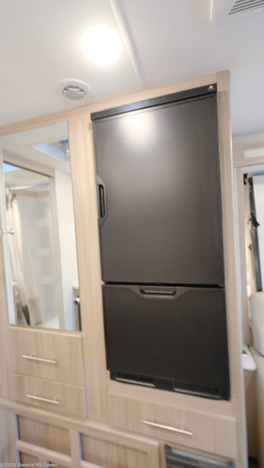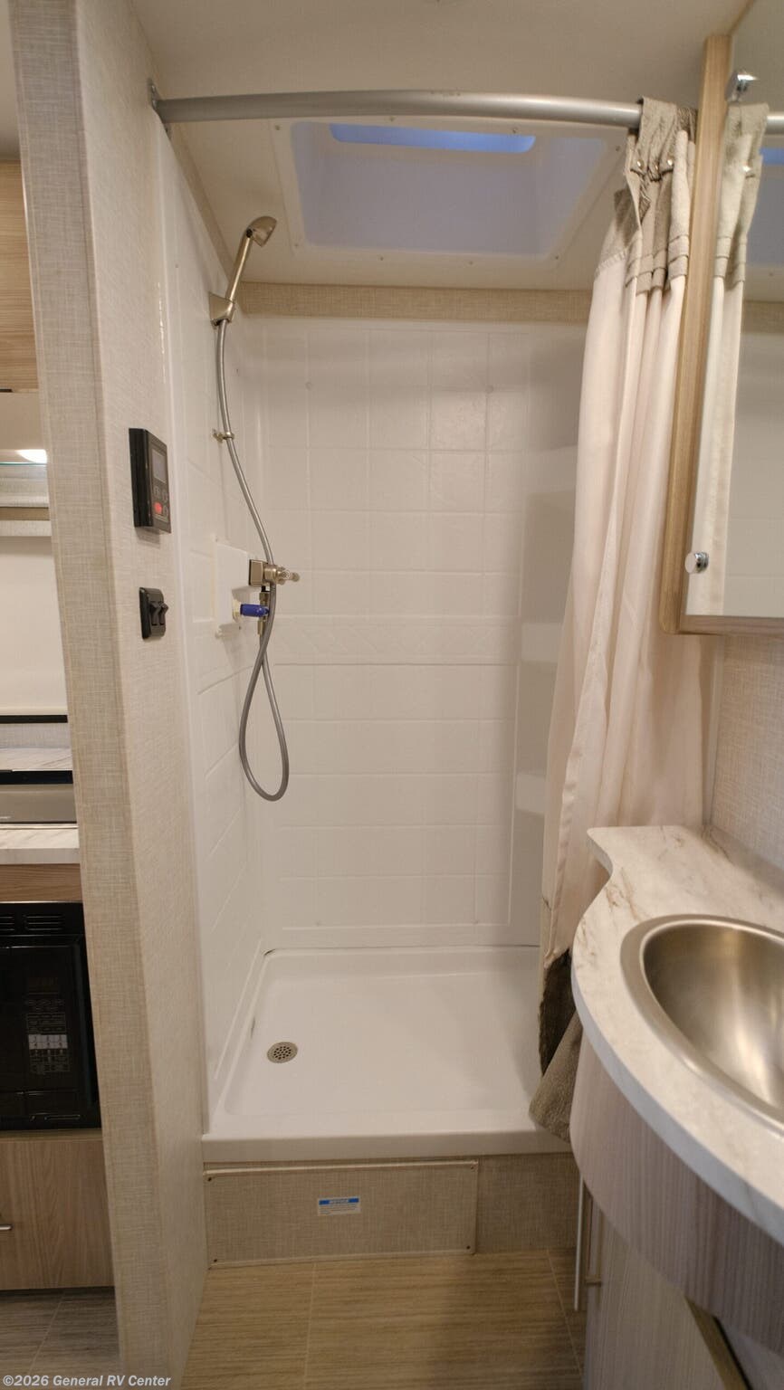 Thor Motor Coach Compass AWD Class B+ gas motorhome 23TE highlights: Murphy Bed Rear Bathroom Built-In Skylight Rapid Camp+ Multiplex System Convection Microwave with Air Fryer You'll have the perfect kitchen workspace in this Compass AWD Class B+ gas motorhome so that you can create plenty of home-cooked meals! There are pressed laminate countertops, a two-burner gas cooktop, task lighting above the cooktop, a convection microwave oven with an air fryer, a waste basket, and a ceiling vent. Because of the residential vinyl flooring, you'll have an easy time cleaning up after having guests over, and the wireless phone charger with USB plug next to the 39" retractable TV will get lots of use throughout your trips. The single slide holds the sofa with a pedestal table, and you can turn this sofa into a Murphy bed at night for a comfortable sleeping area. The Thor Motor Coach Compass AWD Class B+ gas motorhome is small but mighty! It includes all-wheel drive, and it is built upon a Ford Transit chassis, 3.5L V6 Eco Boost turbo gas engine, and Ford ten-speed automatic overdrive transmission. The Ford safety features provide excellent care while driving, and you can stay connected to your Compass AWD with the FordPass Connect. The power patio awning with LED lights can be moved out into position with just one touch on your cell phone thanks to the Rapid Camp+ multiplex control system. You will have a 100W solar panel with controller, a 15,000 BTU air conditioner, a Winegard ConnecT 2.0 Wi-Fi/4G/TV antenna, and a tankless water heater as some of the top electrical and plumbing features.