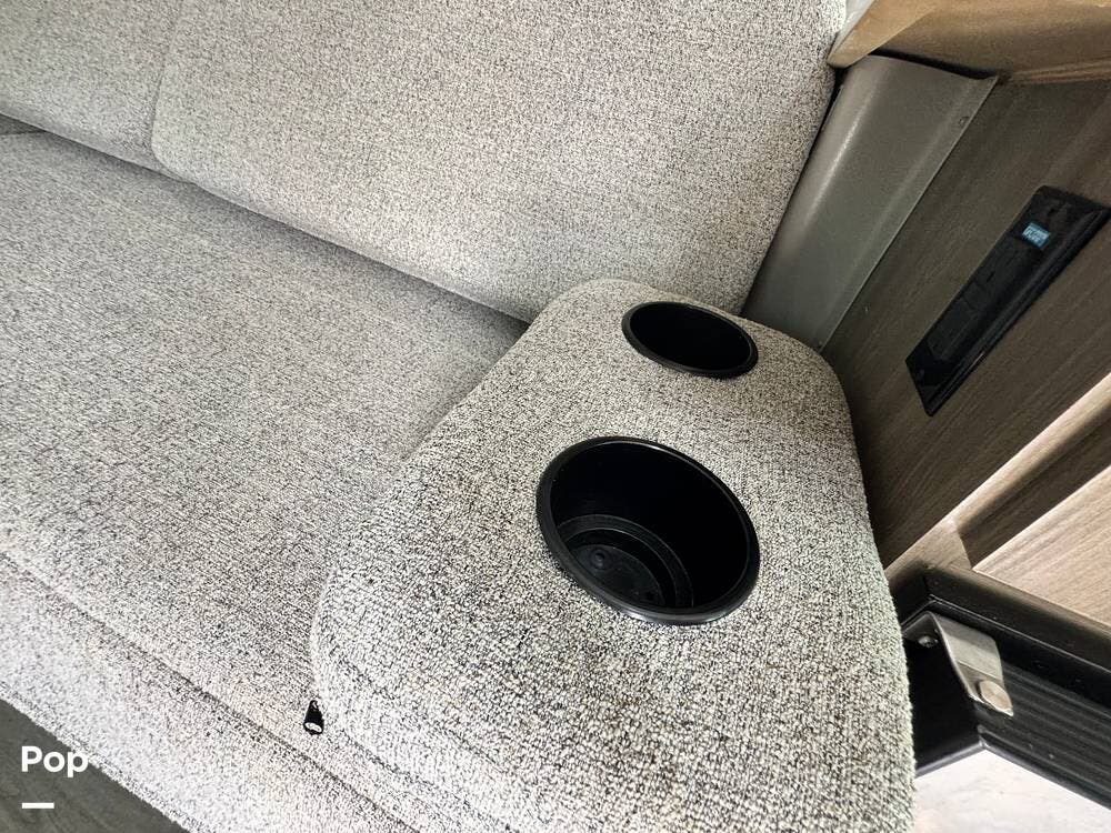 The kitchen is equipped with a two-burner stove, a convection microwave/air fryer, and a compact fridge/freezer. There are cabinets, flip-up, and removable tables. The captain's chairs swivel for additional seating.
