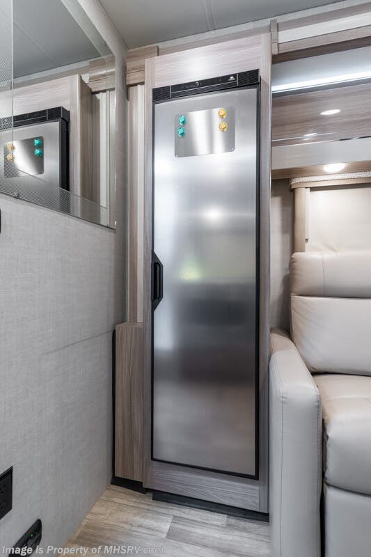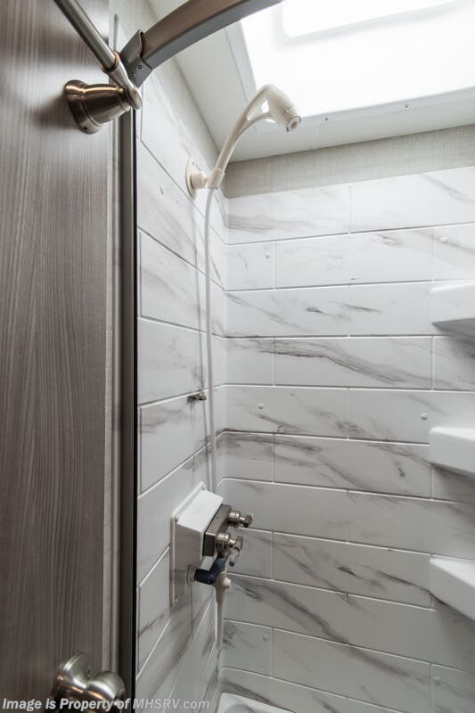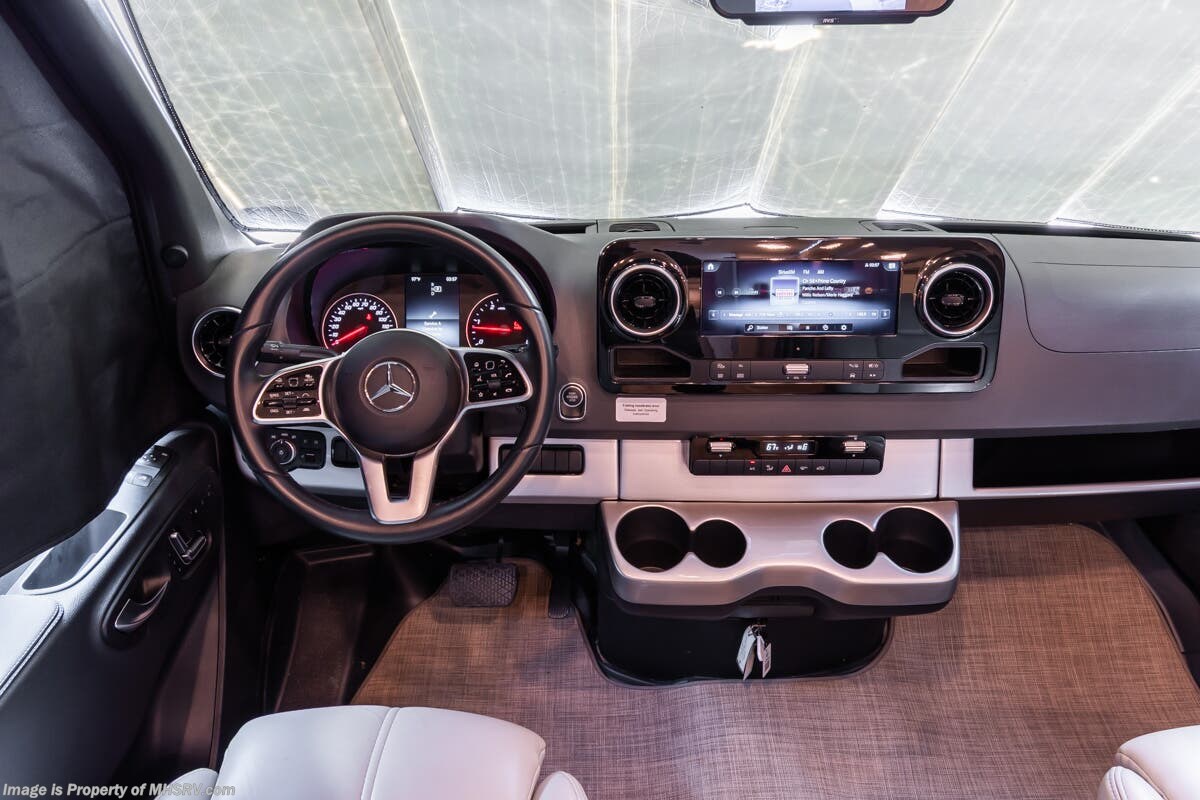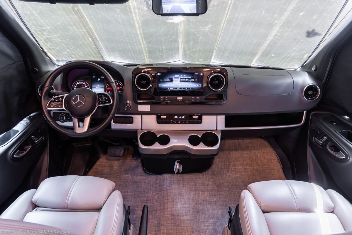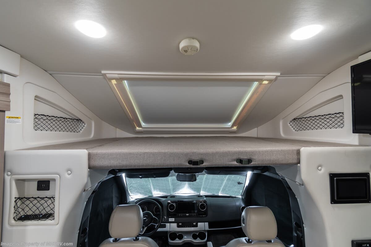More About This RV This RV features aluminum wheels, full body paint, hydraulic jacks, diesel generator, Mercedes-Benz diesel engine, Mercedes-Benz chassis, tilt/telescoping steering wheel, power pedals, GPS, patio awning, LED running lights, black tank flush, water filtration system, exterior shower, solar, inverter, leather seating, 7 foot ceiling, dual pane windows, multi-plex control panel, hardwood cabinets, convection microwave, overhead loft and much more