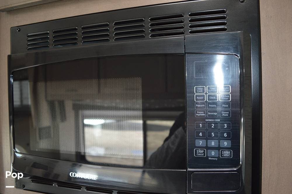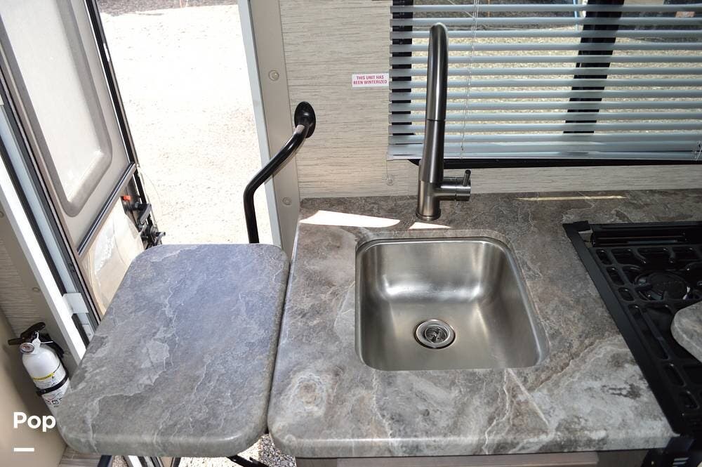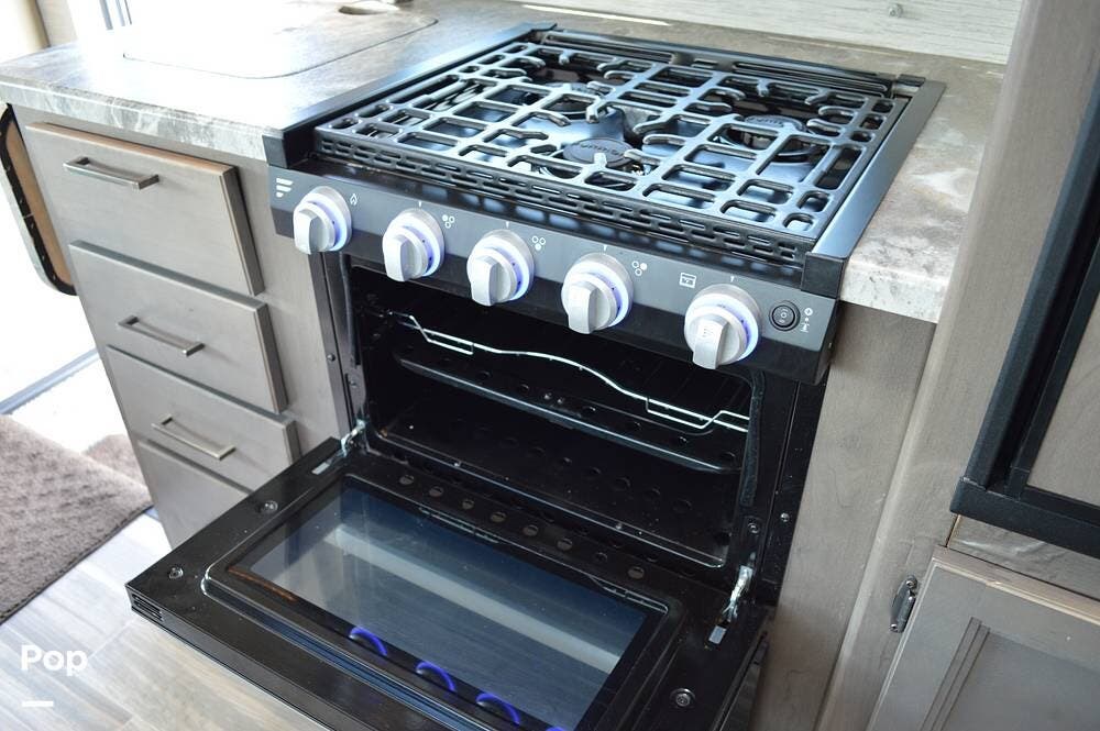 Among the many interior features, you'll find a fully equipped kitchen, including a microwave, 3-burner cooktop, oven, large single tub sink, and a flip-up counter extension.