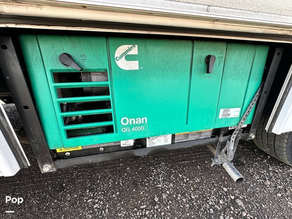 The exterior features include a 15-foot awning, a rear-side accessible storage compartment, an Onan 4.0kW generator, and rooftop solar prep.