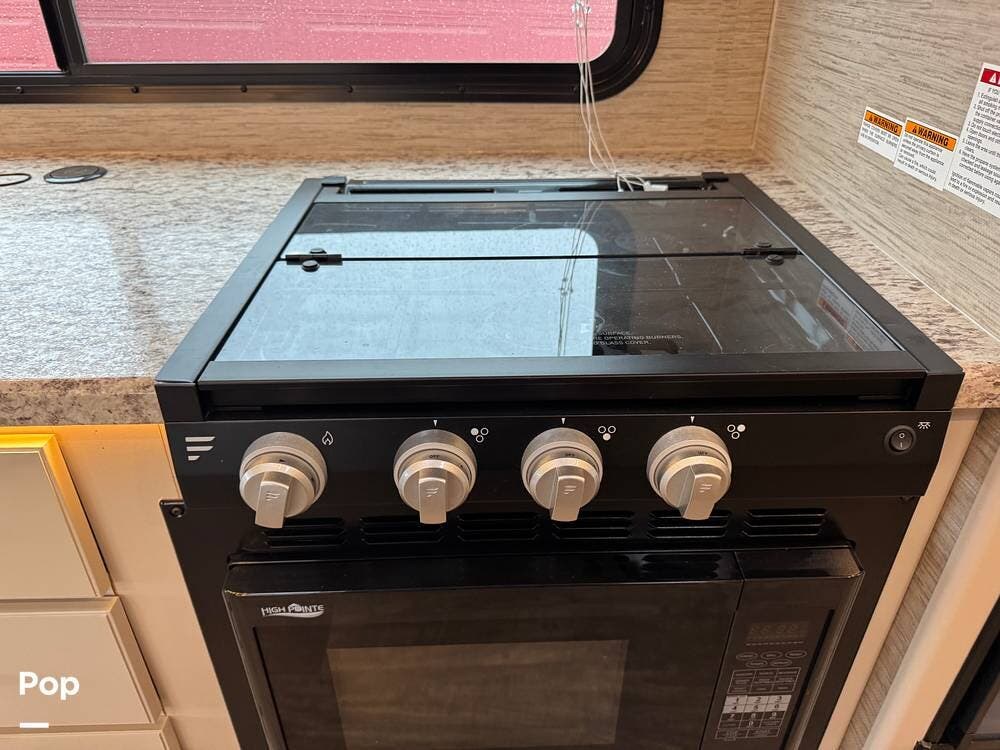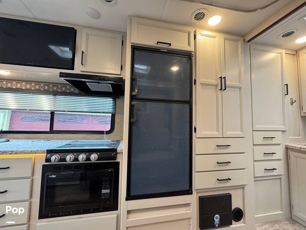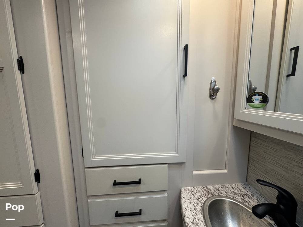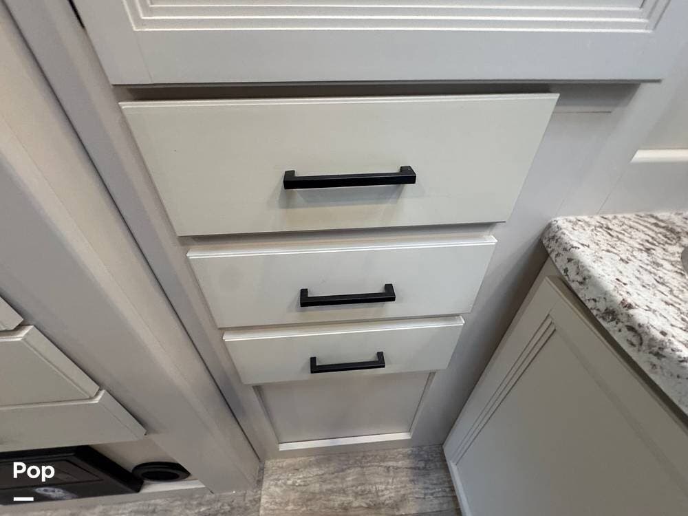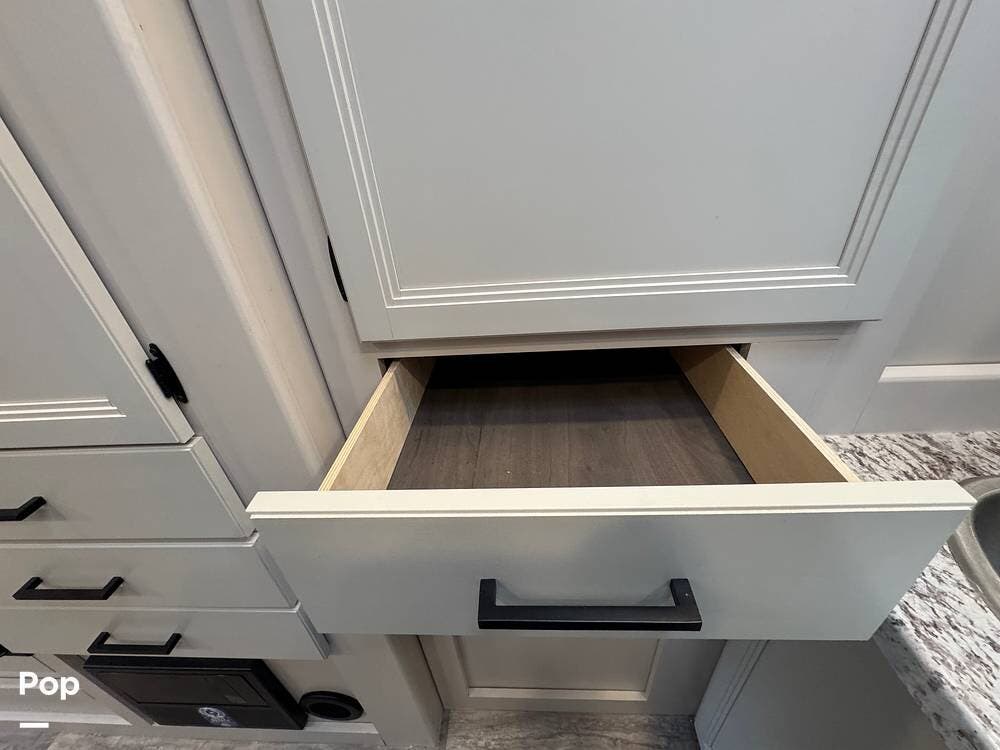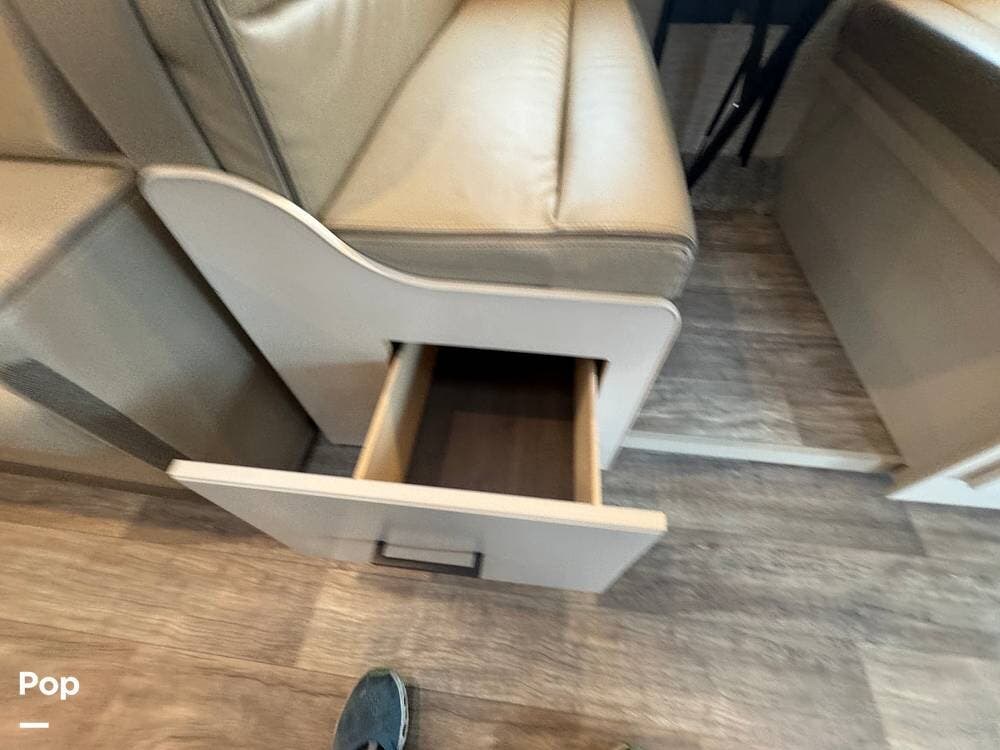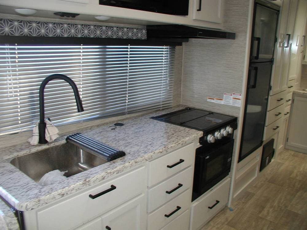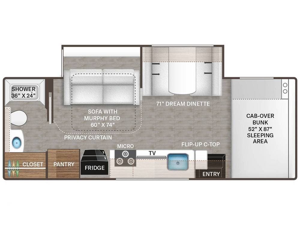 Living and sleeping areas are flexible and comfortable. A cab-over bunk offers additional sleeping space, while the dream dinette and queen Murphy bed provide adaptable seating and rest areas during the day and night.