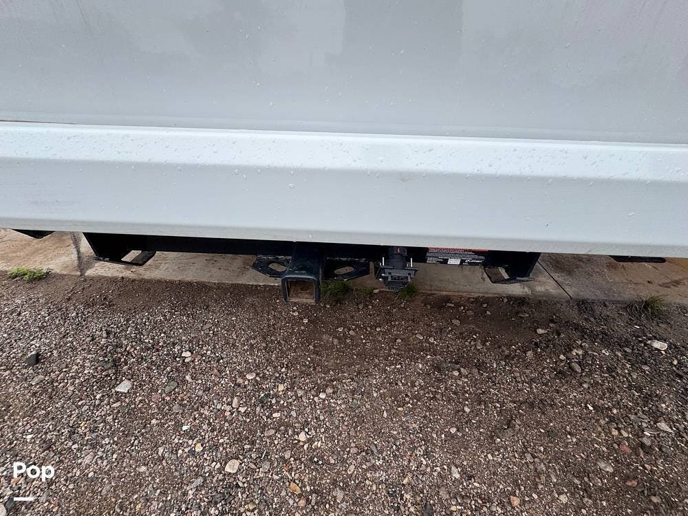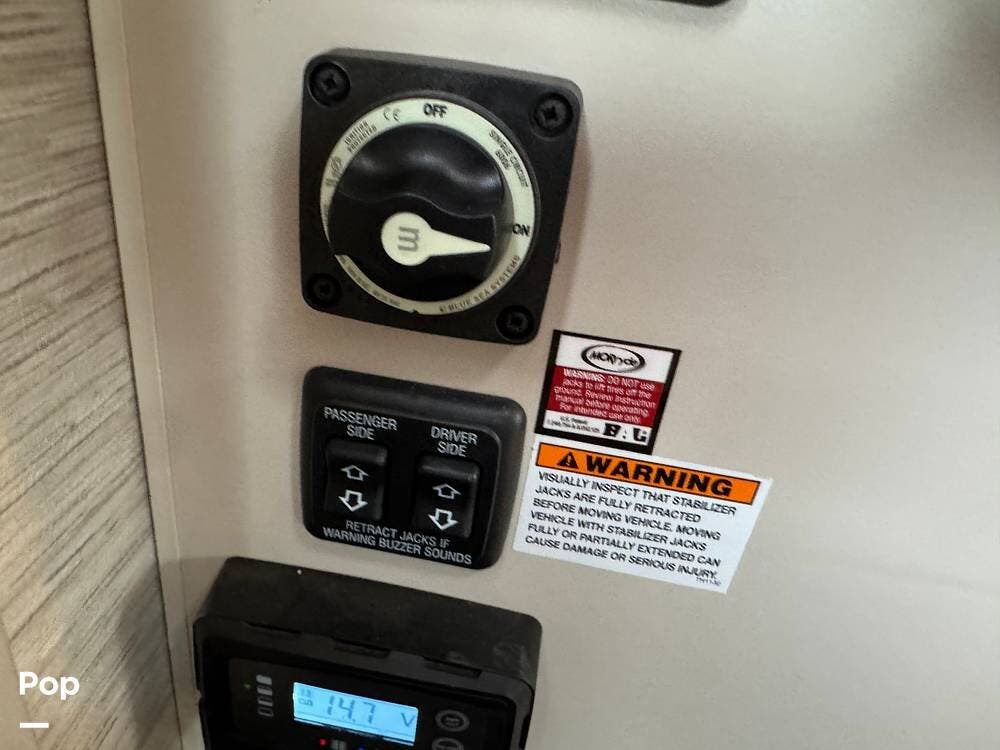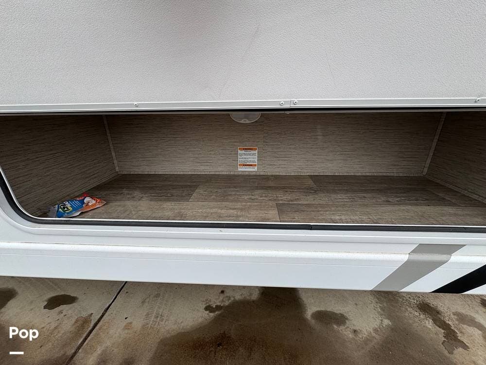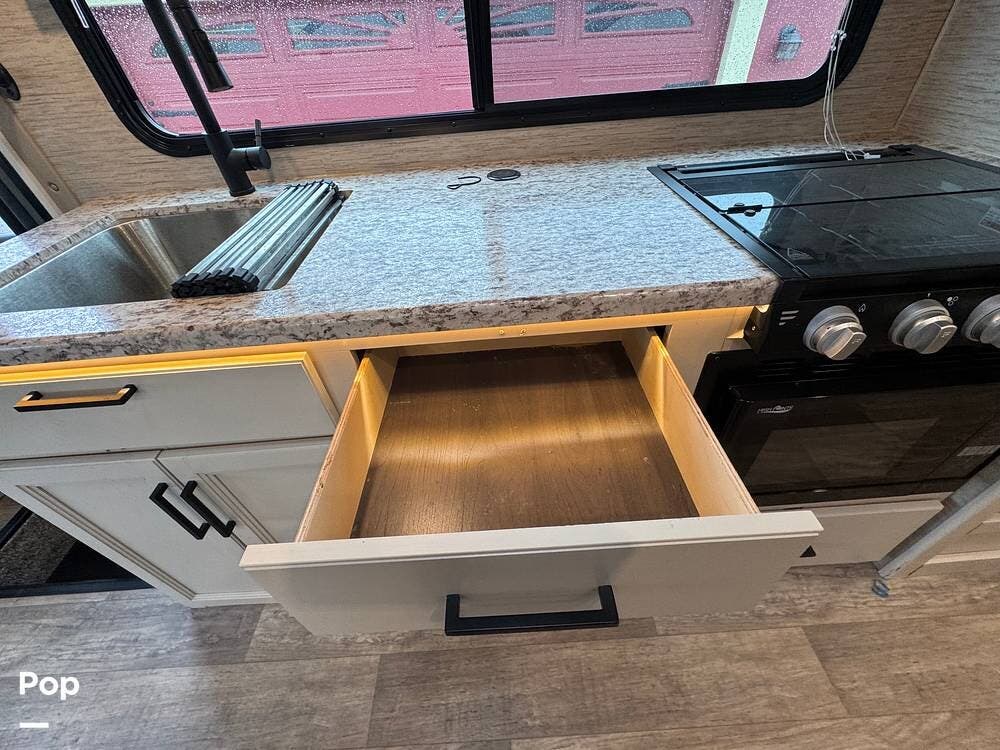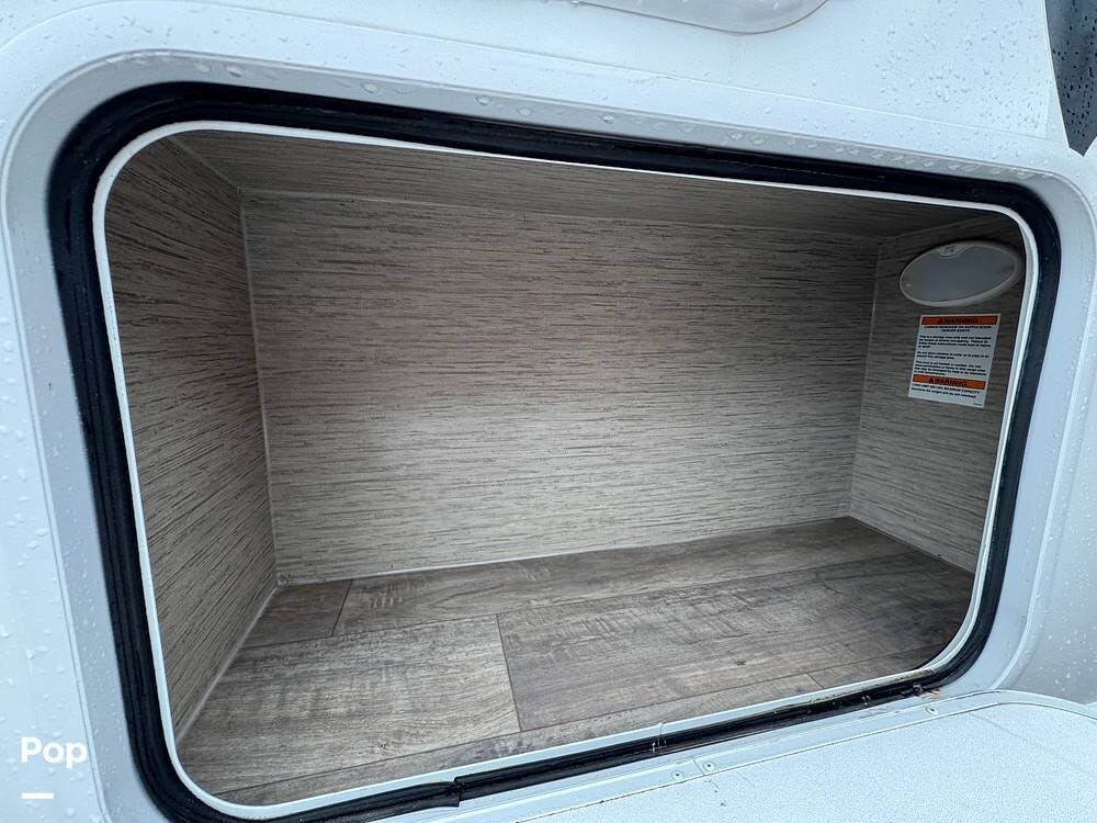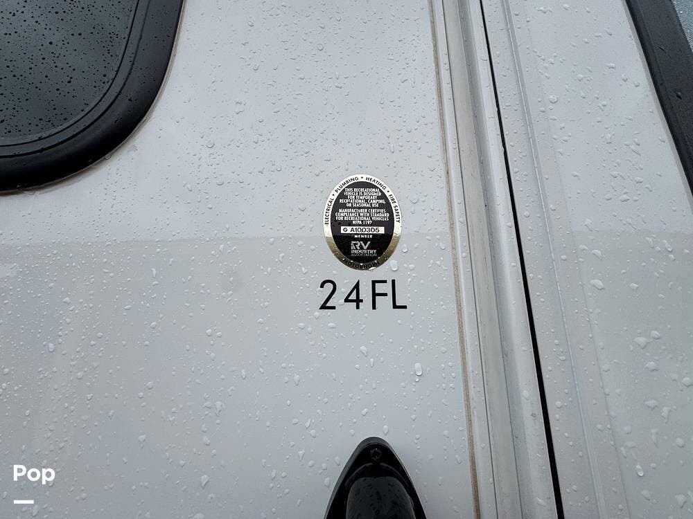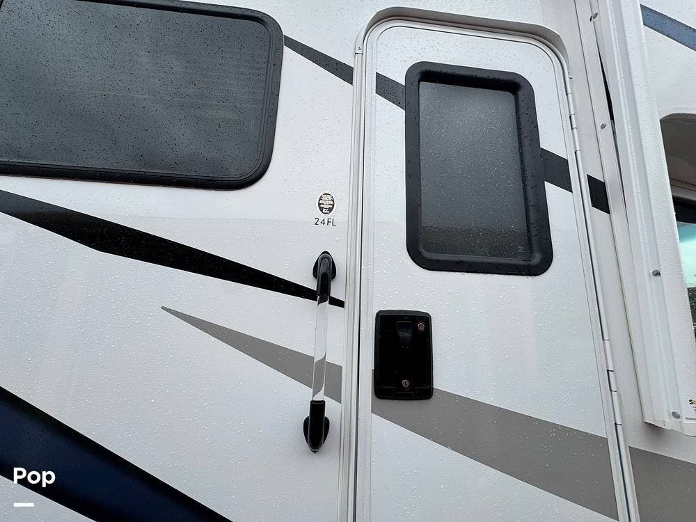 From the outside, the 24FL presents a modern profile with clean graphics and a one-piece fiberglass front cap. Its exterior gears toward practicality and convenience: a power patio awning with integrated LED lighting extends your living space outdoors, while MEGA-Storage compartments provide ample room for camping gear and travel essentials.